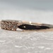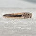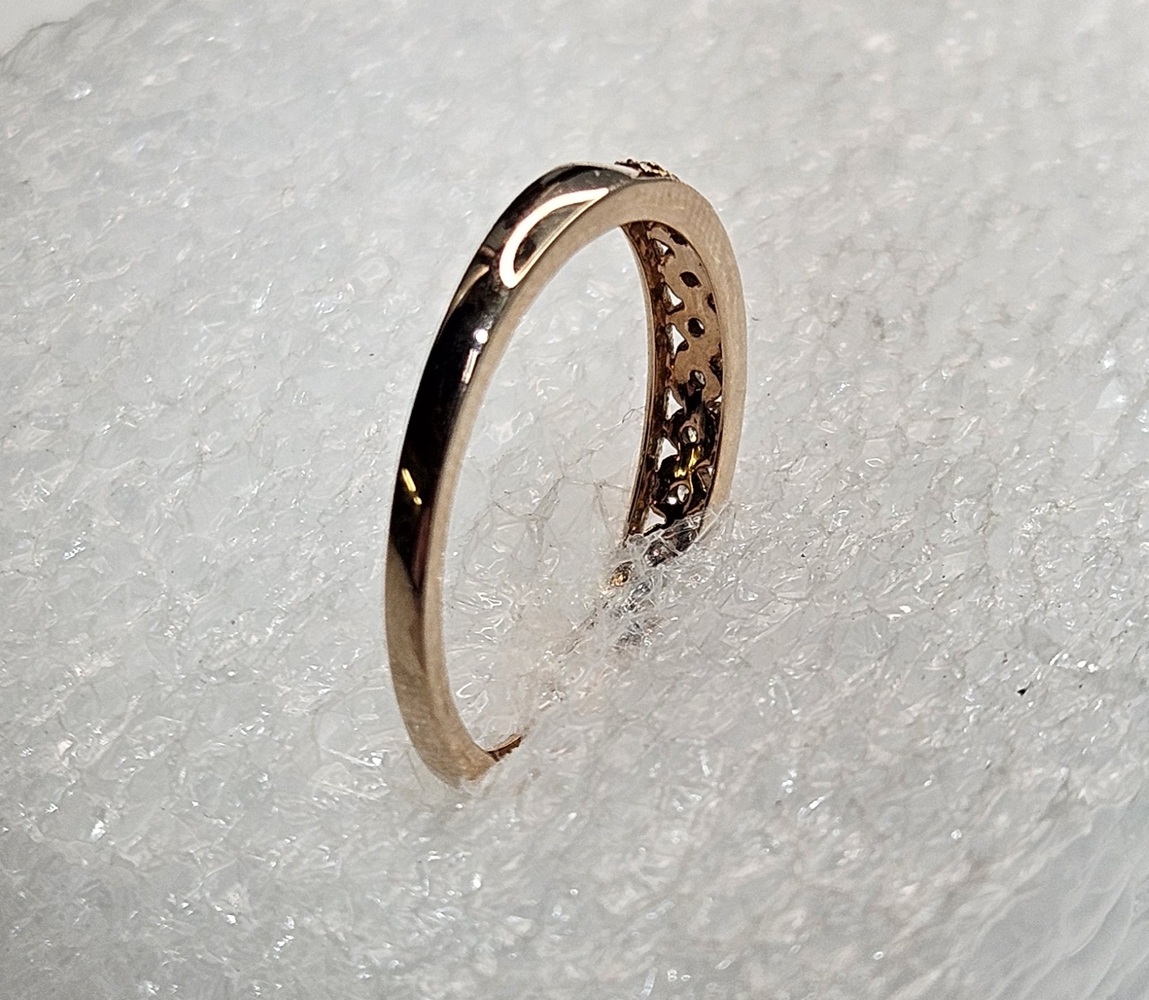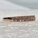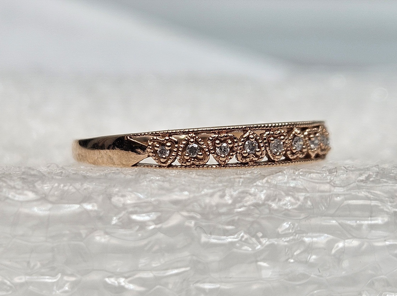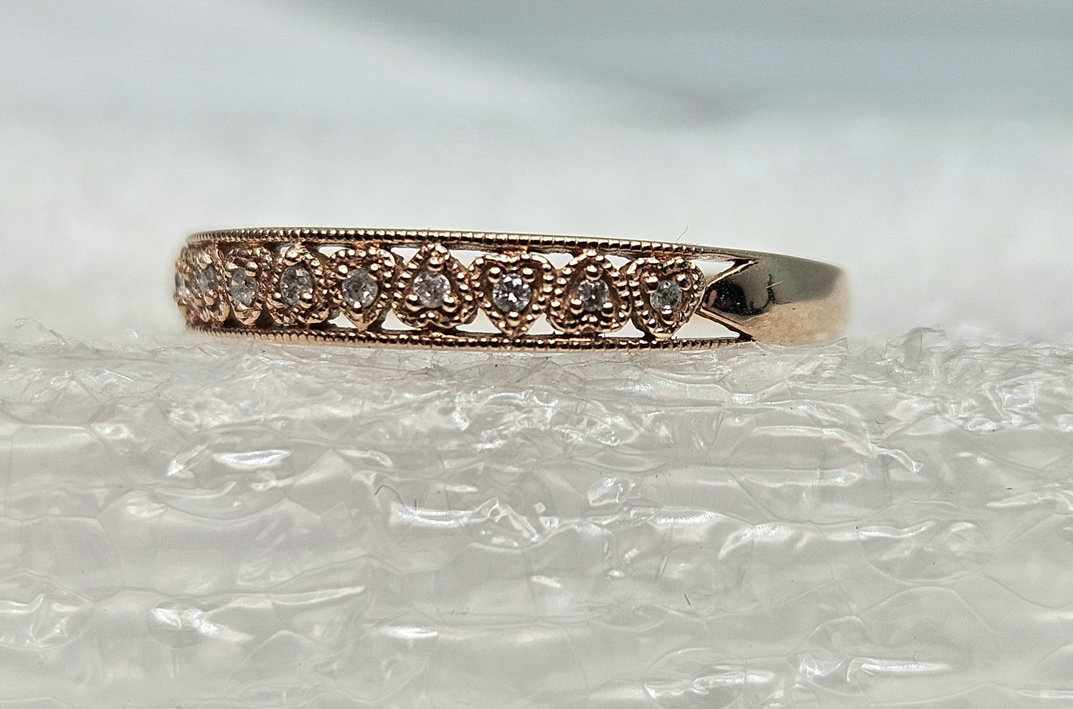 This Radiant 10kt Rose Gold Ring boasts a captivating band design adorned with dainty heart accents. Each heart is meticulously embedded with clear round stones, lending a hint of sparkle. A perfect blend of elegance and charm.