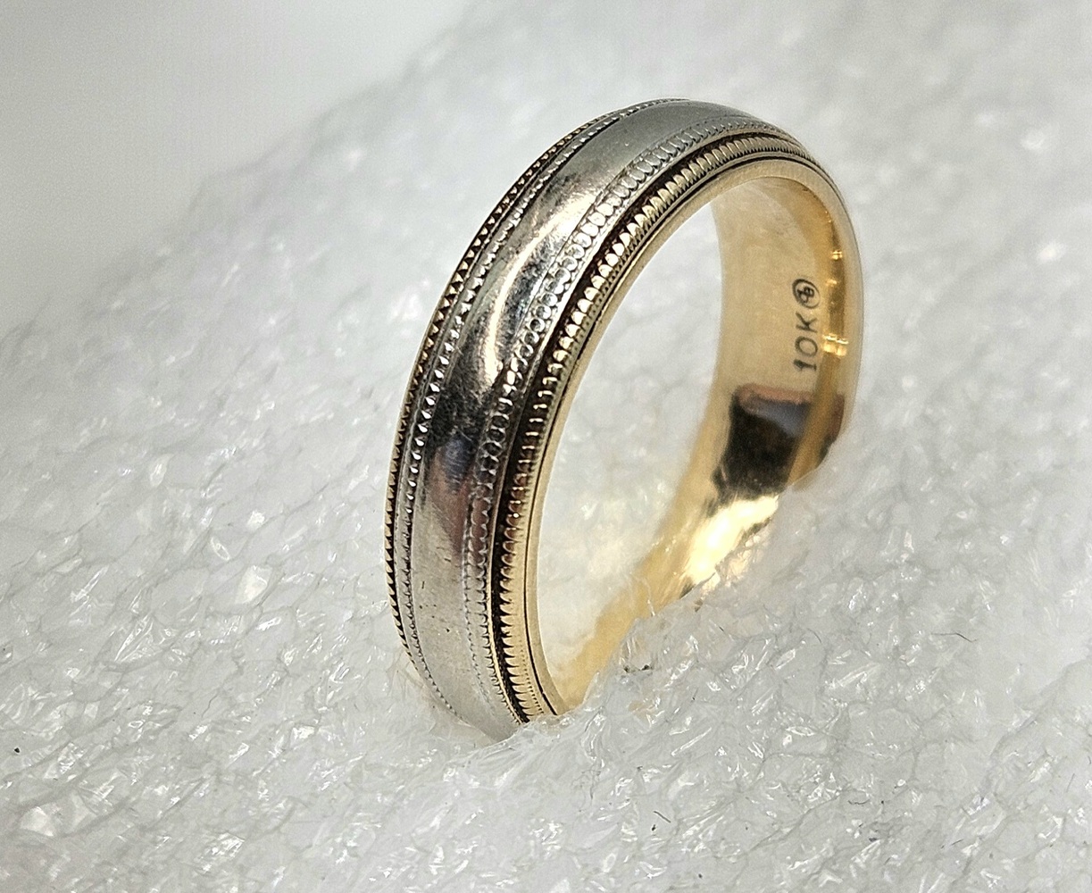 This 10k two-tone band combines white and yellow gold, offering a timeless design that fuses tradition and versatility, perfect for any style or occasion.