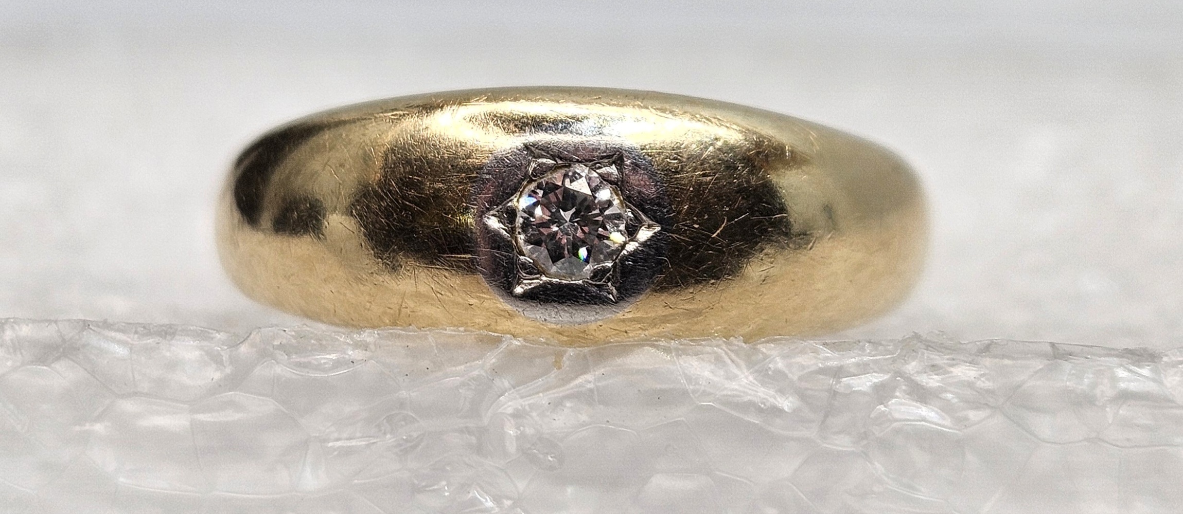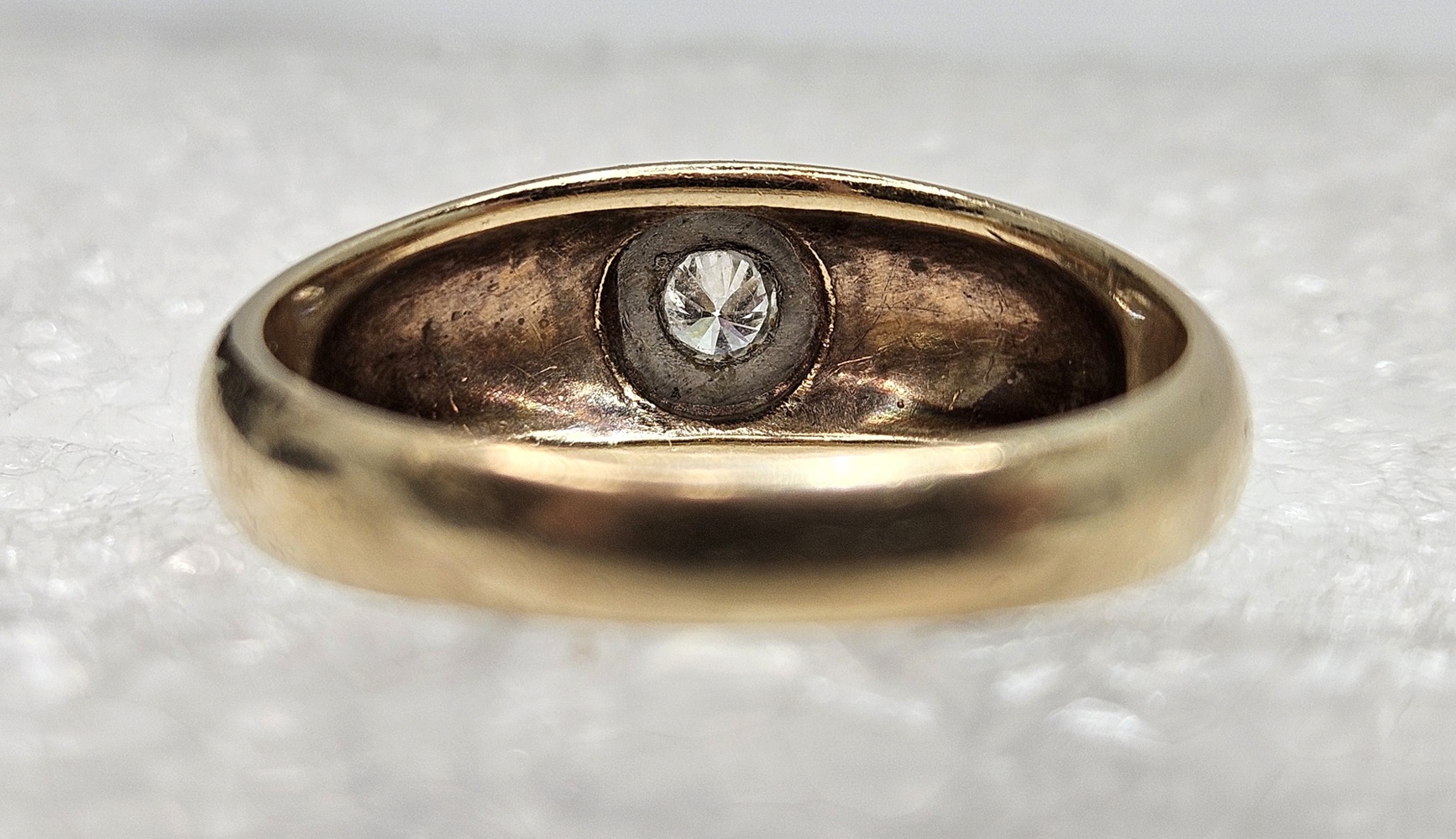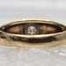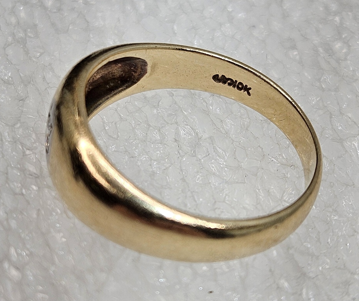A 10k yellow gold band featuring a singular small round diamond centrally placed, offering simplicity and elegance in a delicate, timeless design.