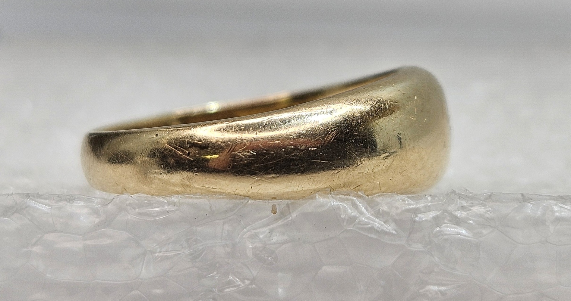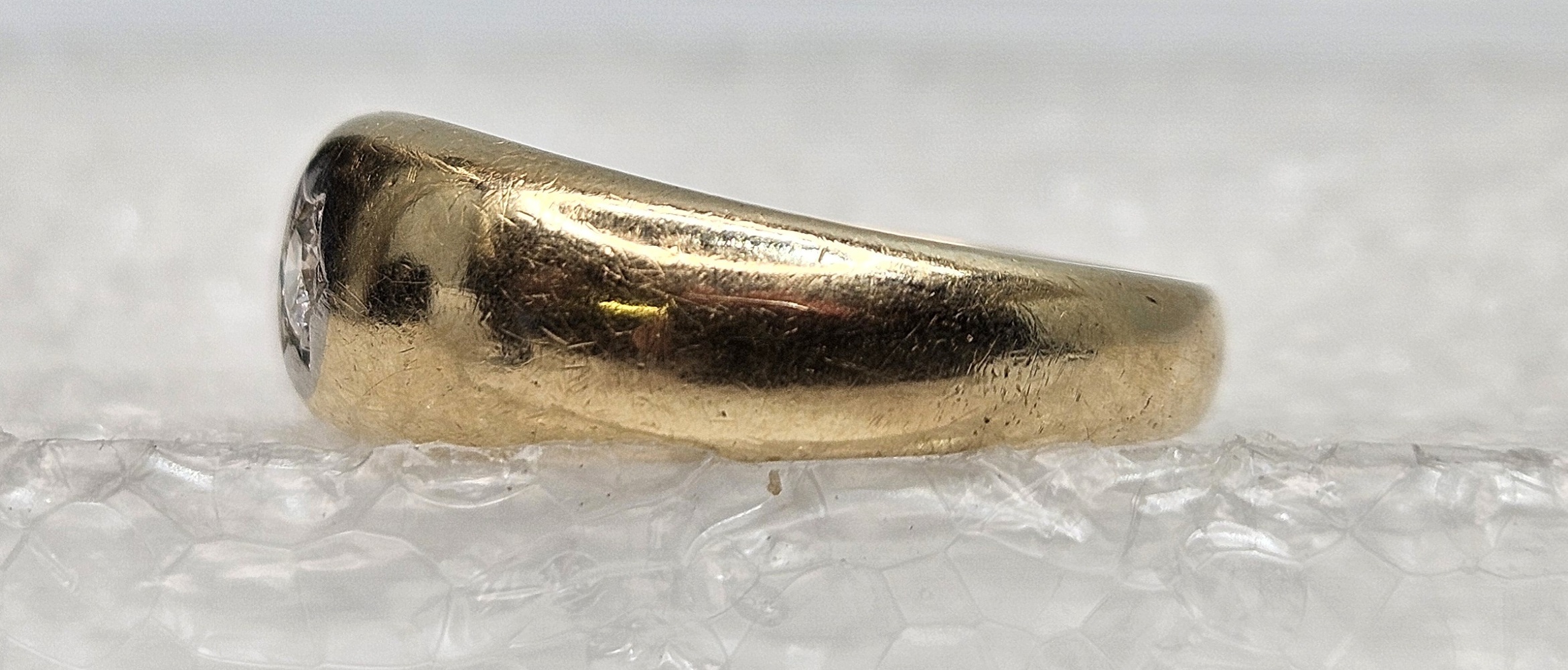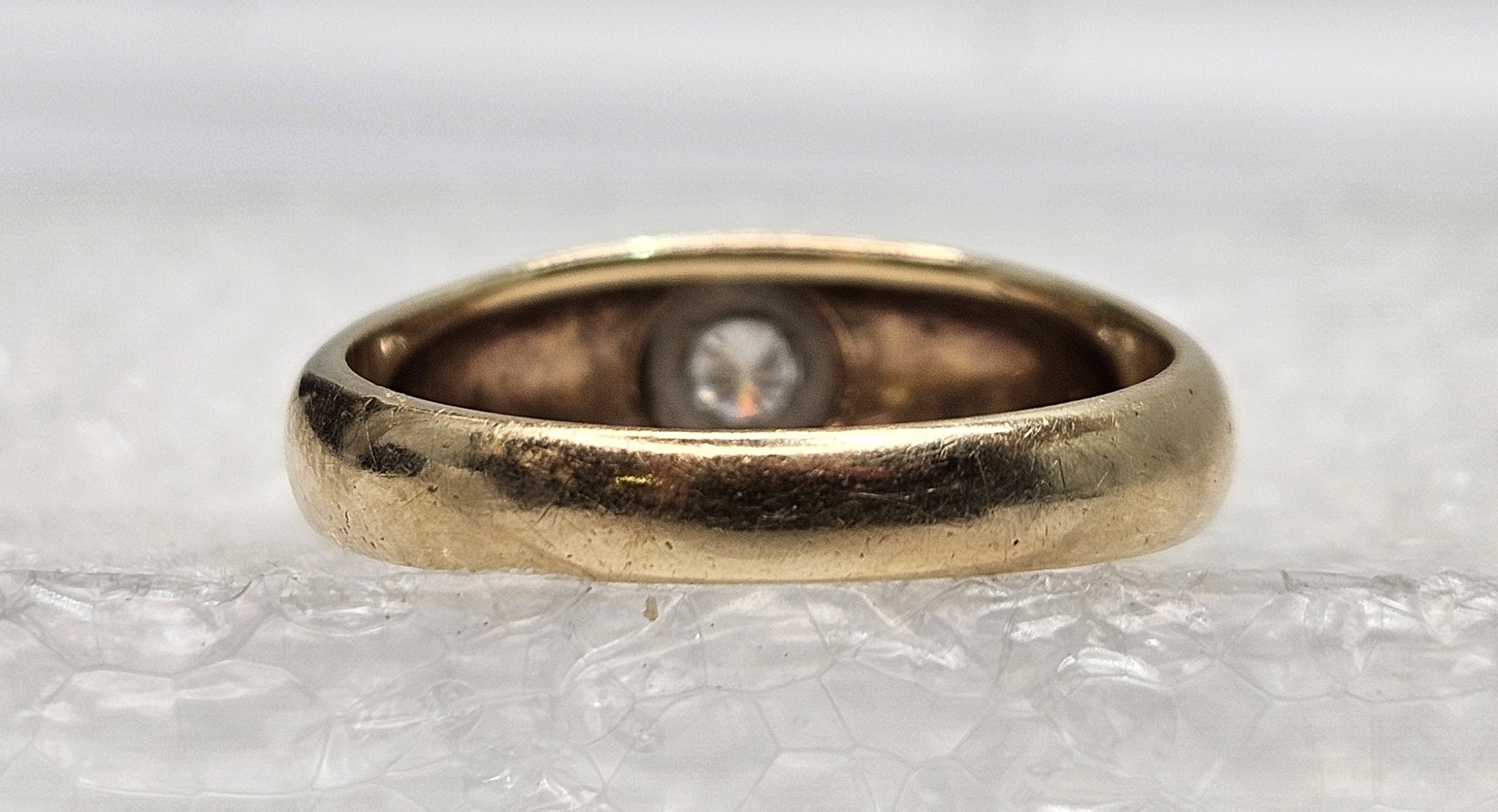 A 10k yellow gold band featuring a singular small round diamond centrally placed, offering simplicity and elegance in a delicate, timeless design.