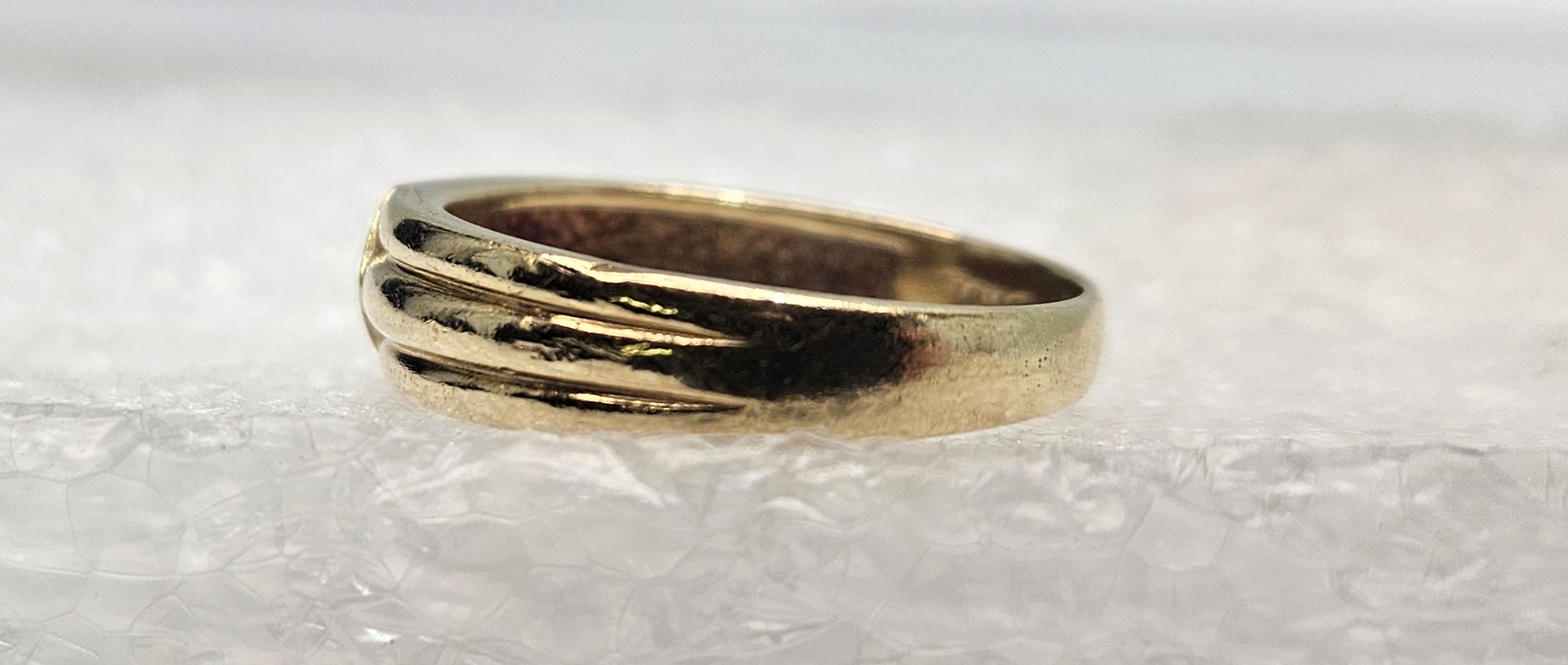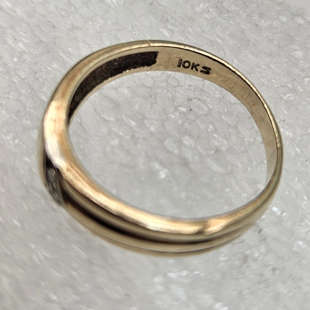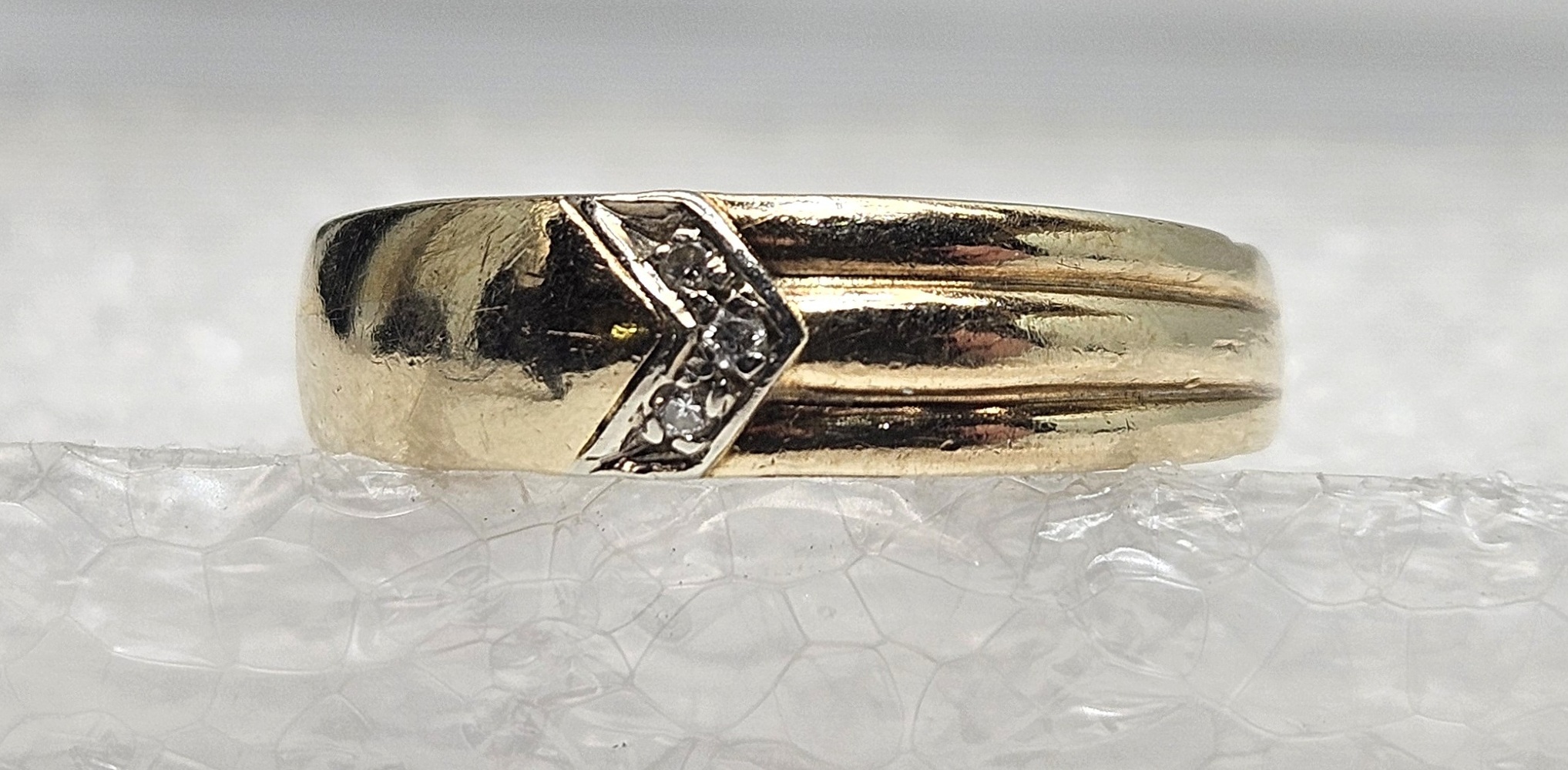 A coveted treasure of timeless charm - this 10 karat yellow gold band embraces a subtle elegance. Bedazzled with a trio of luminescent diamonds artfully arranged in an arrow shape on the front, it is a rich testament to delicate artistry and enduring love. Undeniably a piece of celestial beauty!