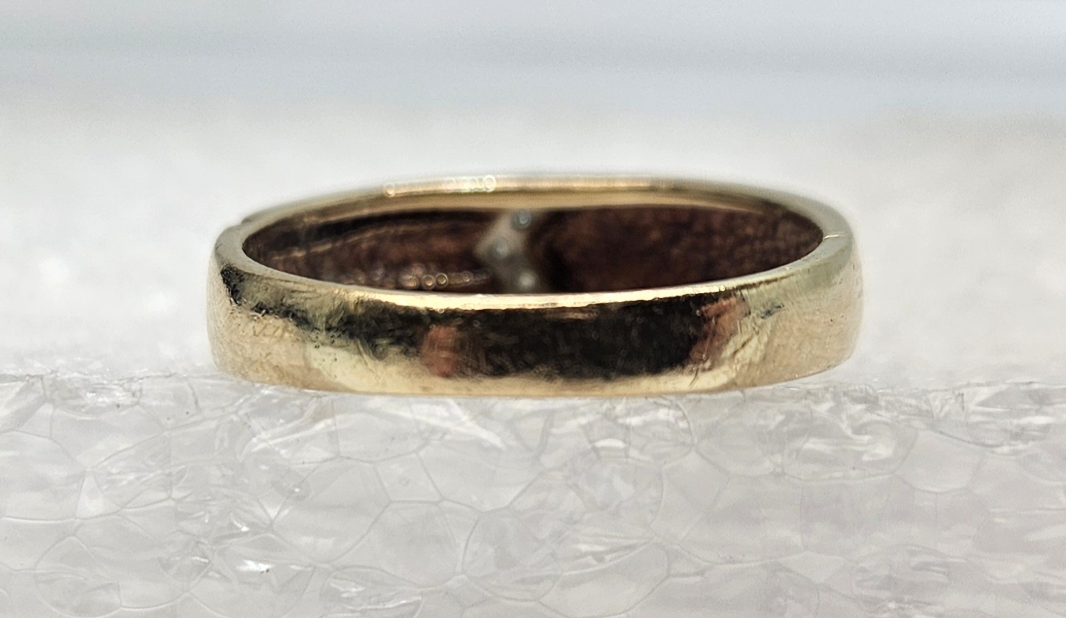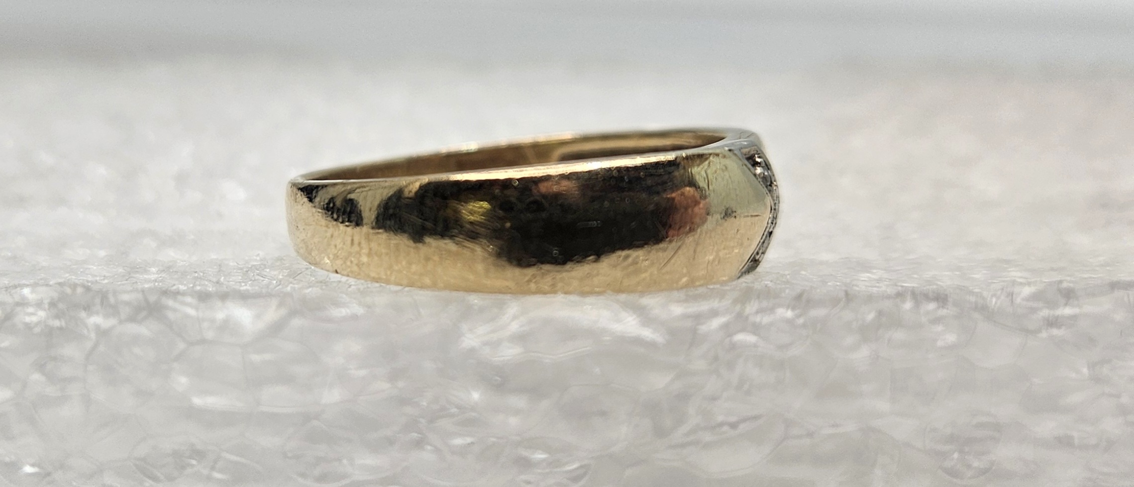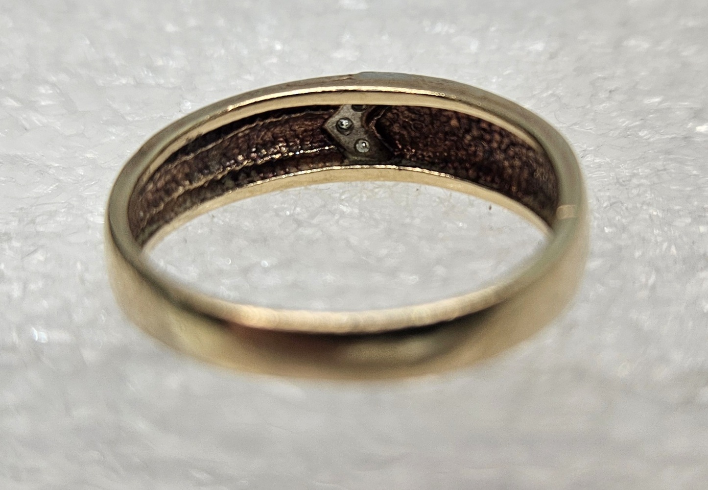 A coveted treasure of timeless charm - this 10 karat yellow gold band embraces a subtle elegance. Bedazzled with a trio of luminescent diamonds artfully arranged in an arrow shape on the front, it is a rich testament to delicate artistry and enduring love. Undeniably a piece of celestial beauty!