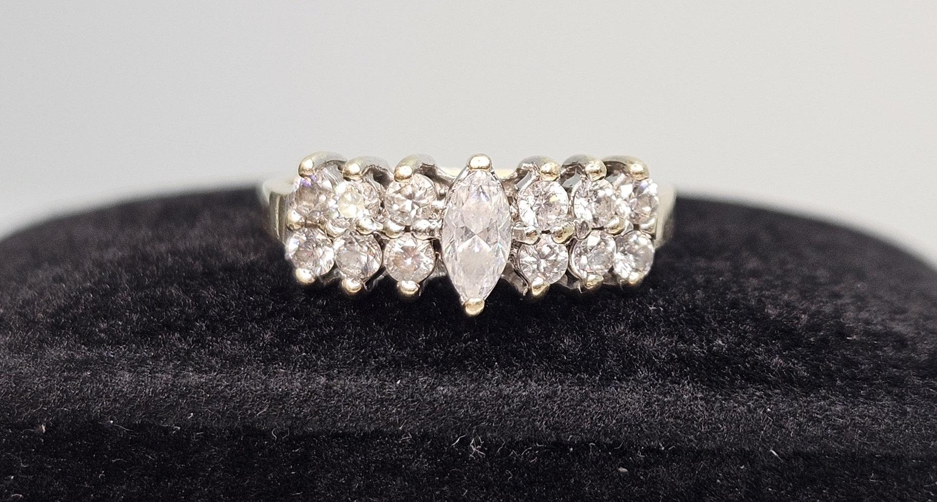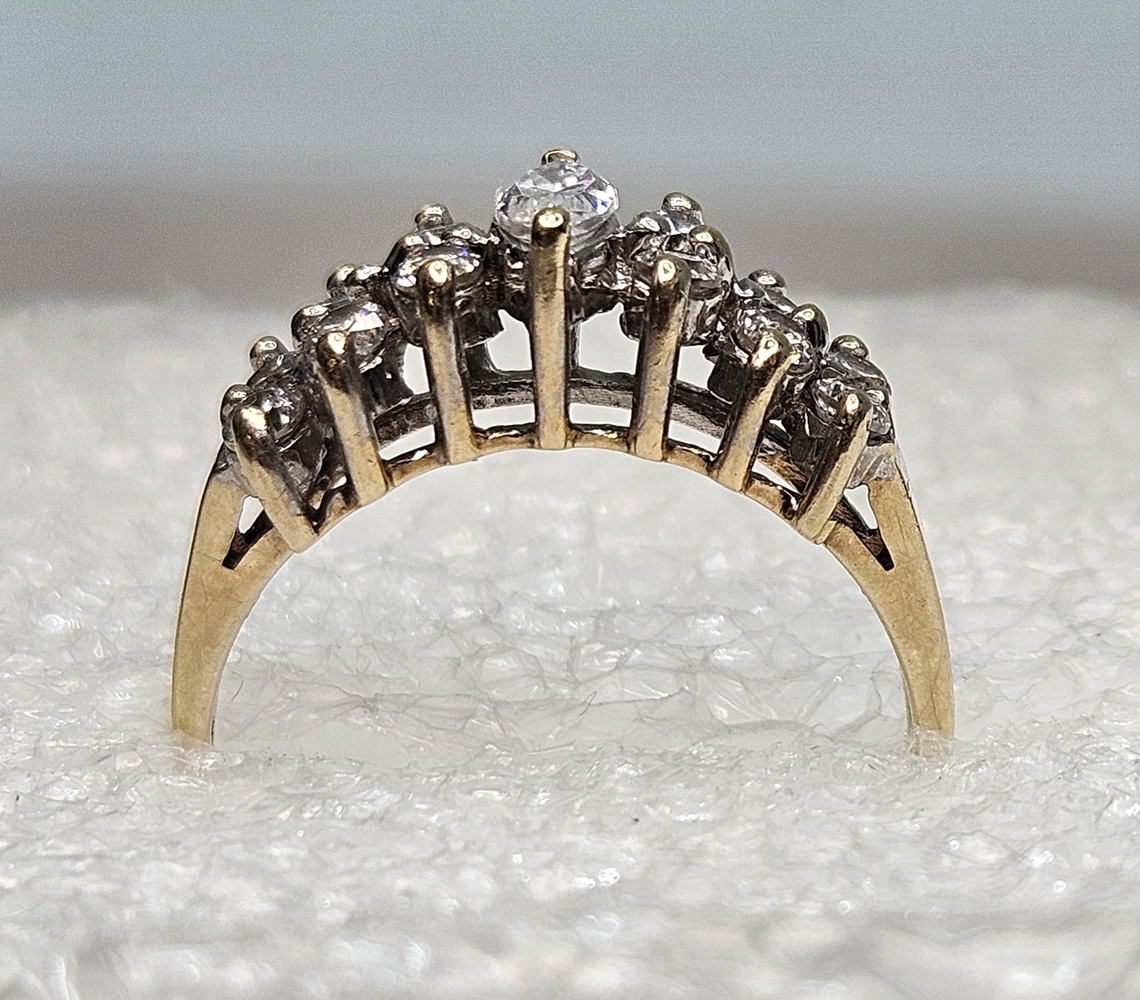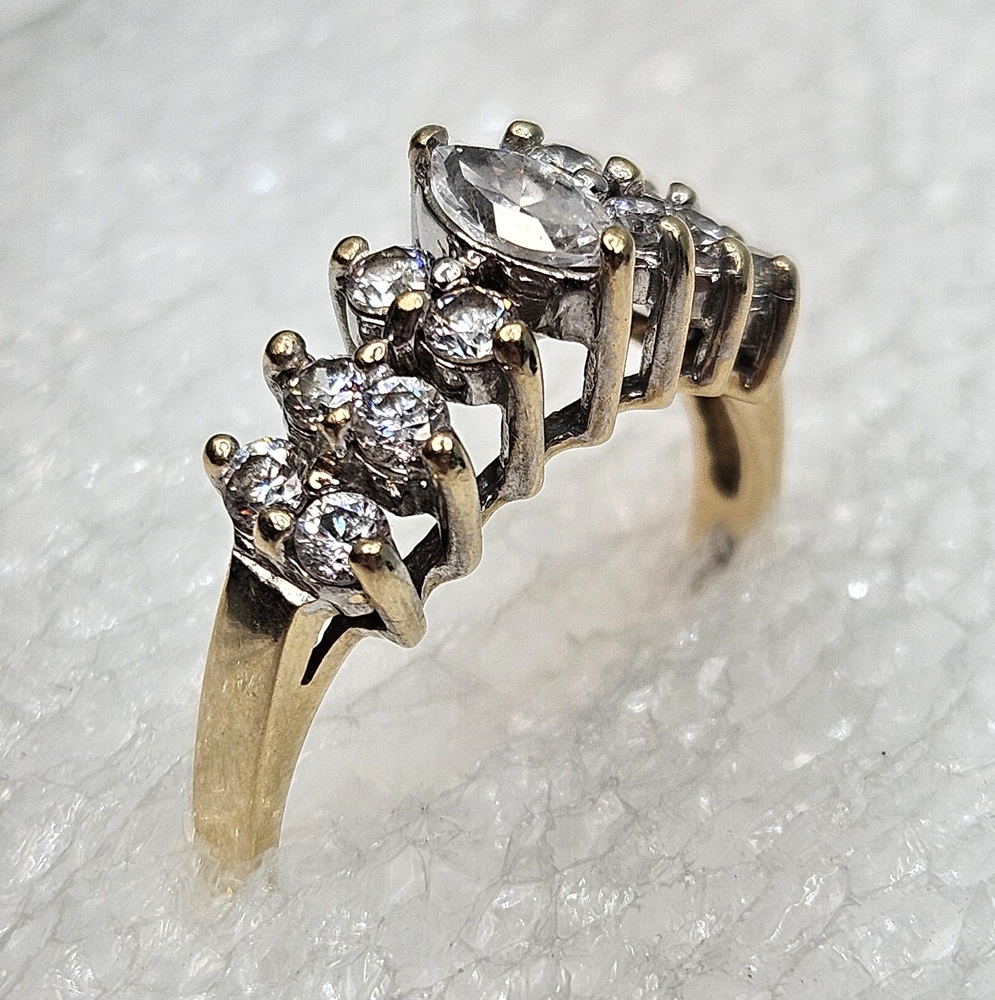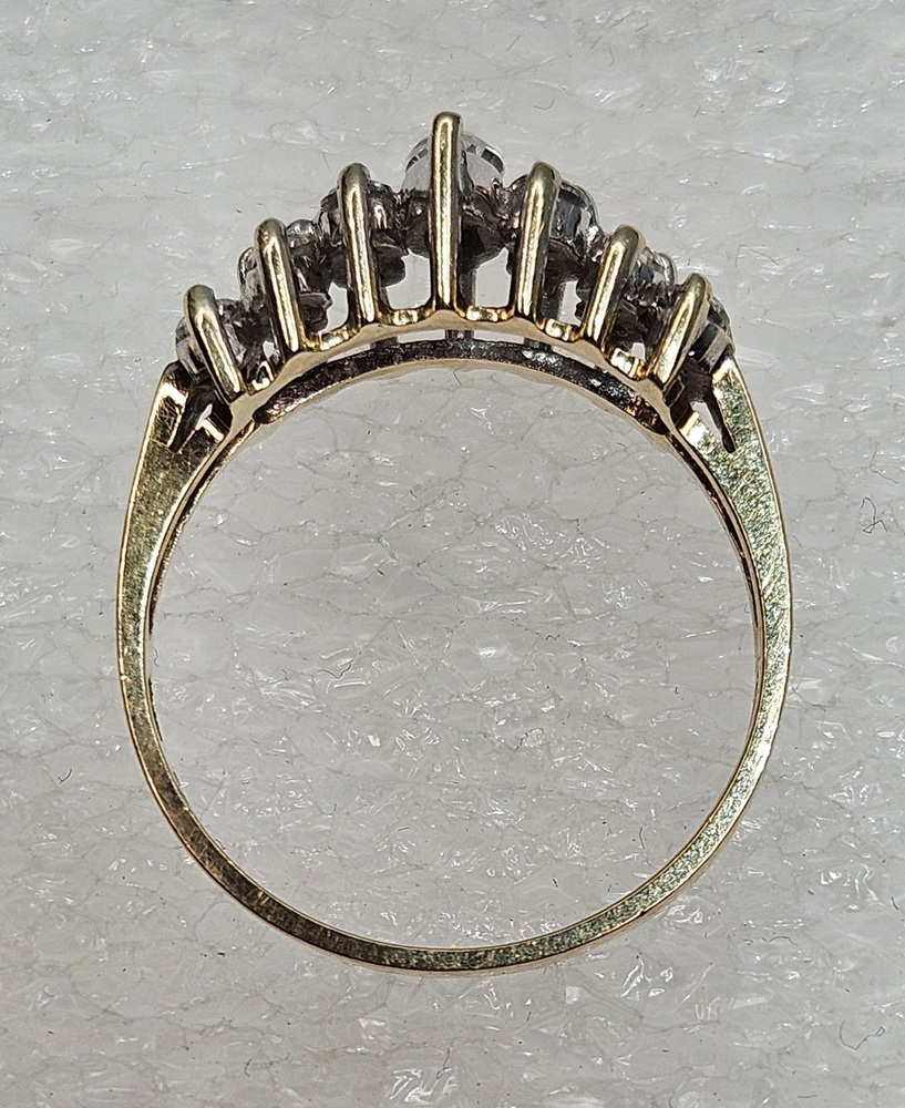 Adorn your fingers with this 10k yellow gold ring, luxuriously spotlighting marquise-cut clear stones set in a noble cluster. The ring captures timeless elegance, exhibiting radiant sophistication to elevate any outfit.