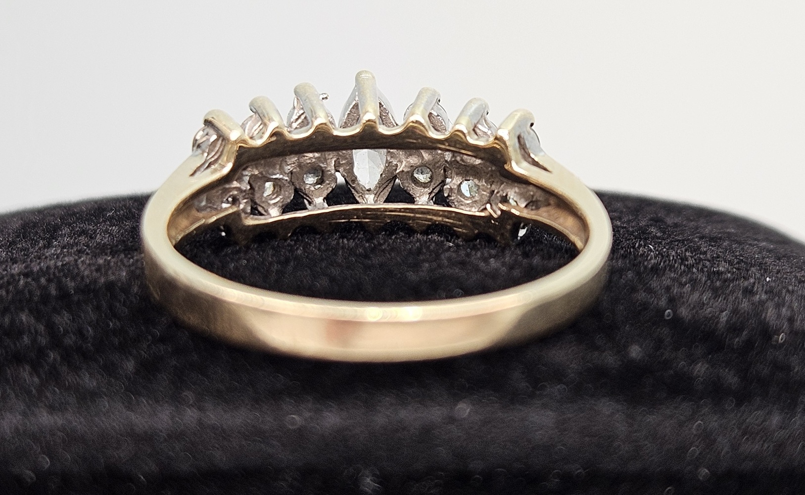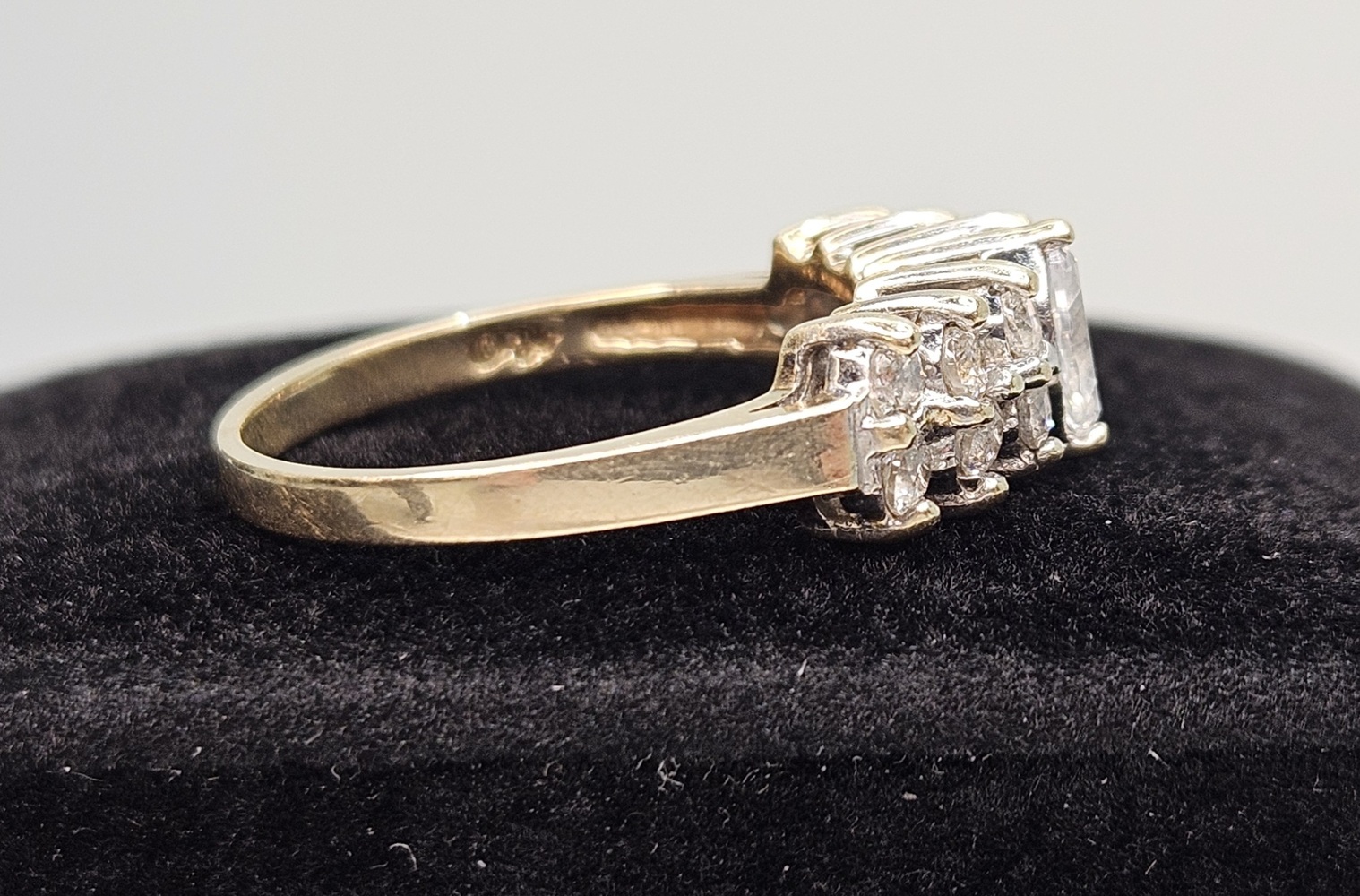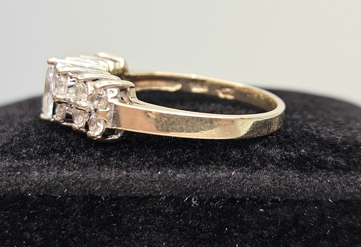 Adorn your fingers with this 10k yellow gold ring, luxuriously spotlighting marquise-cut clear stones set in a noble cluster. The ring captures timeless elegance, exhibiting radiant sophistication to elevate any outfit.