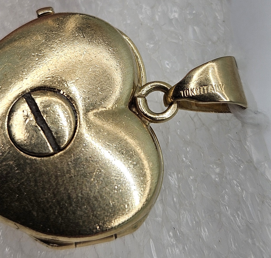 10k Yellow Gold The total weight of the pendant is: 7.8 Grams The length of the pendant including bale is 28.30mm (1.11"), width of 19.78mm (0.77"), and a thickness of 6.07mm (0.23") The bale has an opening of: 2.79mm (0.10")