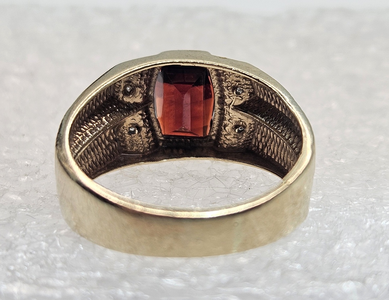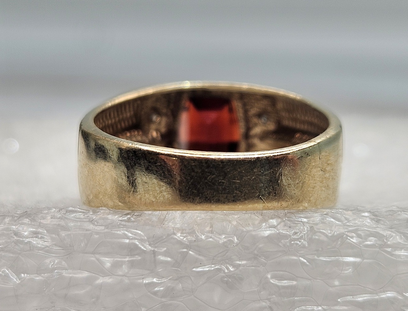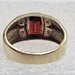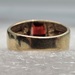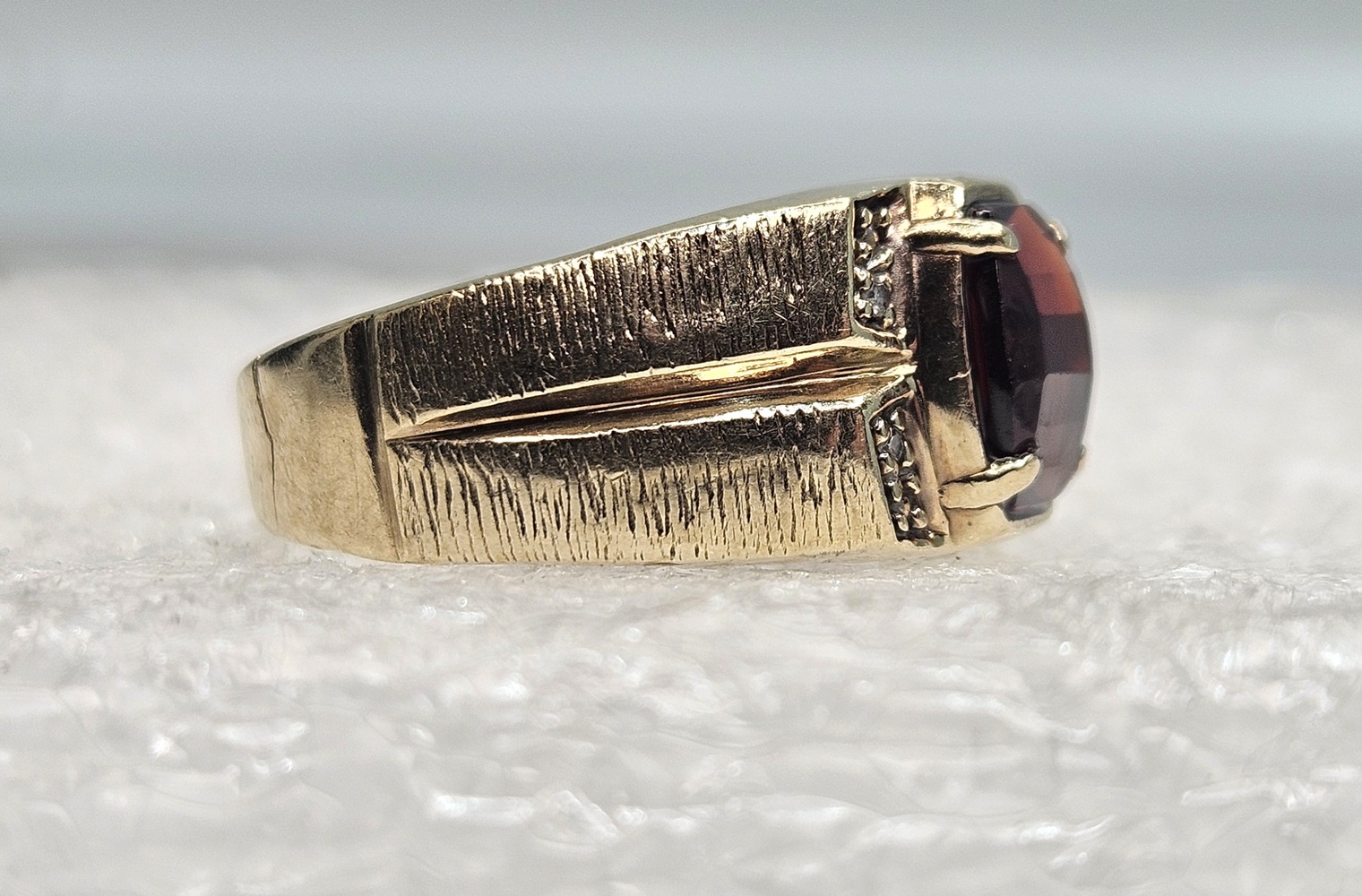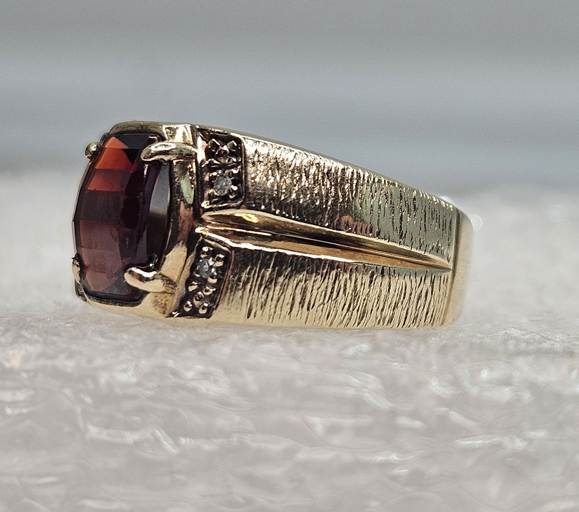 An exquisite 10k yellow gold ring, showcasing a radiant oval red gemstone centerpiece. This elegant piece is further enhanced with four petite, round clear stones, creating a refined sparkle that exudes timeless beauty and sophistication.