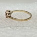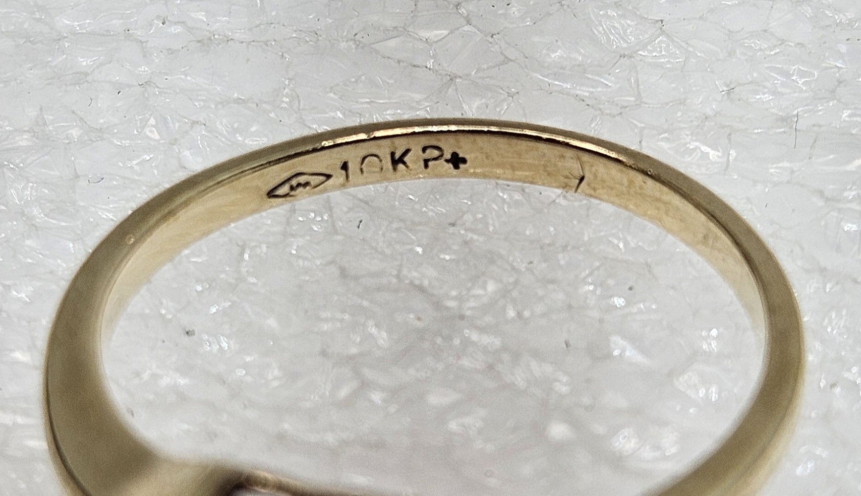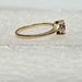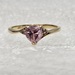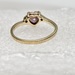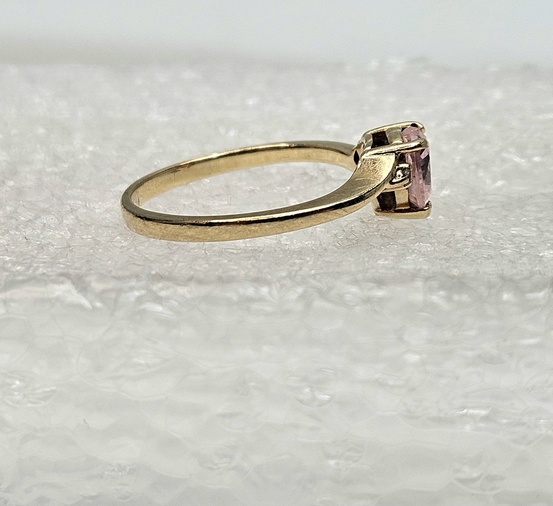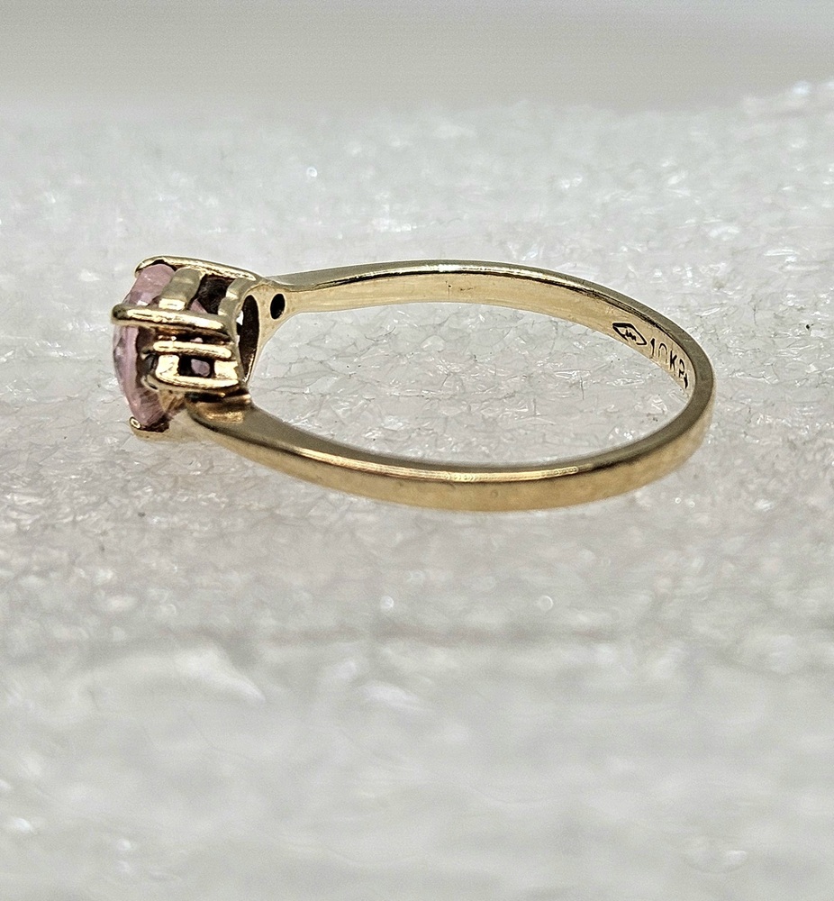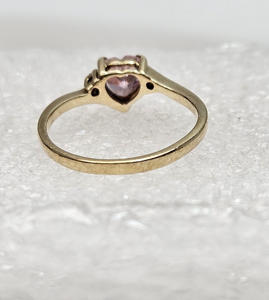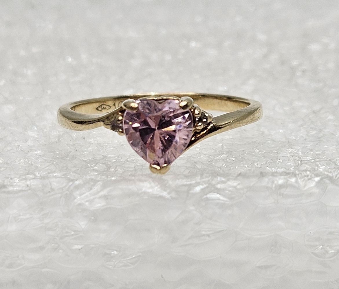 This luminous 10 karat yellow gold ring boasts a captivating heart cut pink stone at its center, flanked by two petite, round clear stones, adding a touch of elegance and sparkle.