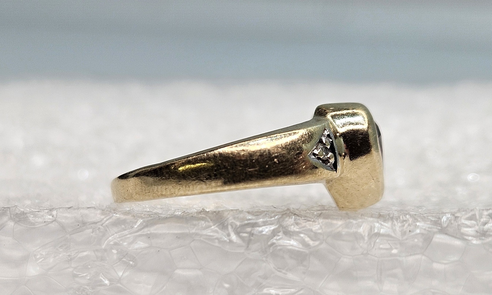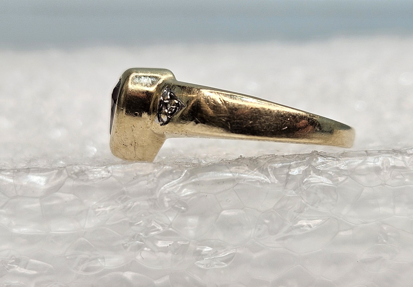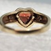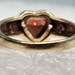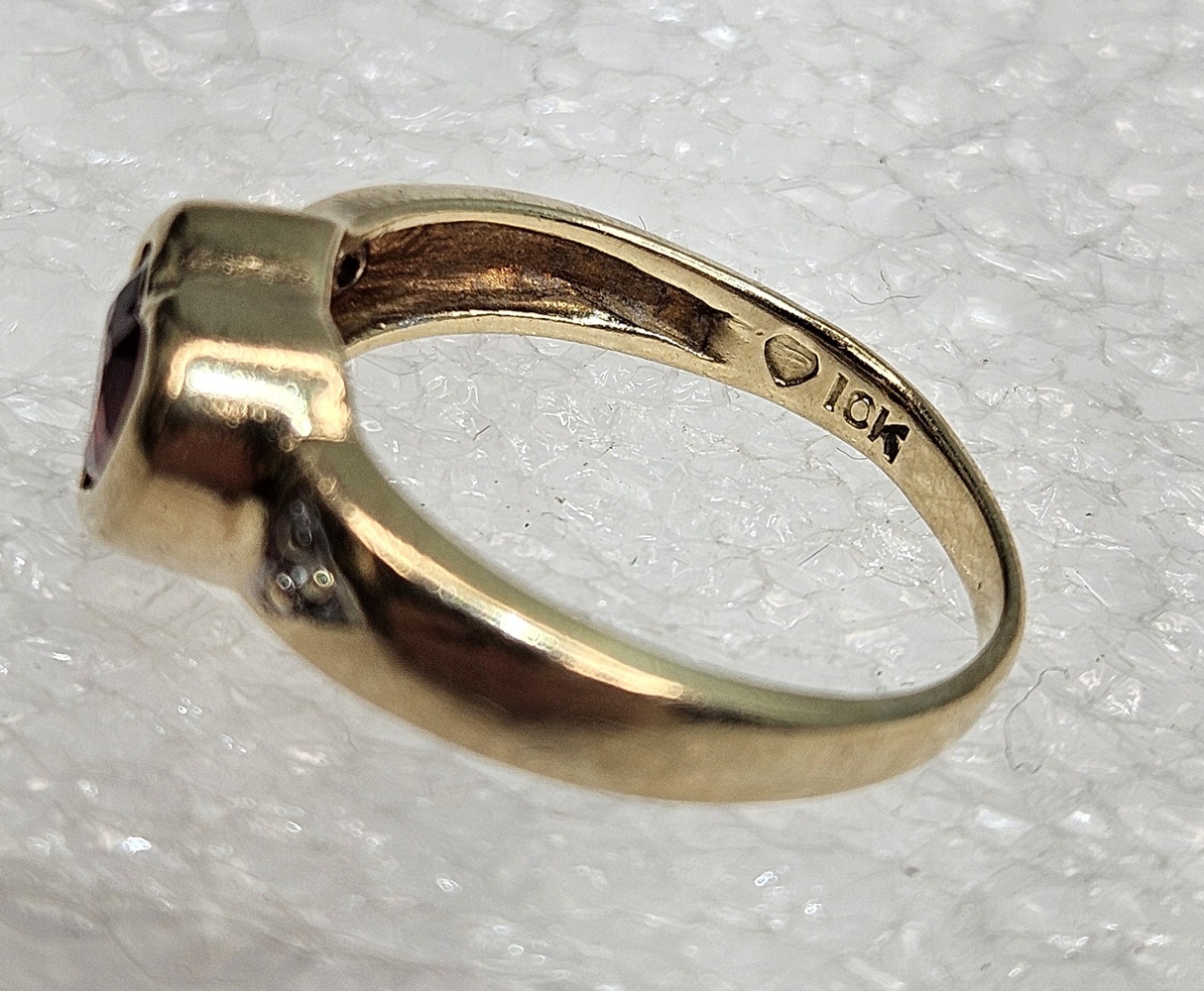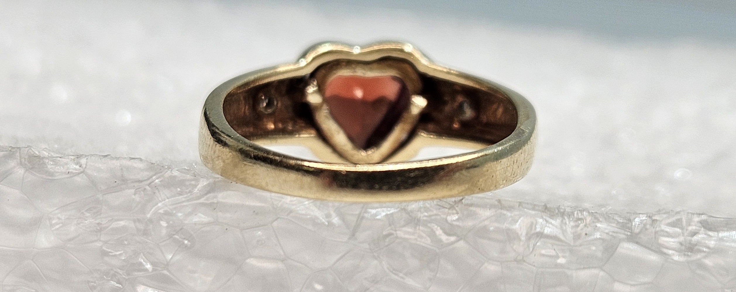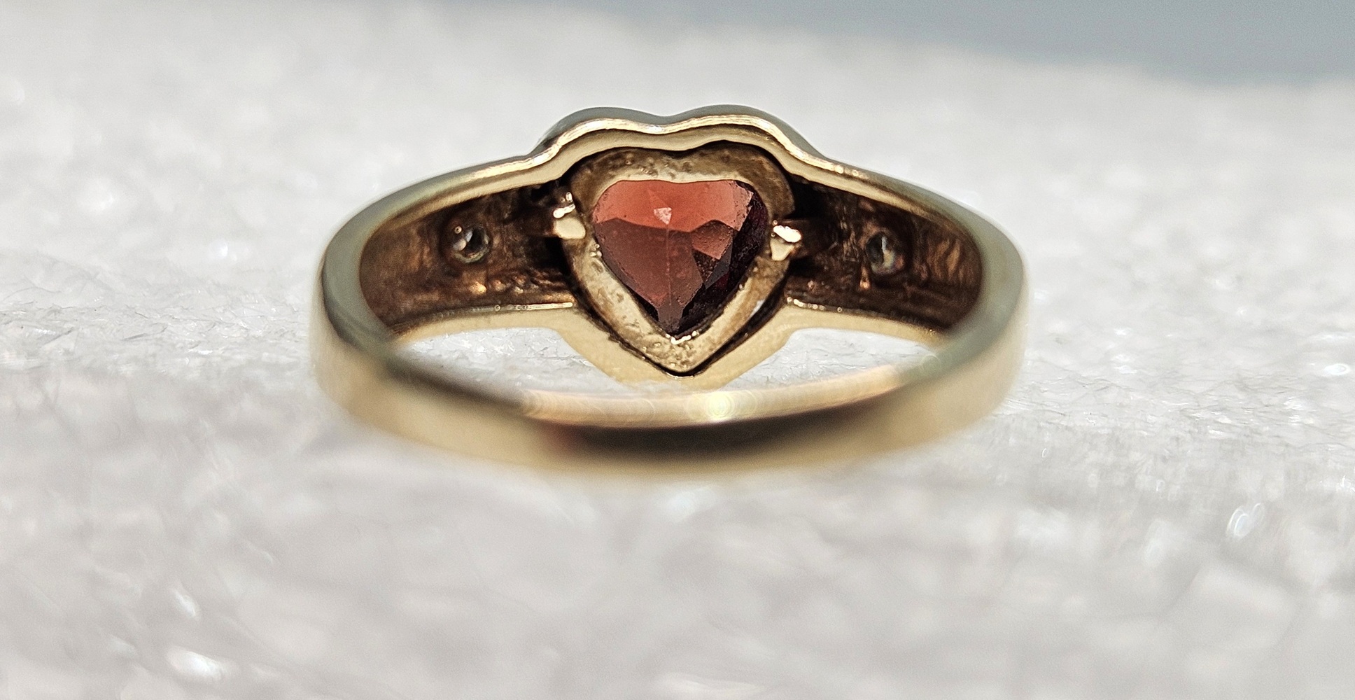 Emit passionate vibes with this captivating 10k Yellow Gold Ring radiating a bewitching Red Heart Gemstone. Flanked by twin round clear stones, it embodies everlasting love. An enchanting piece to send hearts aflutter and illuminate your inner glow.