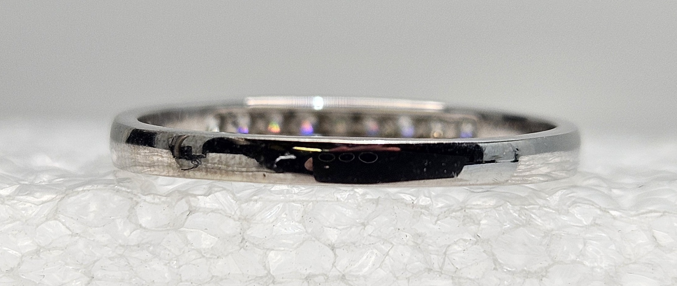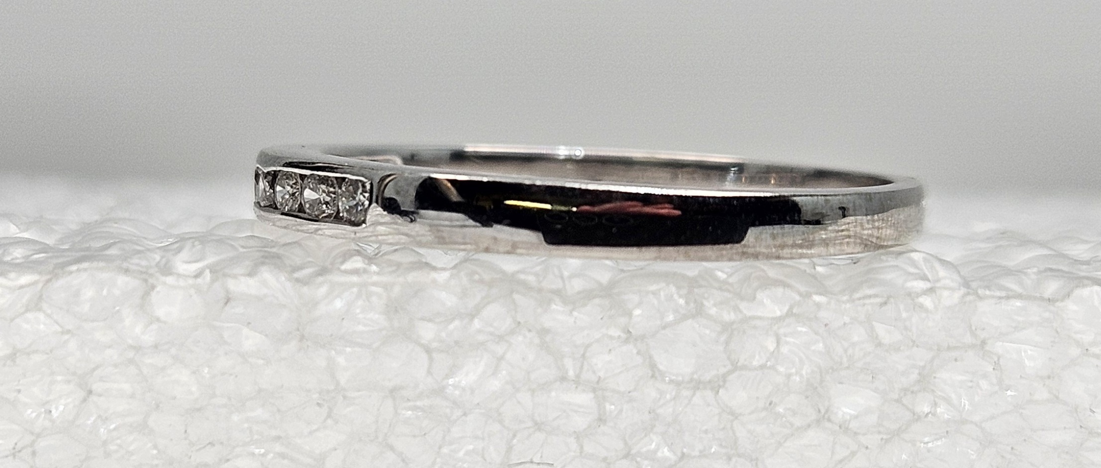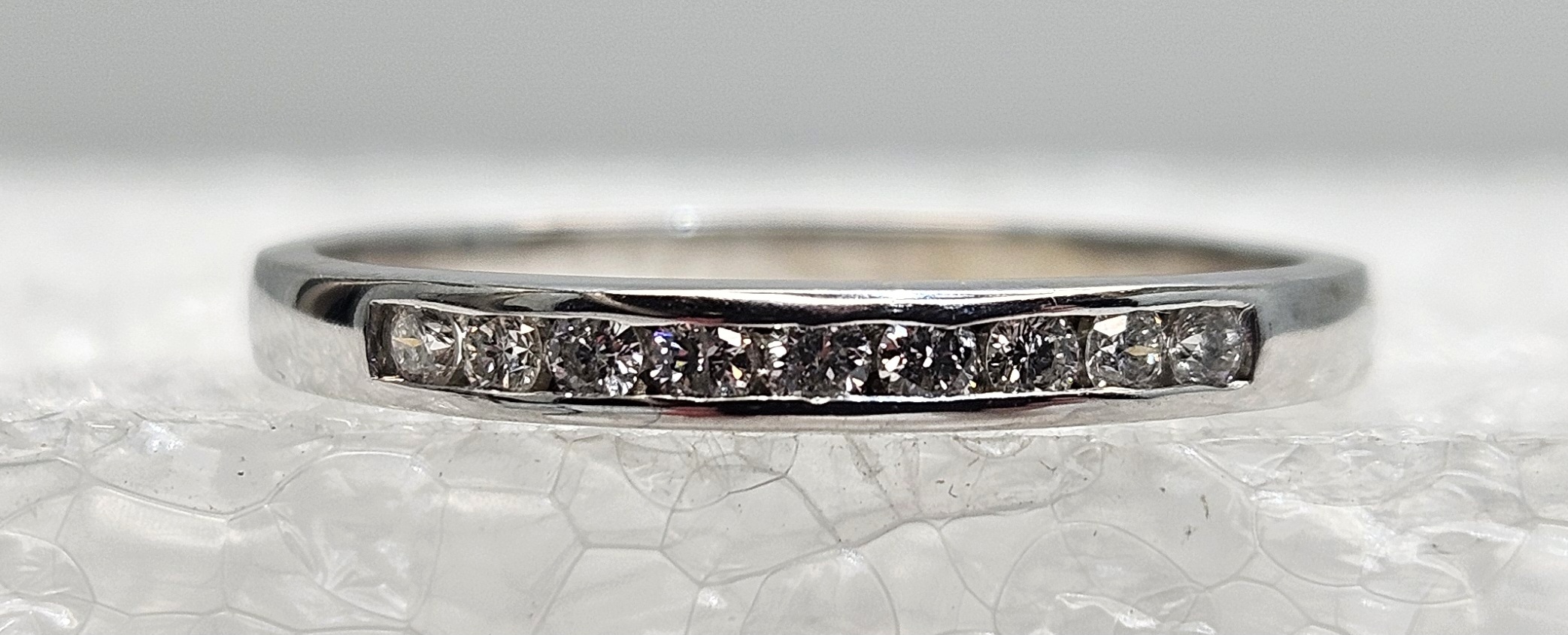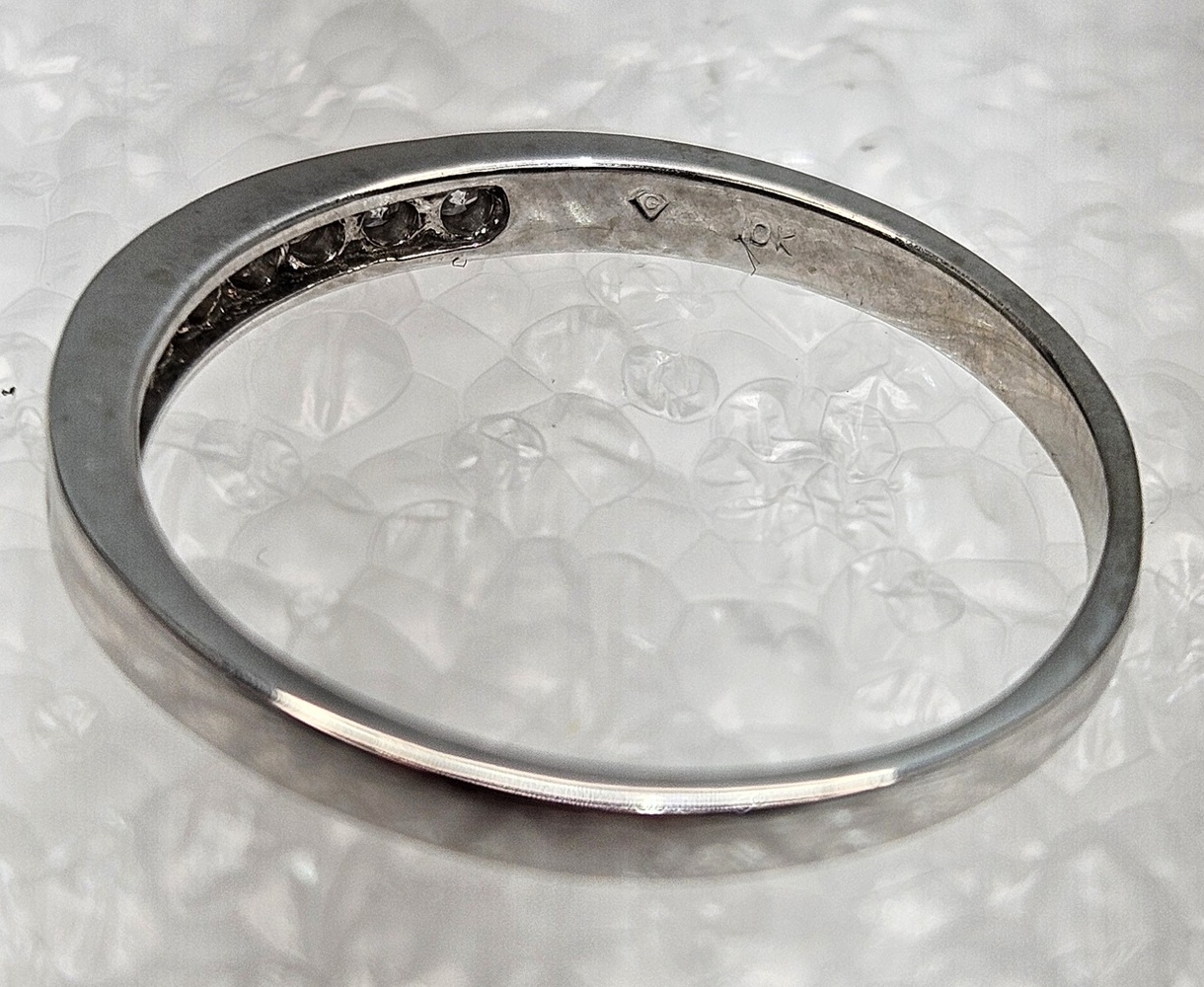 Elegant 10k white gold band, size 8.75, adorned with 9 round, channel-set diamonds. Exceptionally crafted for brilliance and durability. Perfect for daily wear.