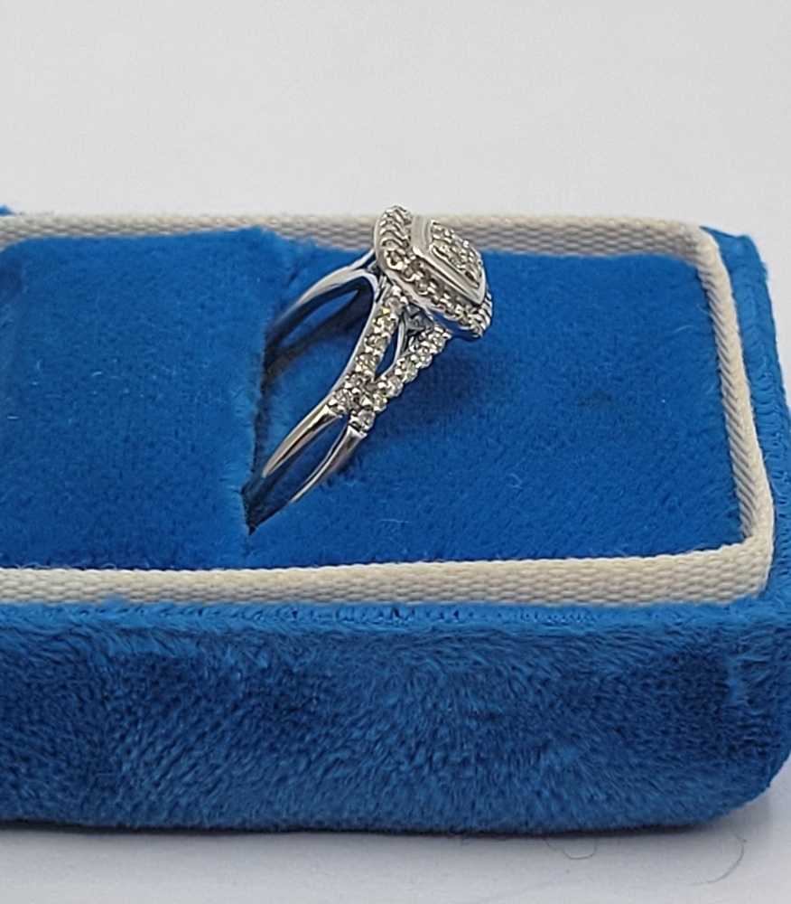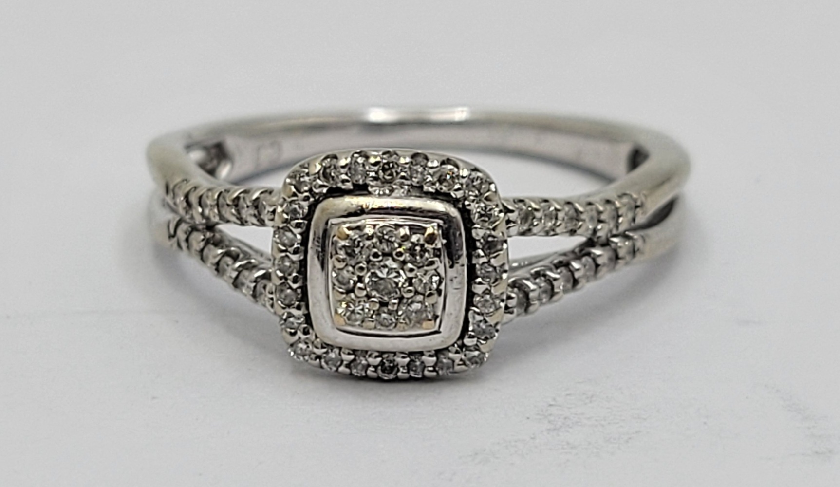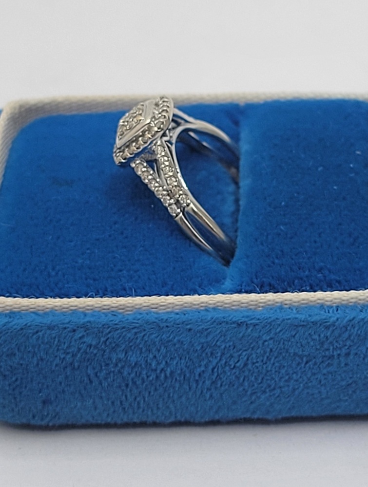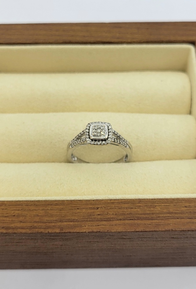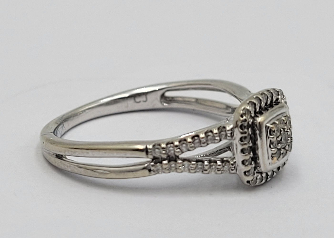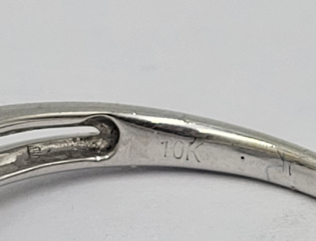 Emanate subtle elegance with our intricate 10k White Gold Double Frame Twist Shank Engagement Ring. The 0.05ct diamond sparkles within a exquisite twin frame, exuding endless shimmer. Beautifully crafted in sleek size 5.5, it evokes an alluring swirl of romance and charming sophistication. A timeless symbol of love.