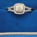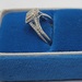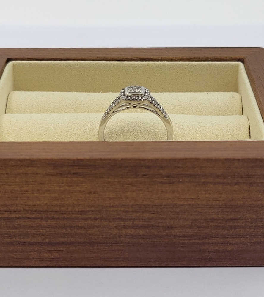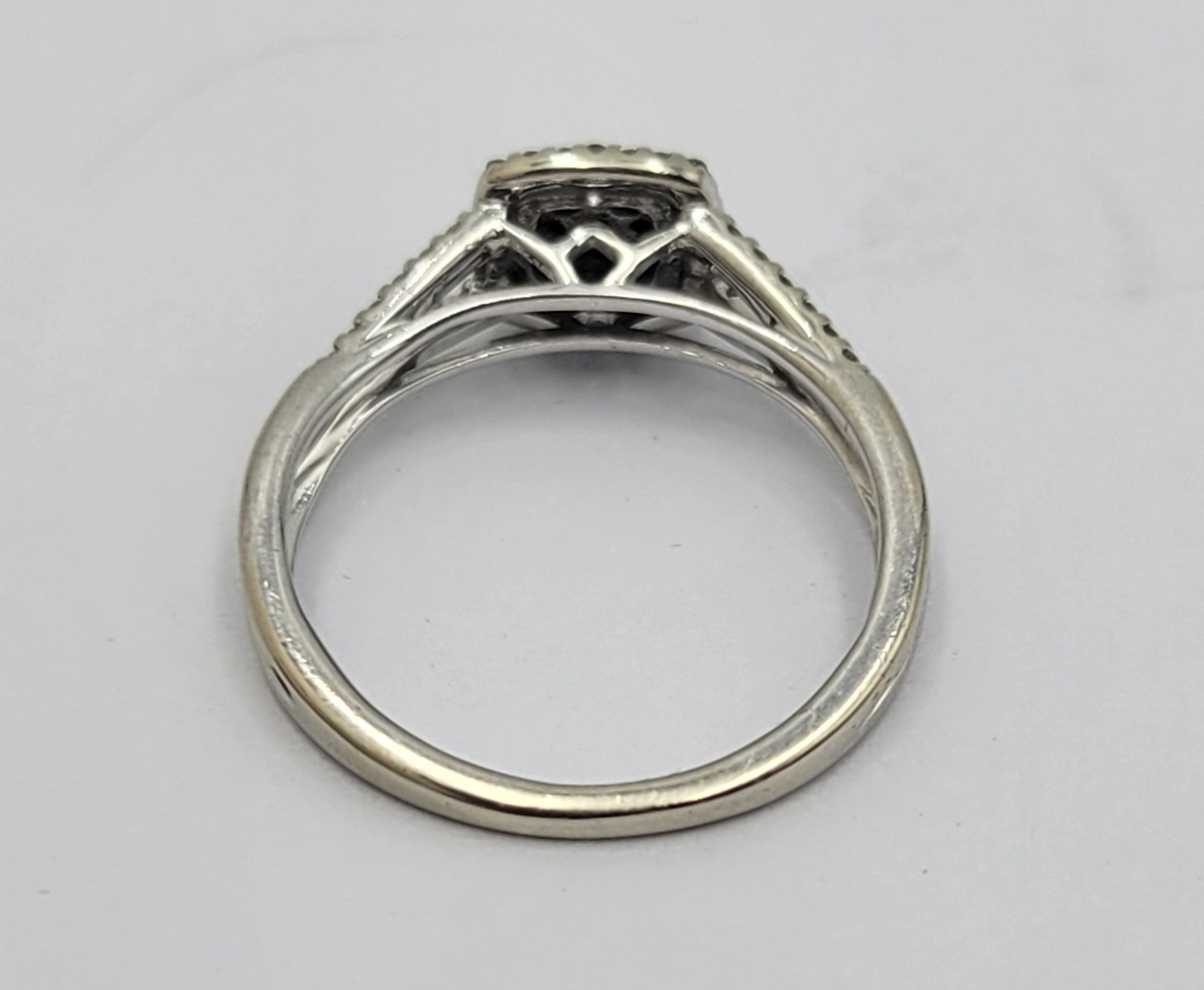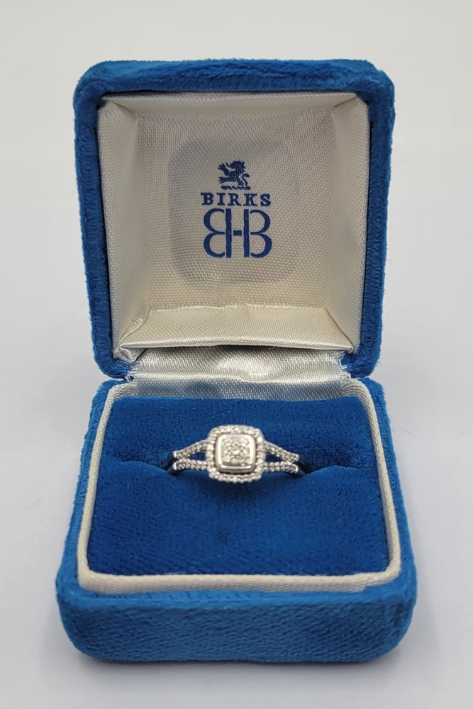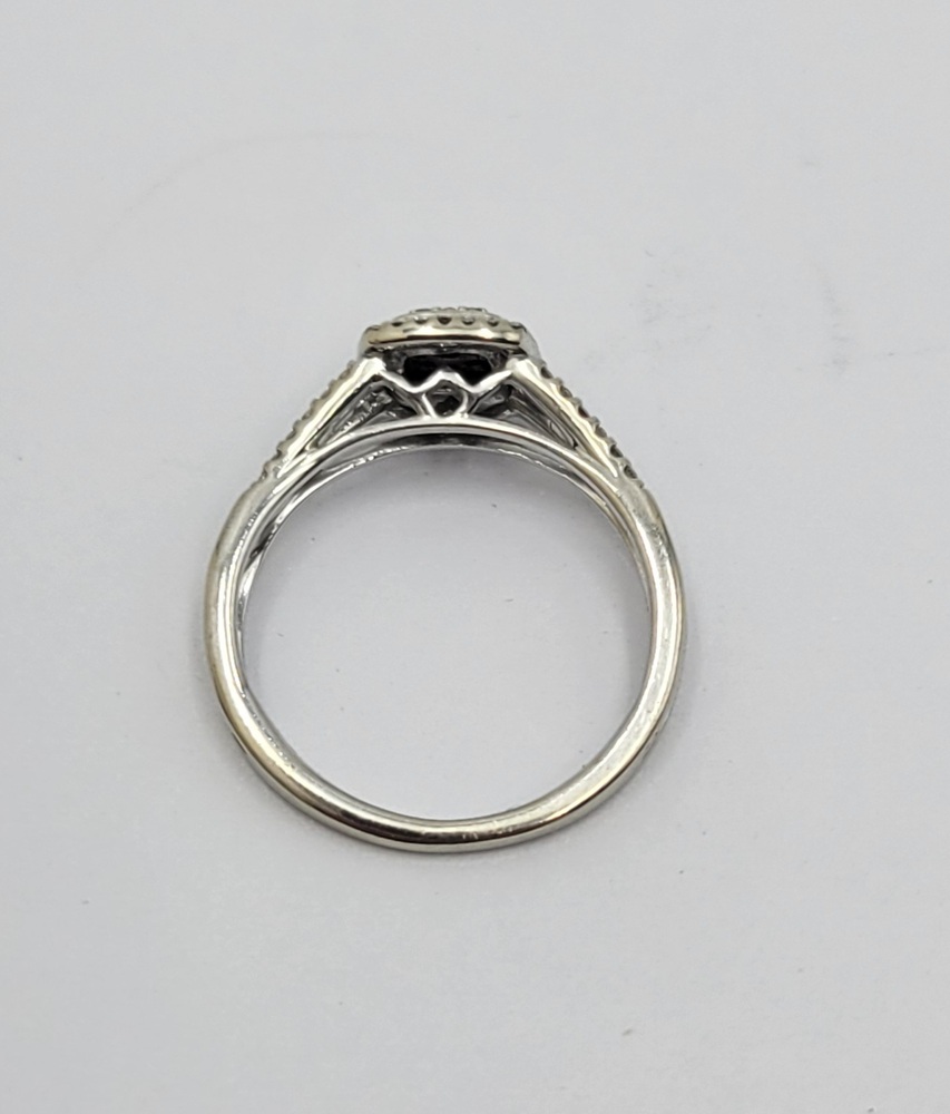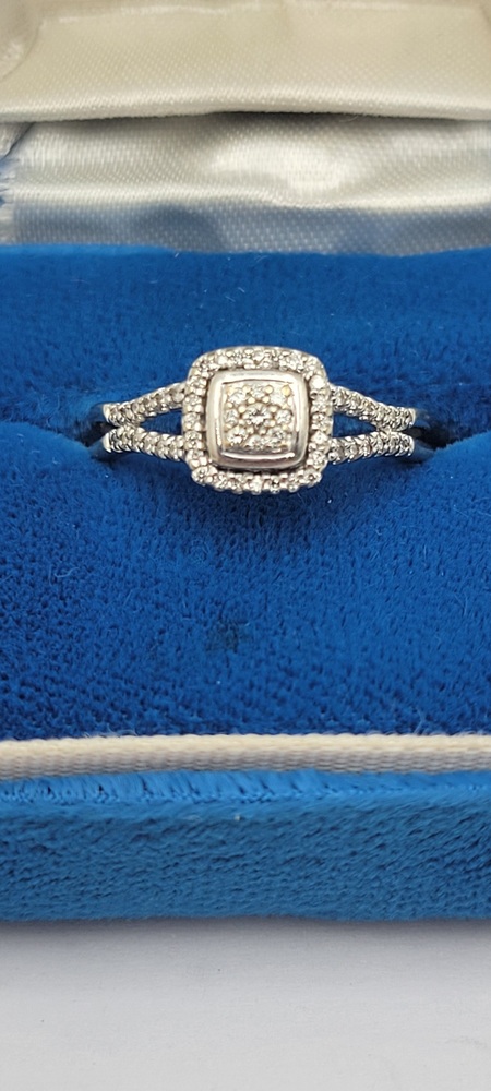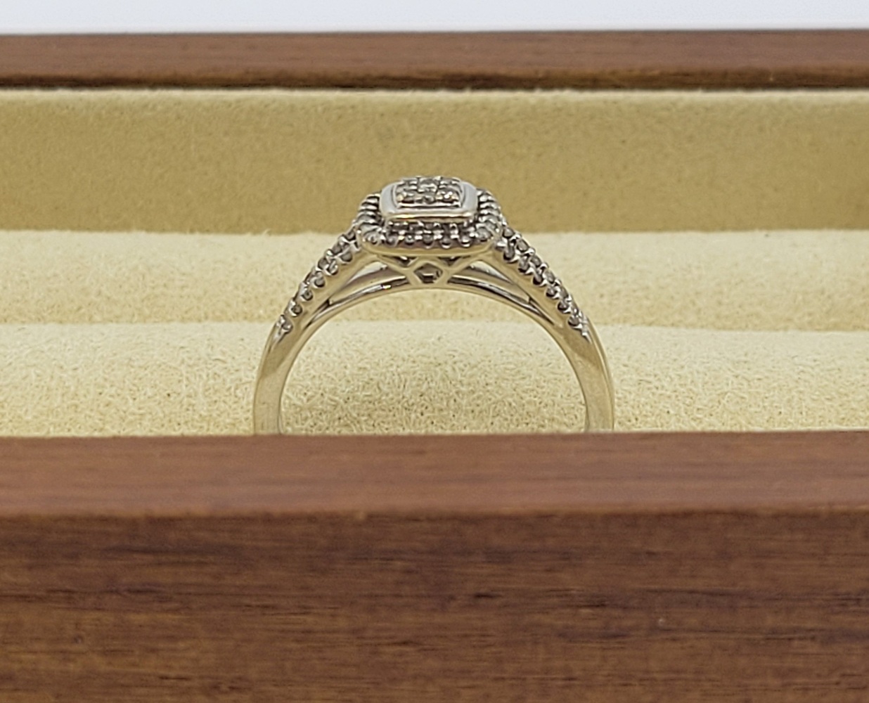 Emanate subtle elegance with our intricate 10k White Gold Double Frame Twist Shank Engagement Ring. The 0.05ct diamond sparkles within a exquisite twin frame, exuding endless shimmer. Beautifully crafted in sleek size 5.5, it evokes an alluring swirl of romance and charming sophistication. A timeless symbol of love.