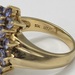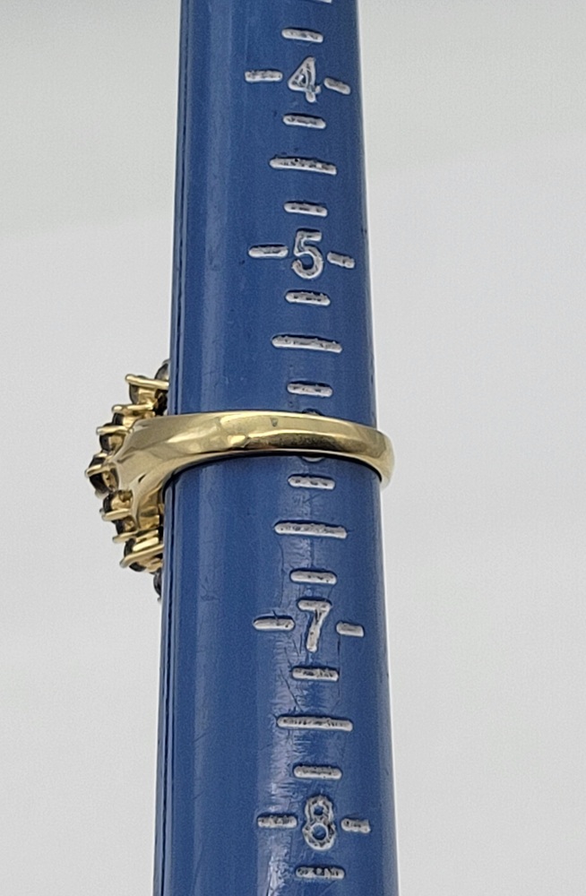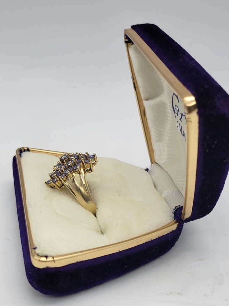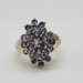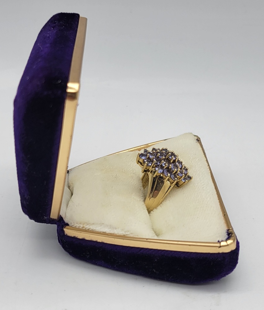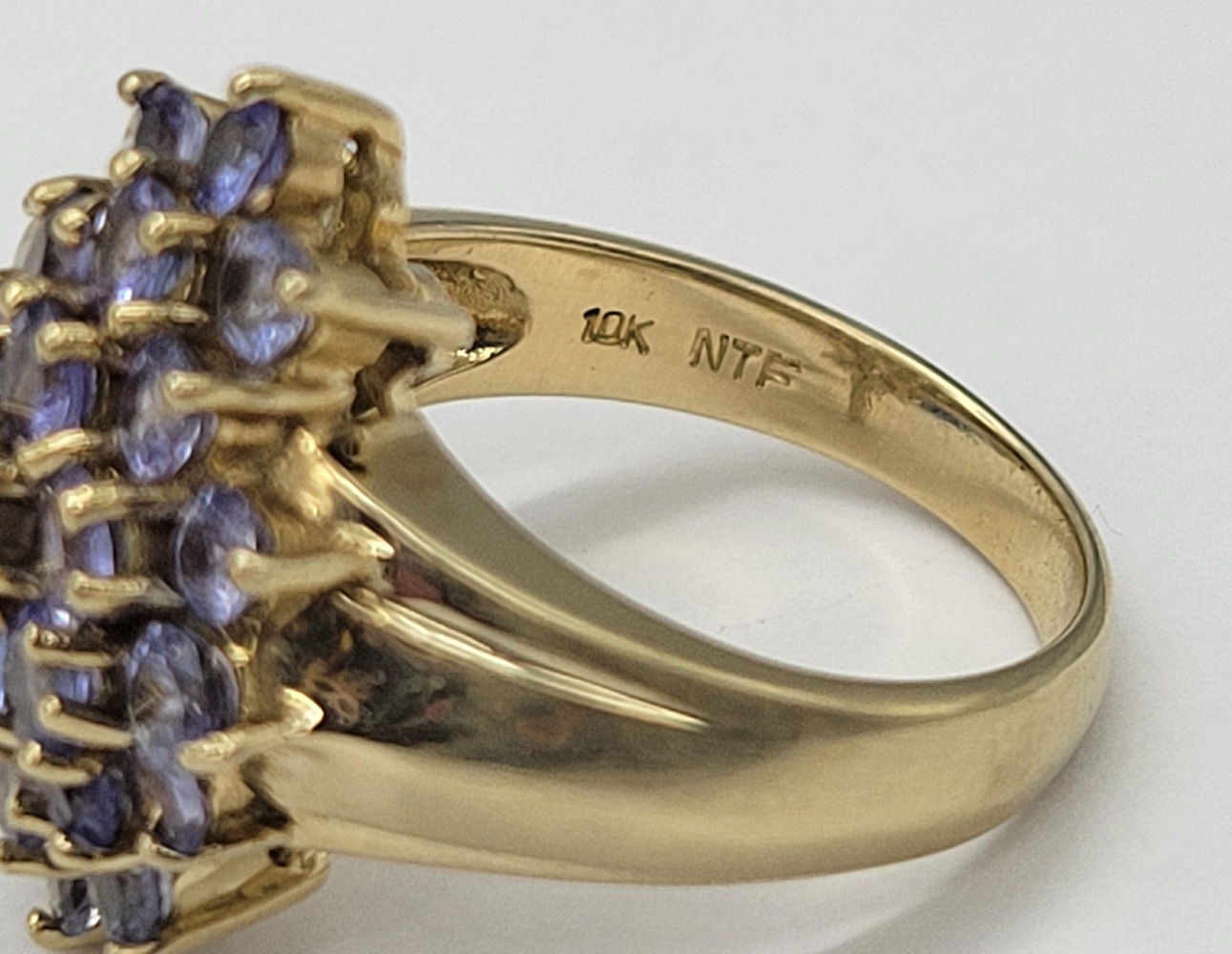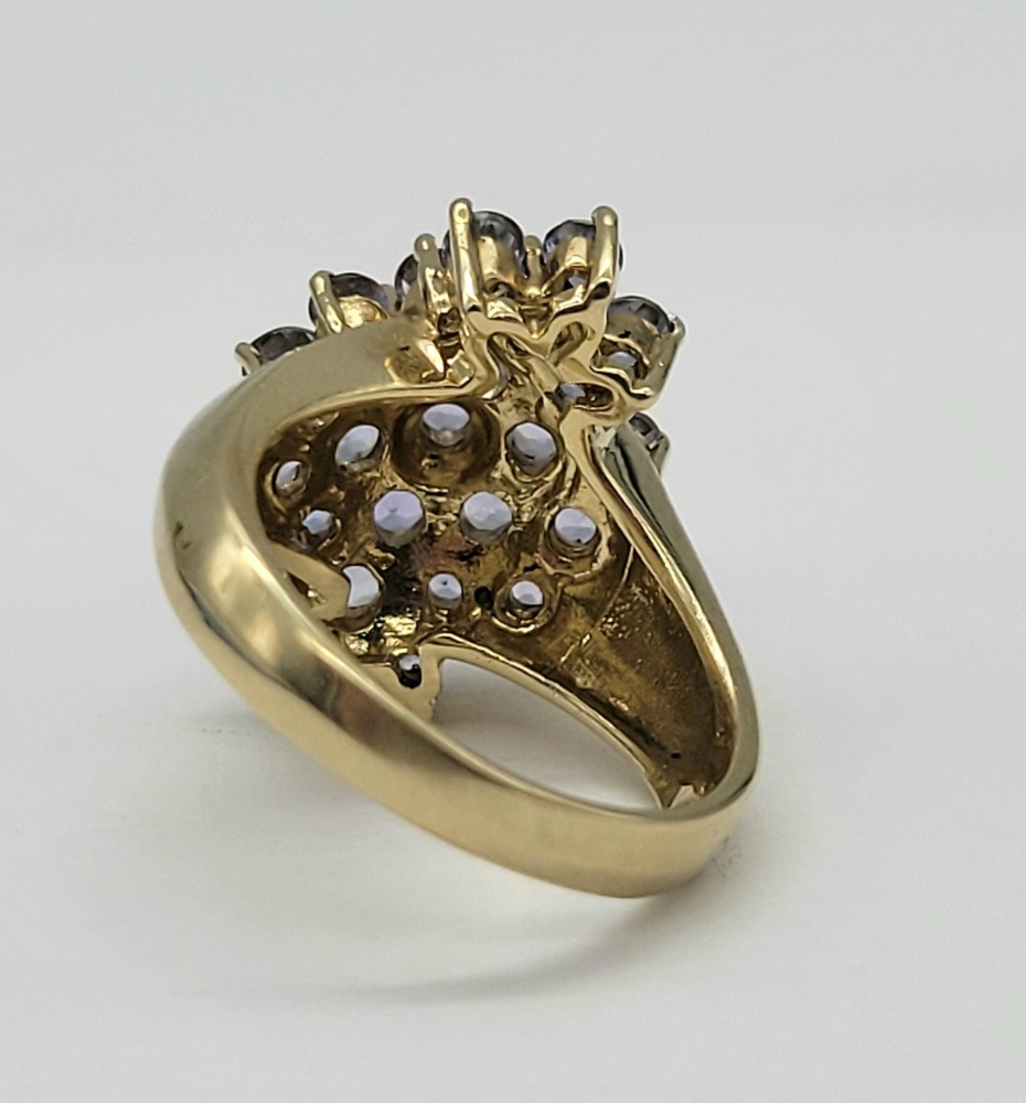 Experience an ethereal beauty encircling your finger with our 10k yellow gold, size 6, purplish-blue gemstone cluster ring. This spectacle of shimmering jewels, intricately set in gold, is like holding a piece of captivating twilight sky in your hand. An embodiment of elegance and mystery.