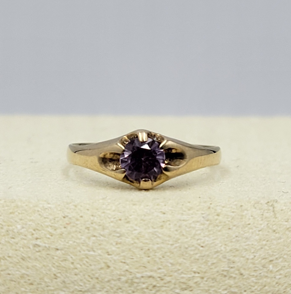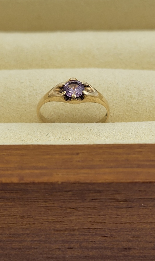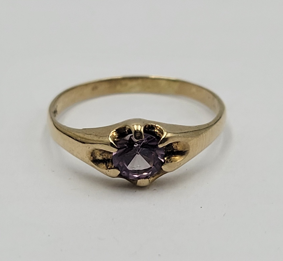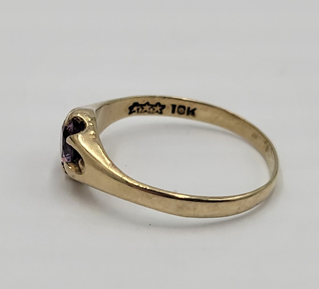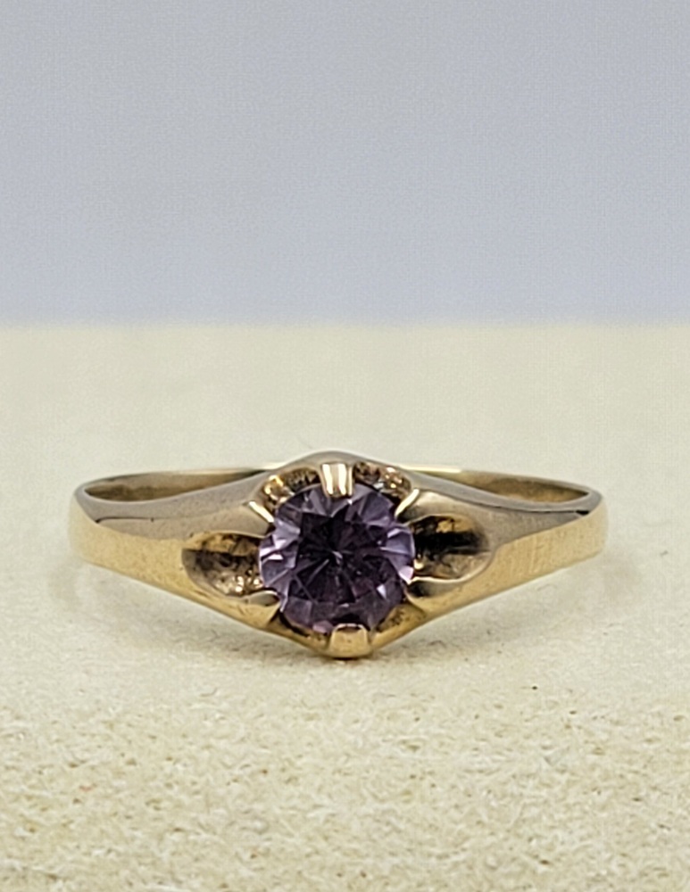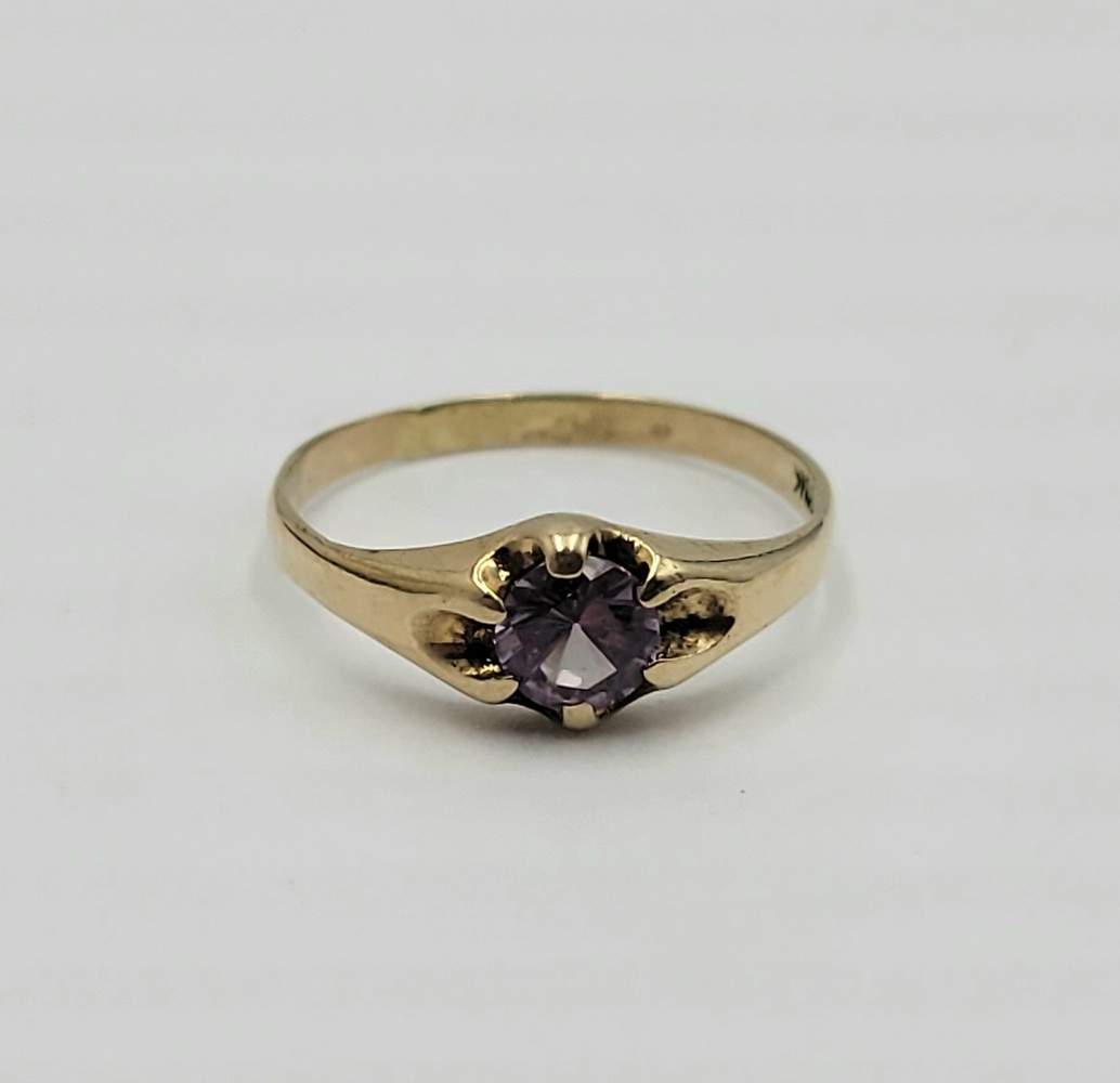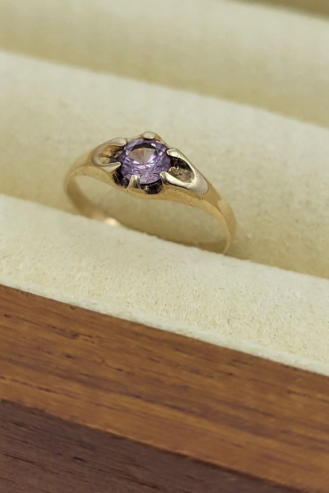 Welcome the world in style with this fabulous Baby/Pinky Ring. Skillfully crafted in 10k yellow gold, topped with a ravishing pinkish-purple gemstone that gleams with every movement. A perfect mix of sweet delicacy and tantalizing glamour, designed for little fingers or pinky promises! Size 2.5 - Limited Edition.