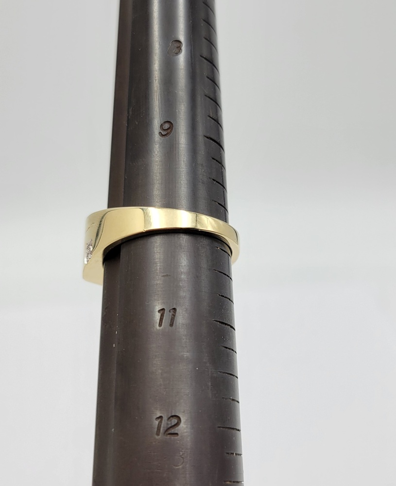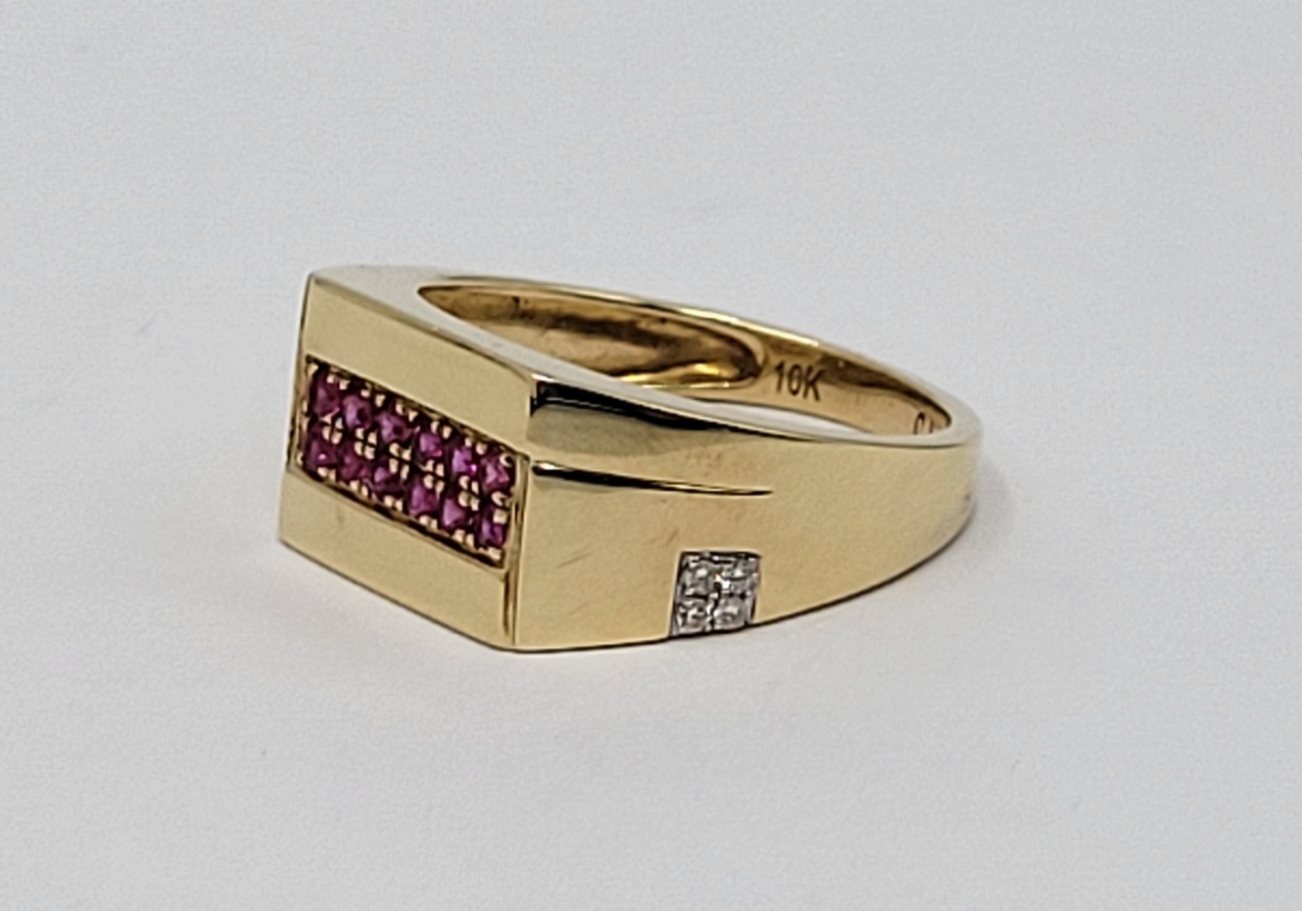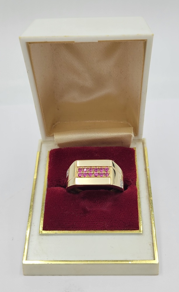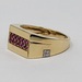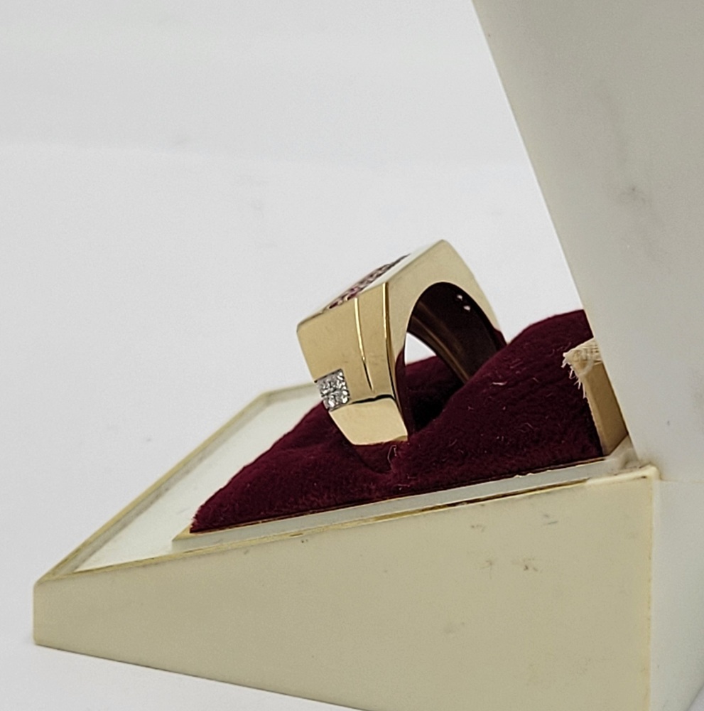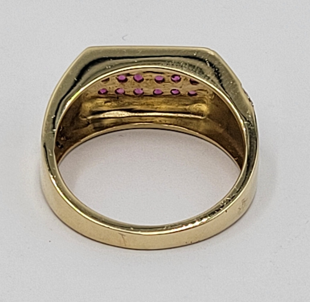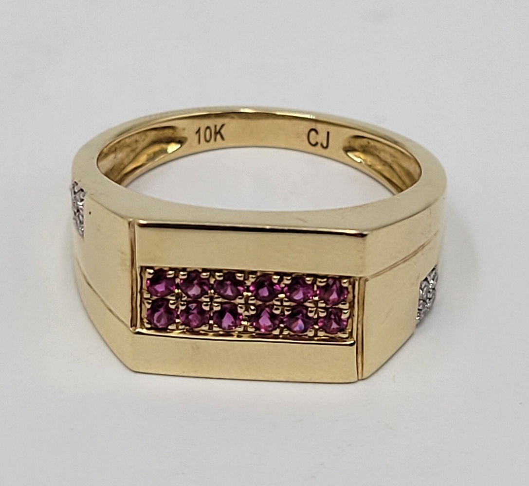 Experience the allure of opulence with this captivating 10k yellow gold band ring. Embedded with a stunning red gemstone, this piece radiates with an irresistible charm. Delicately accentuated with 0.04 t.c.w diamonds, it gracefully merges sophistication with a touch of glamour. Capture the essence of unparalleled elegance and make a statement wherever you go!