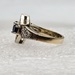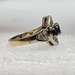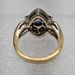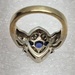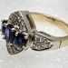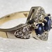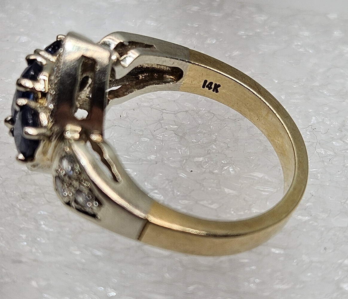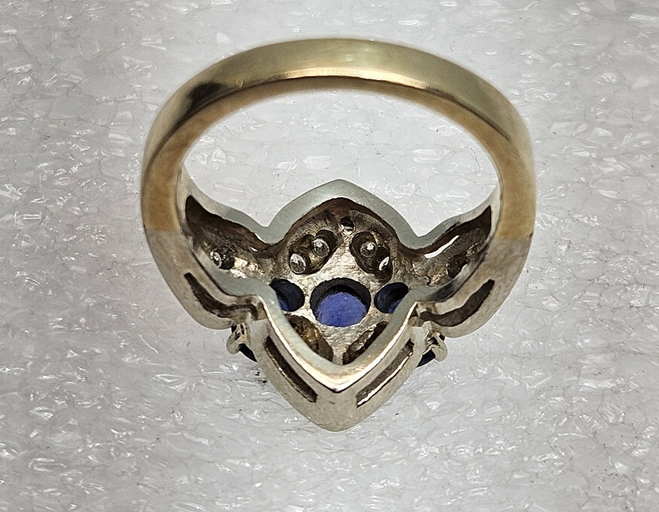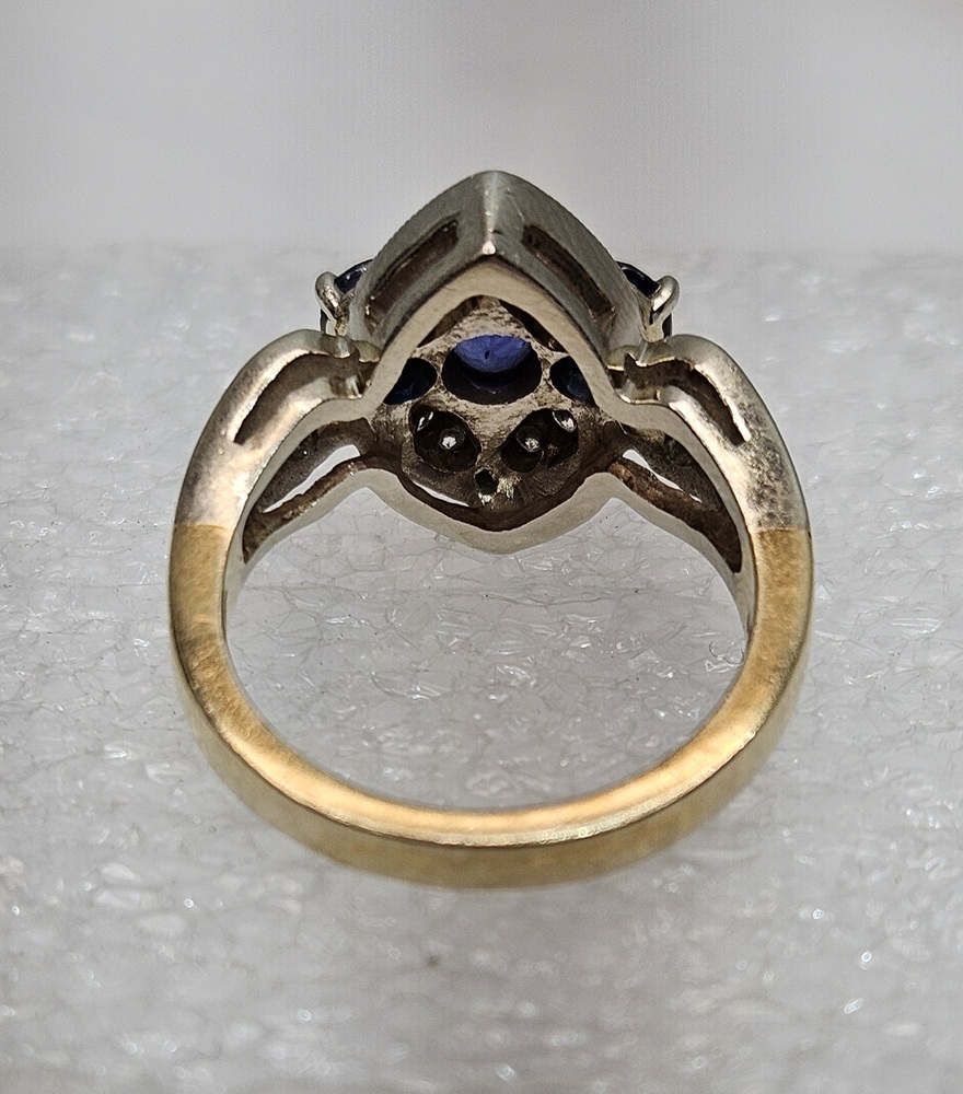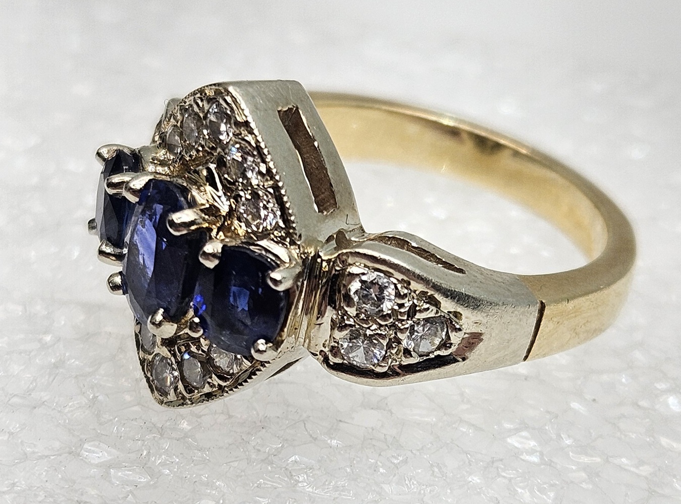 An enchanting fusion of charm & elegance, this vintage-style 14k Two-Tone White and Gold ring boasts three blue oval-shaped gemstones and sixteen clear round stones.Its artful symmetry and refined details truly make it a masterpiece.
