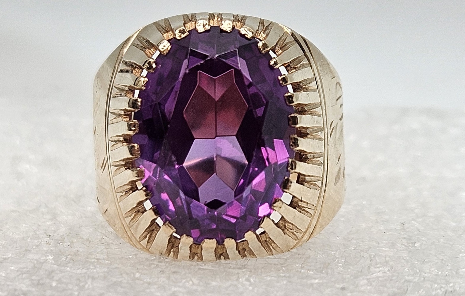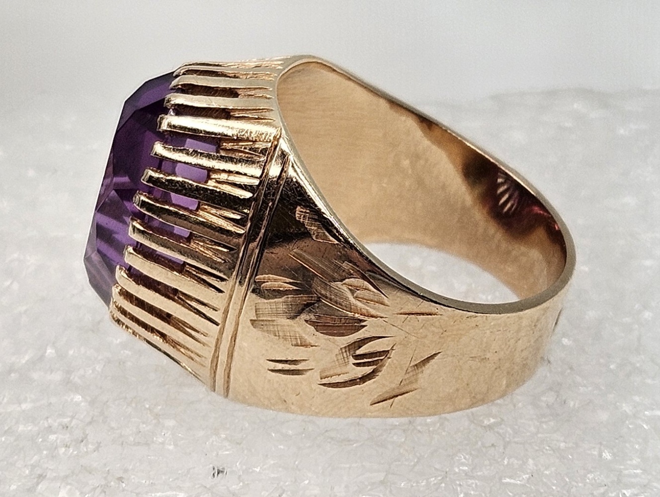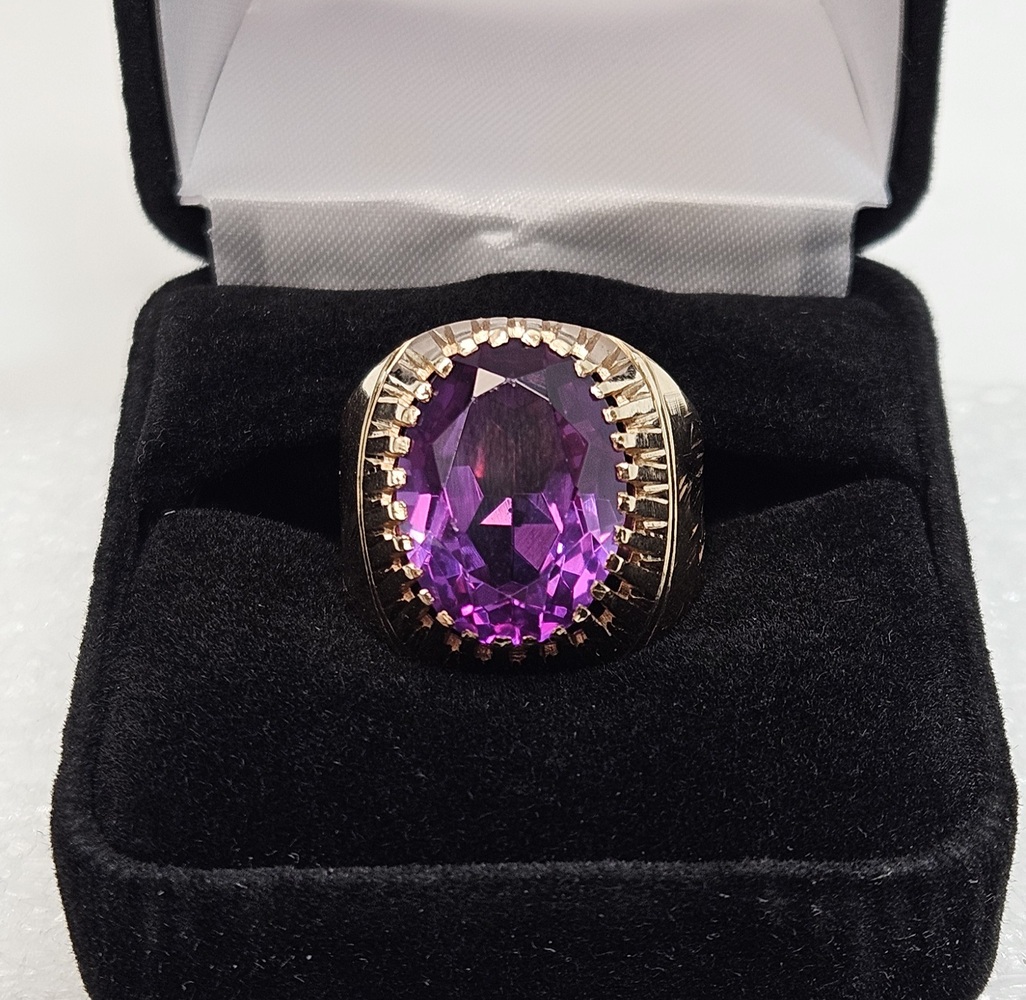 Admire this exquisite 14 karat gold ring, weighing 8.10 grams. At its core, a dazzling purple gemstone, radiating divine elegance and mysterious charm.
