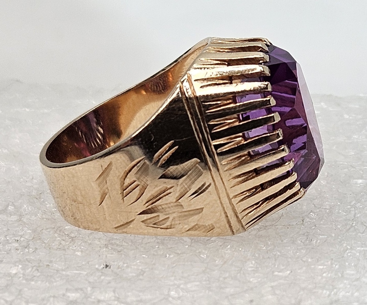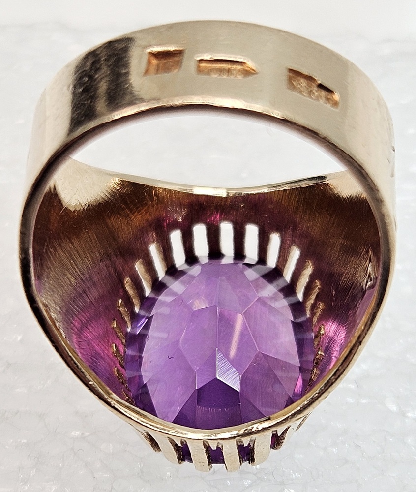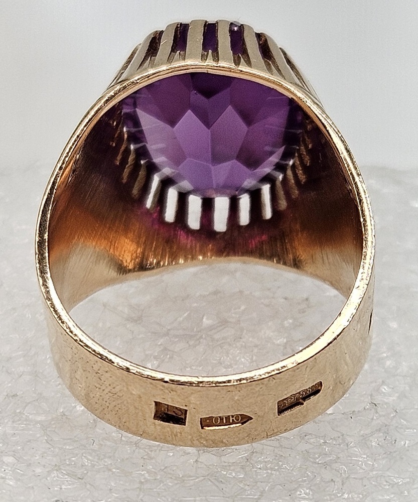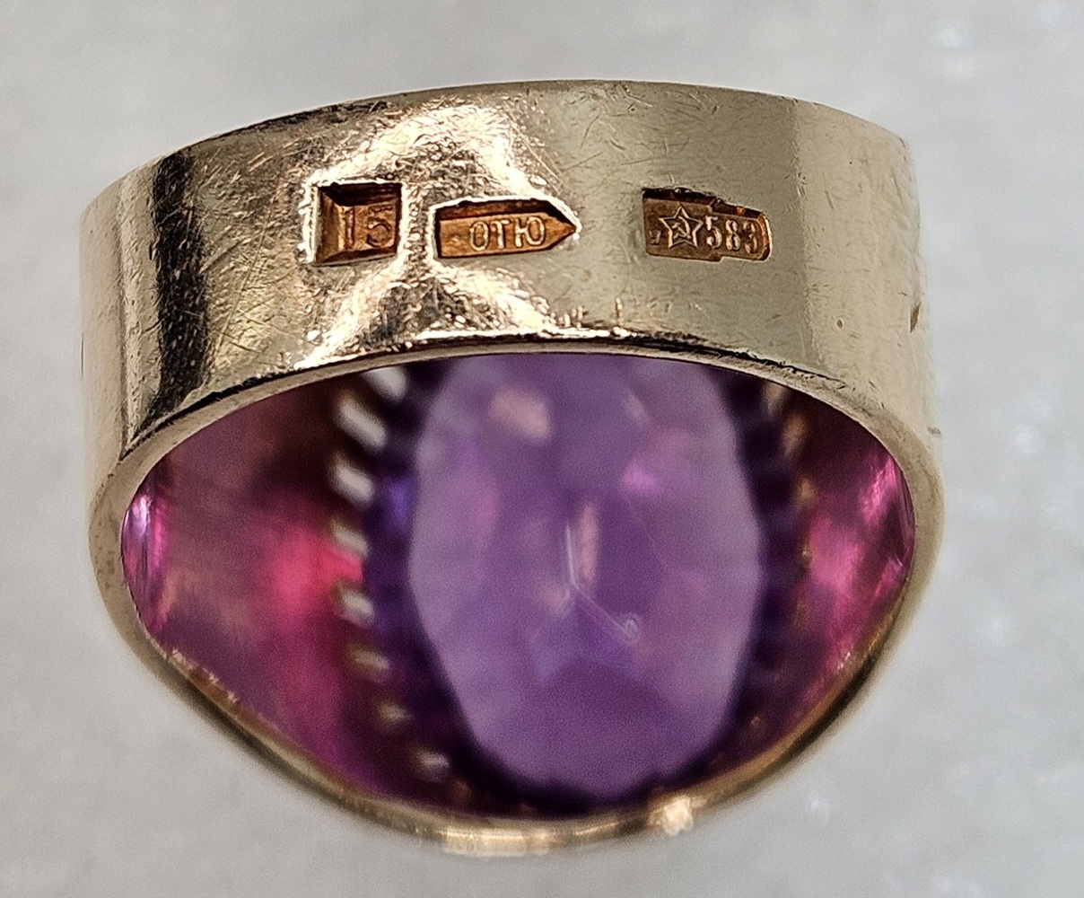 Admire this exquisite 14 karat gold ring, weighing 8.10 grams. At its core, a dazzling purple gemstone, radiating divine elegance and mysterious charm.
