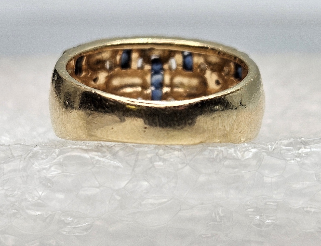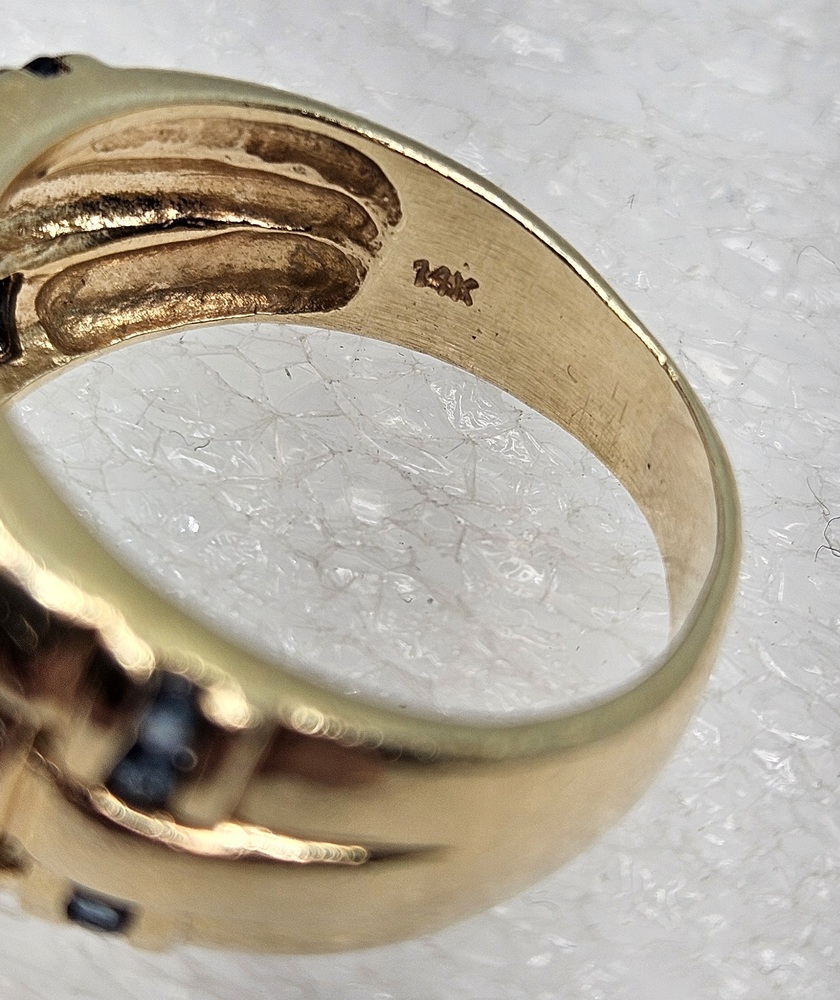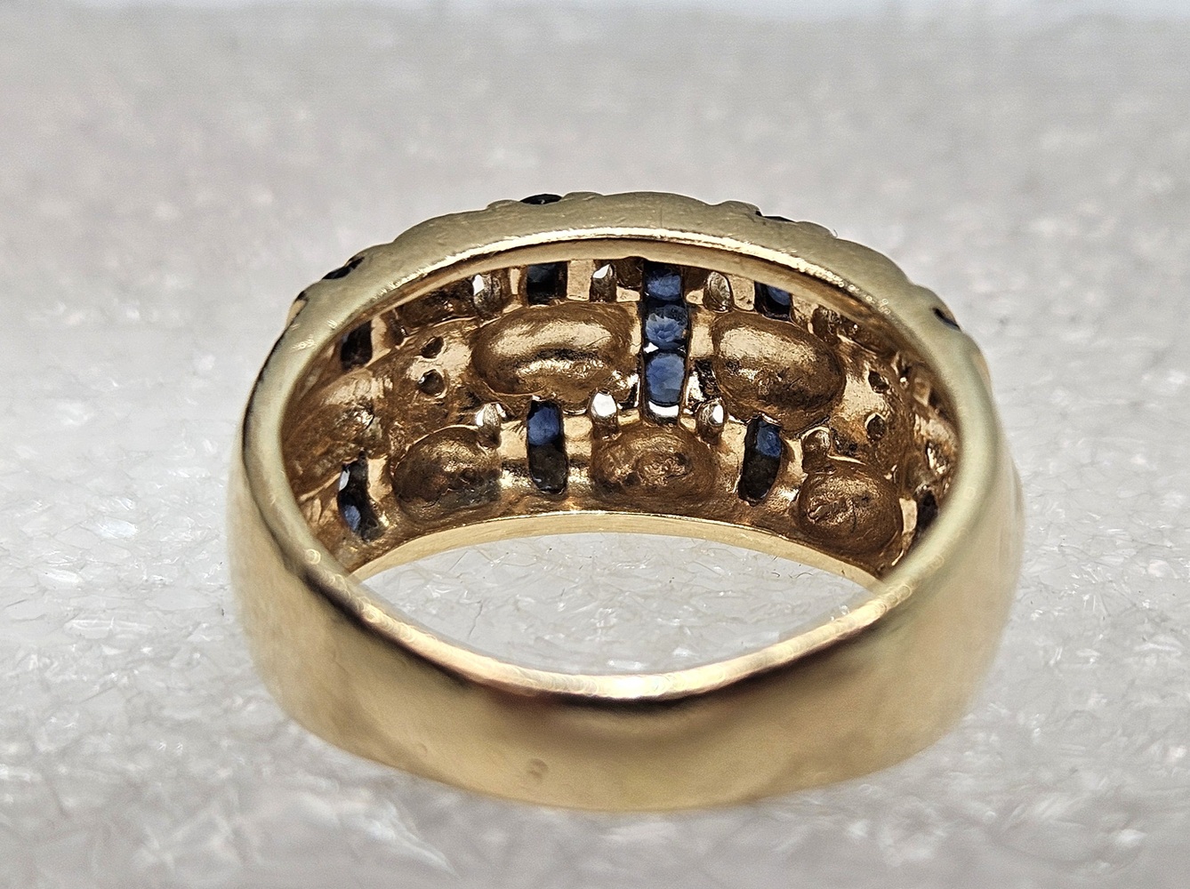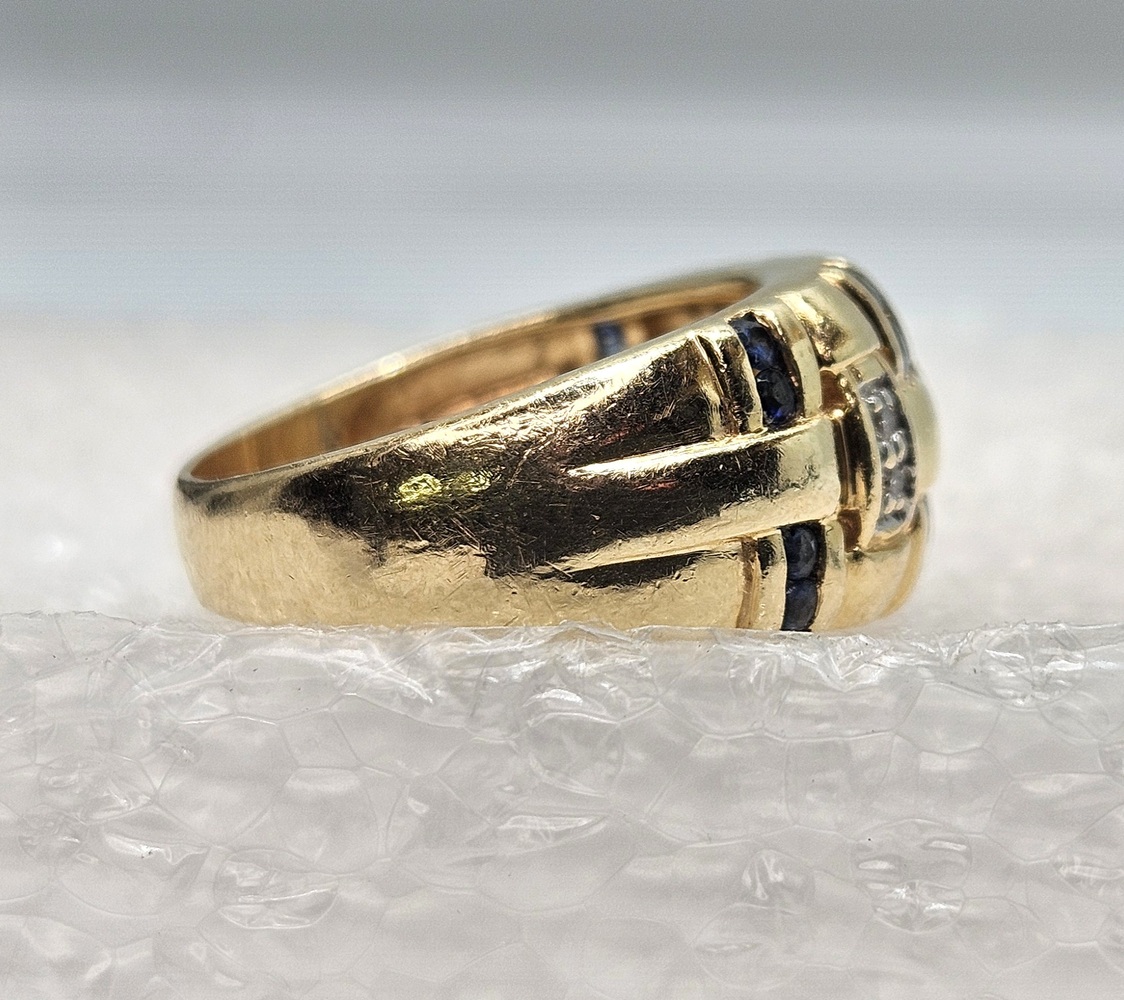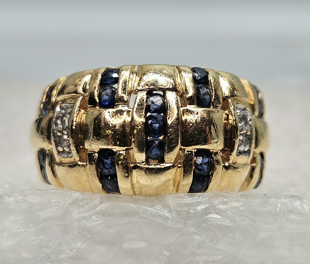 Indulge in exquisitely crafted elegance with this 14k yellow gold ring. The intricate basket weave design is lavishly adorned with 19 round blue gemstones, complemented by 4 round clear stones.