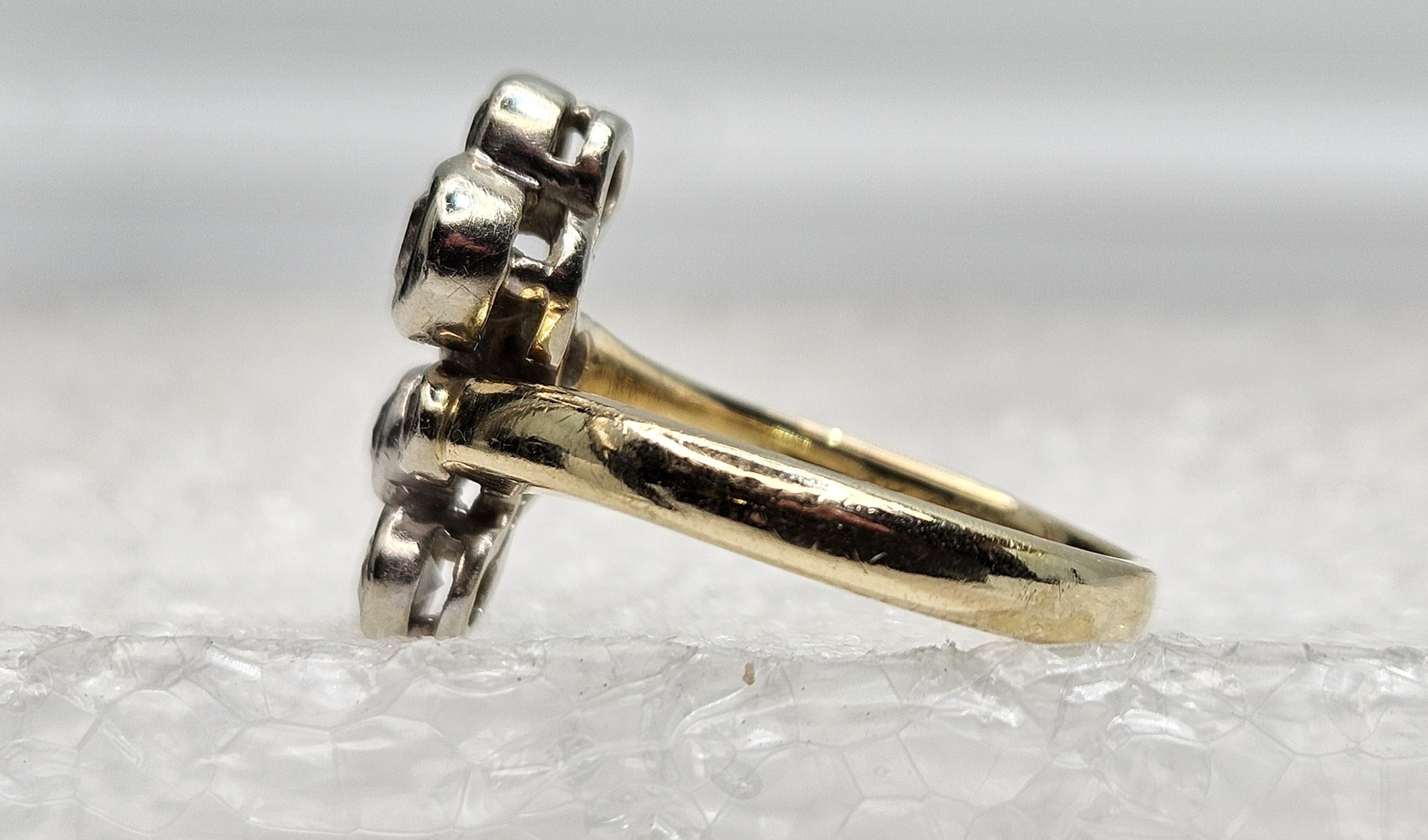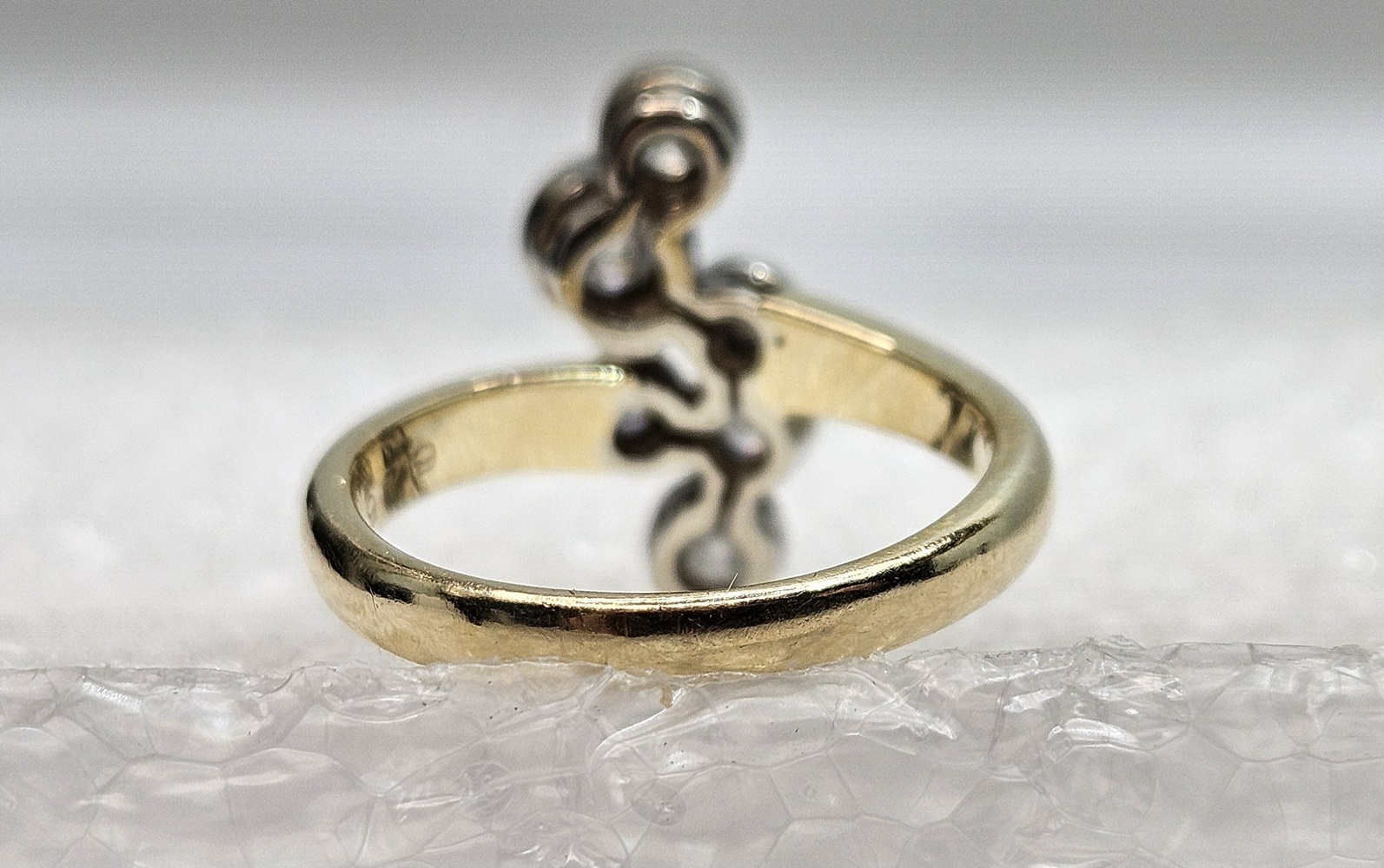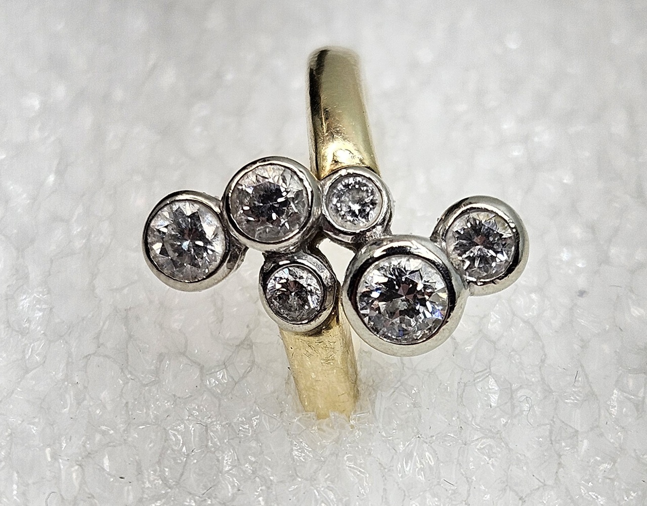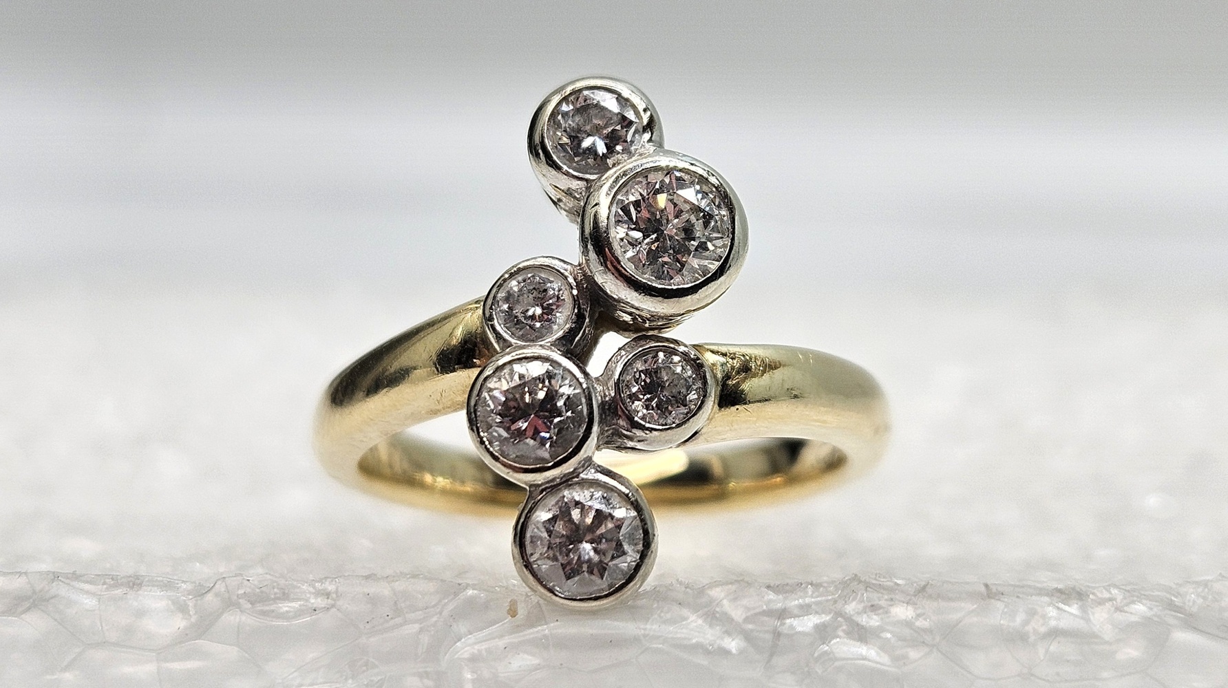 This ring features a unique bubble motif, created from 14k yellow gold and set with six radiant diamonds. The playful yet elegant design offers a distinctive aesthetic, blending fine craftsmanship with timeless elegance. Limited edition, perfect for those seeking stand-out fine jewelry.