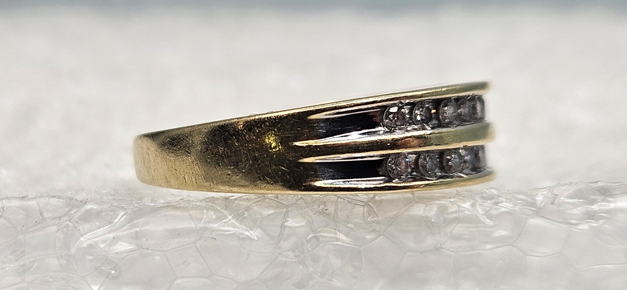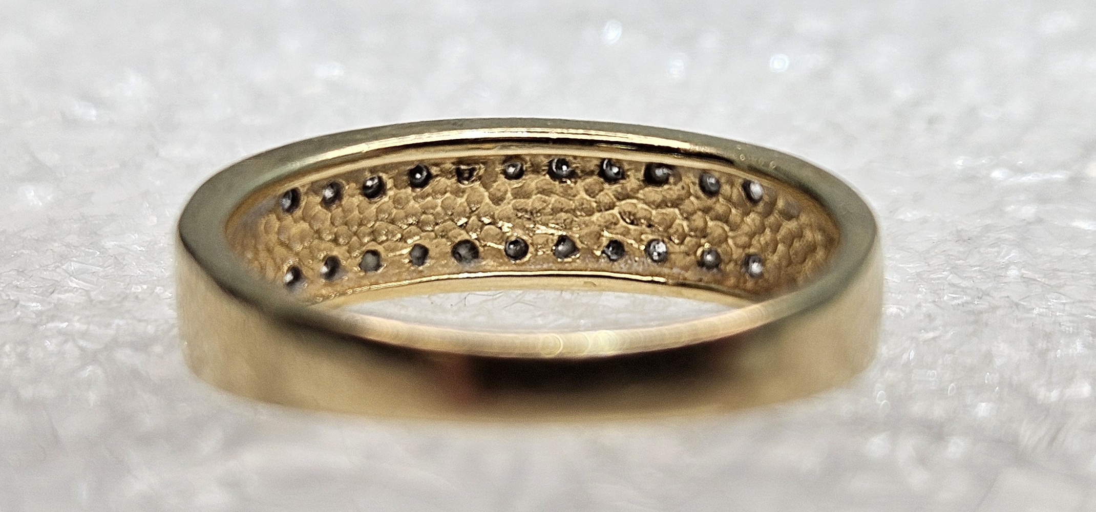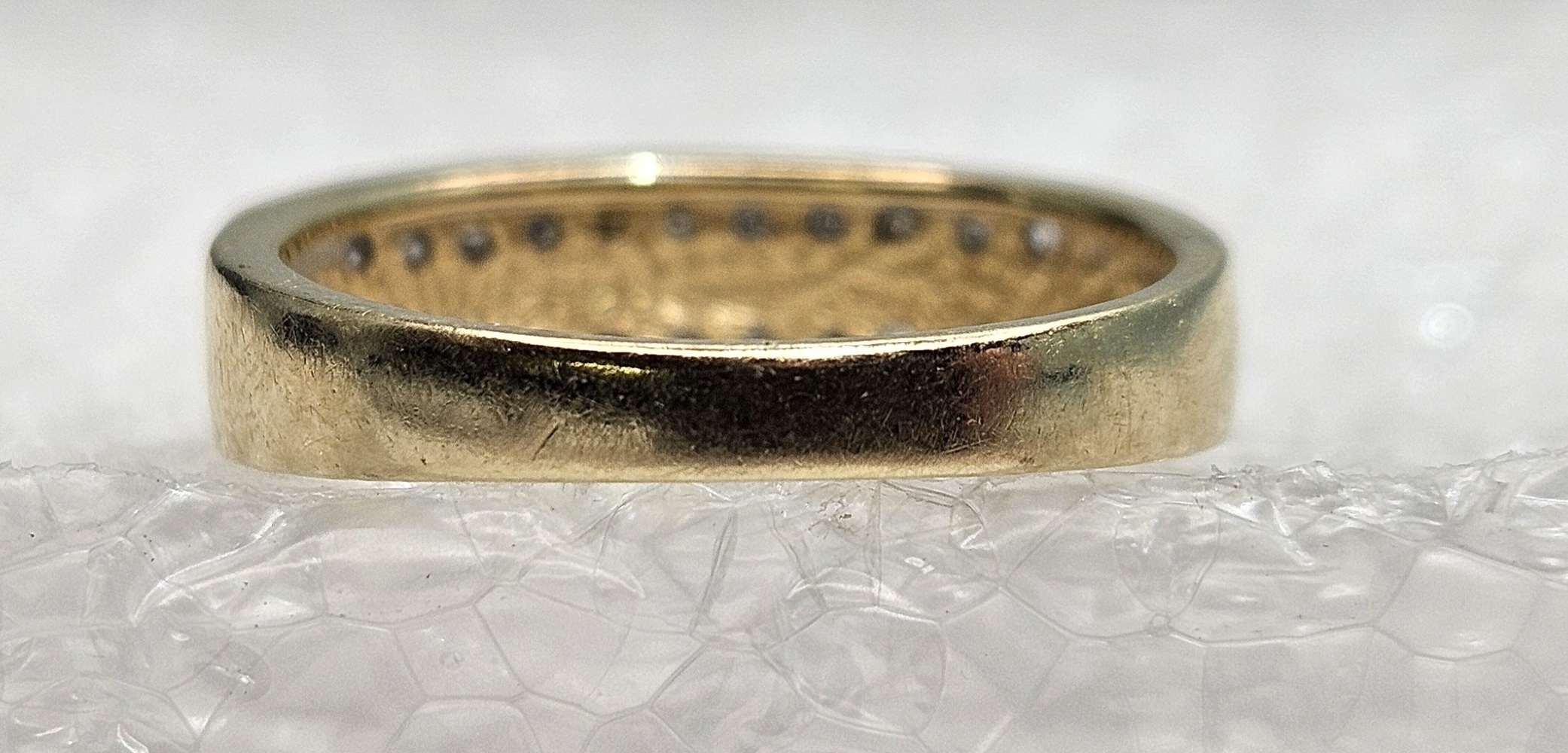This is an exquisite 14k Yellow Gold Band, tastefully embellished with 22 scintillating Diamonds, flawlessly channel-set to perfection. This luxurious piece is an embodiment of classic elegance and timeless charm.