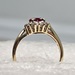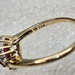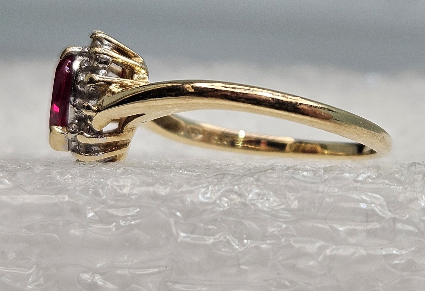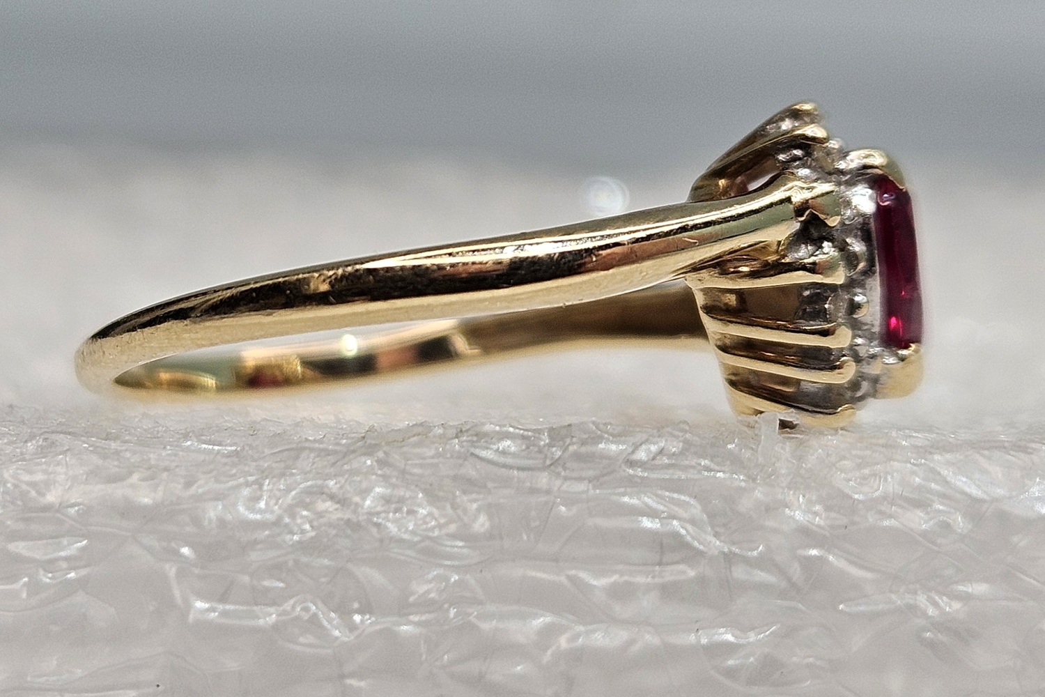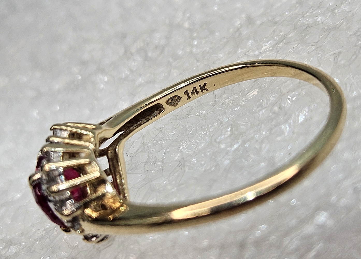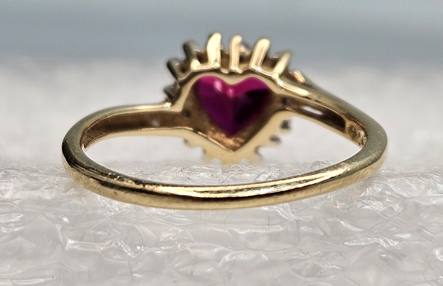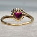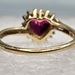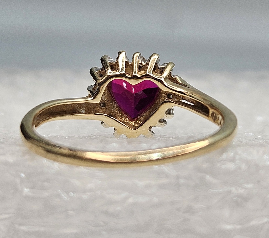 A stunning 14k yellow gold ring featuring a radiant red heart at the center, gracefully encircled by 15 sparkling little diamonds. This exquisite piece combines love symbols with classic luxury, making it a perfect romantic gift or special self-treat.