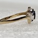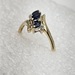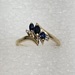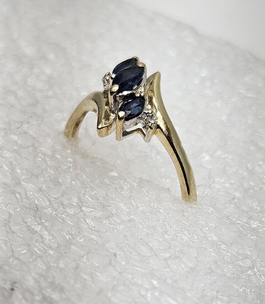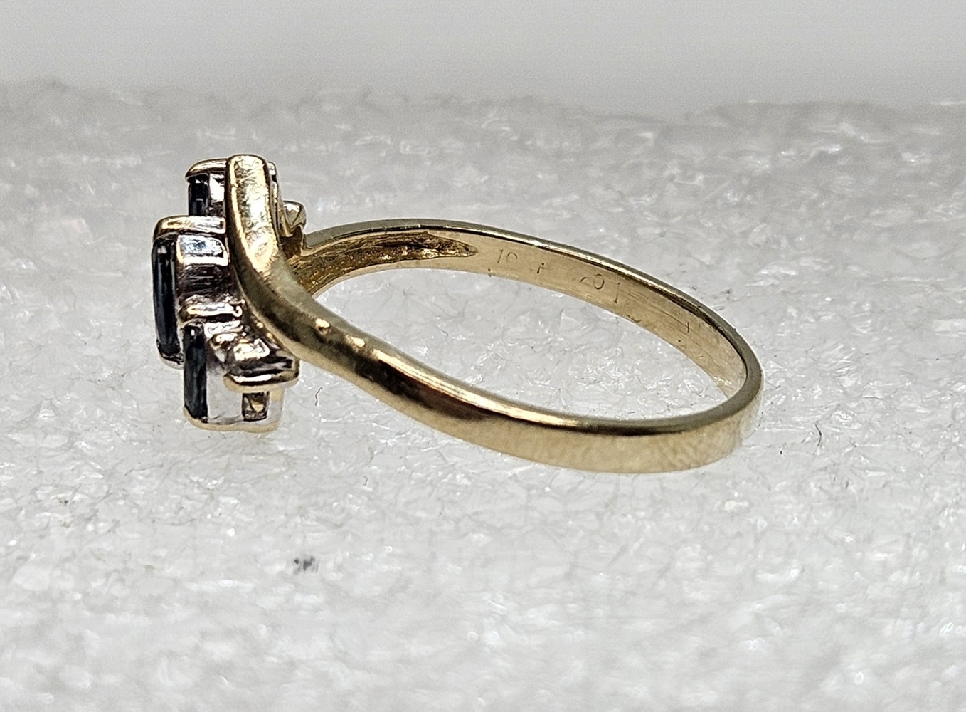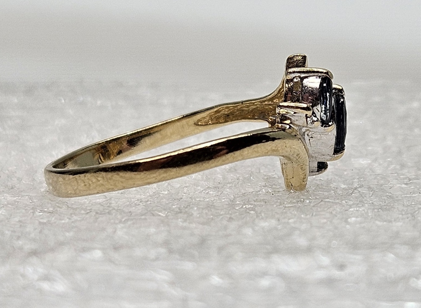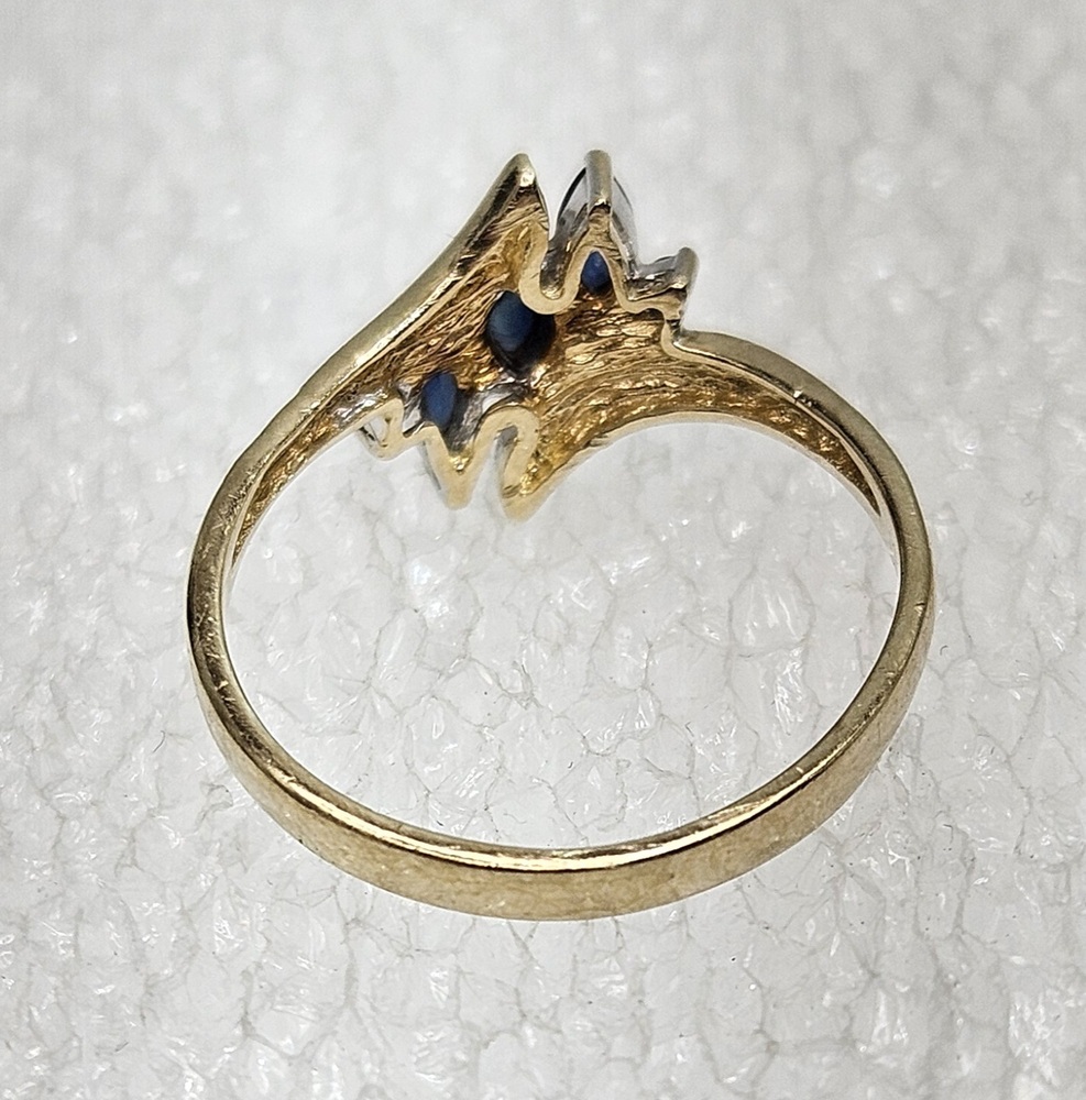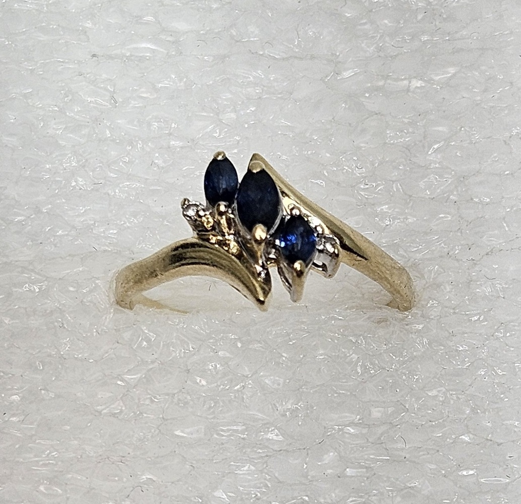 Experience the enchantment of a 14KYG ring, showcasing three exquisite blue marquise cut center stones flanked by clear round side stones. Elegantly crafted in a size 6.5, it offers a timeless expression of grace and style.