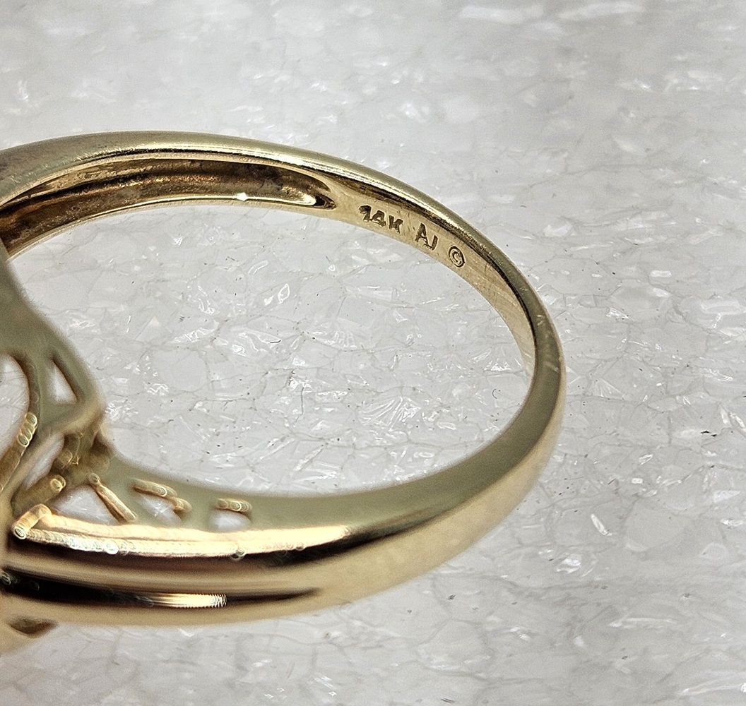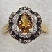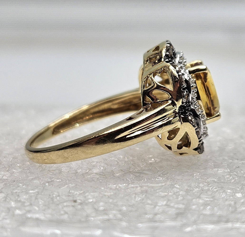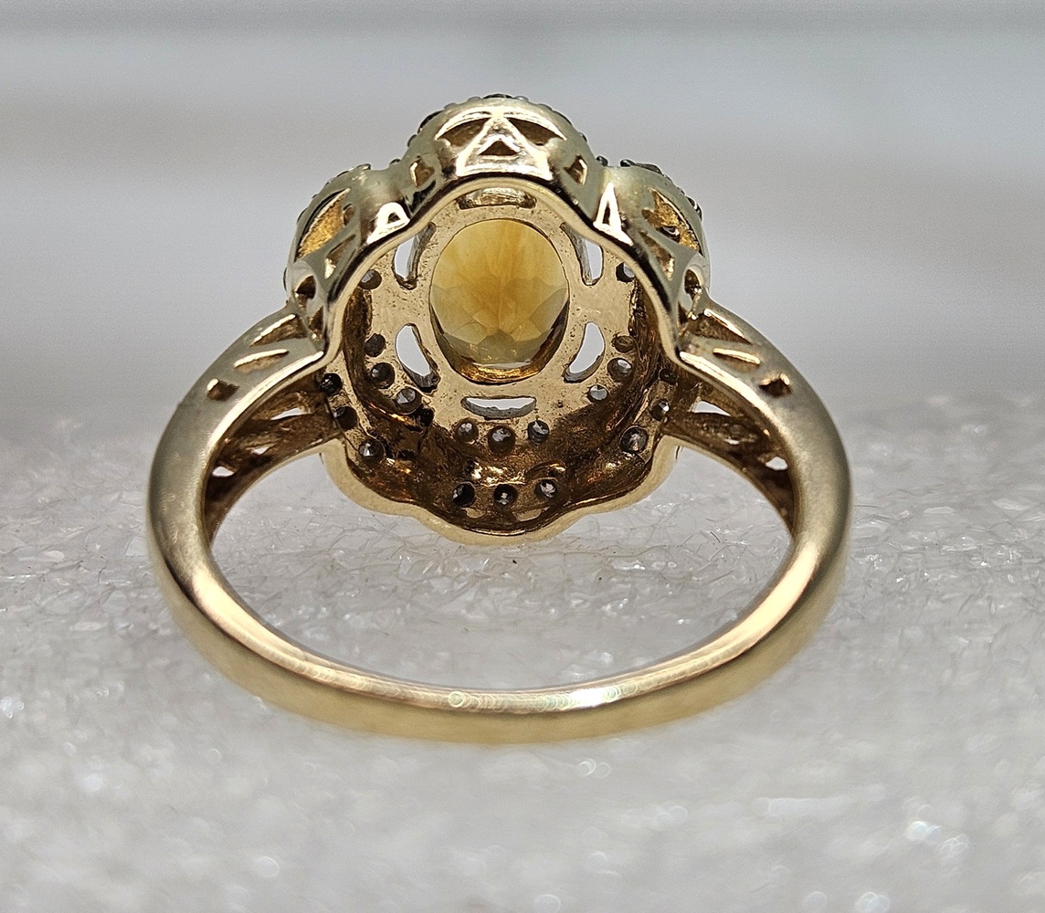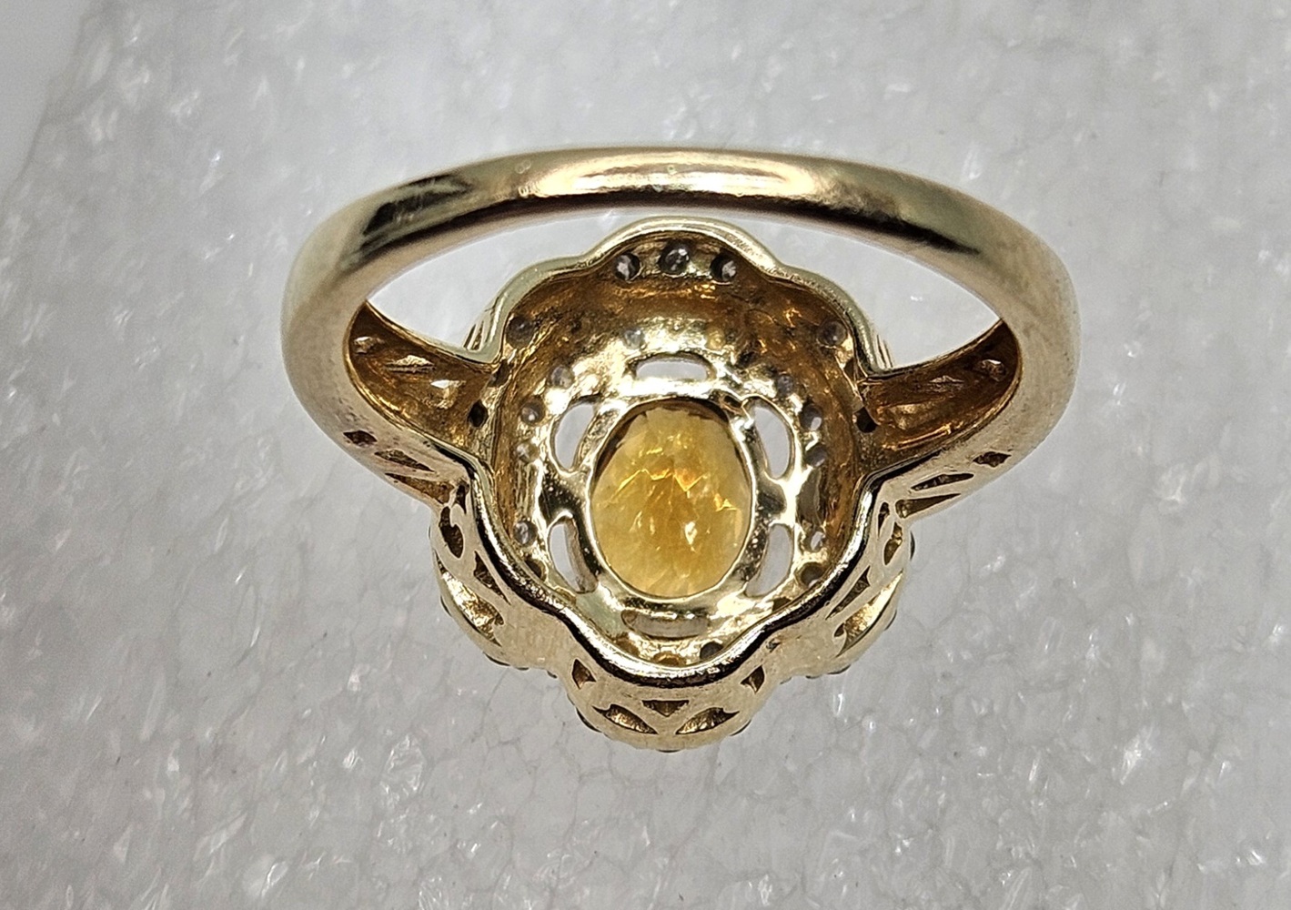 Adorn your elegance with this exquisite 14k yellow gold ring, featuring a mesmerizing bronze oval cut centerpiece. The ring elegantly spotlighted with a celestial halo of sparkling clear and black stones, bestowing a captivating allure. Truly, a beautiful symbol of timeless sophistication.