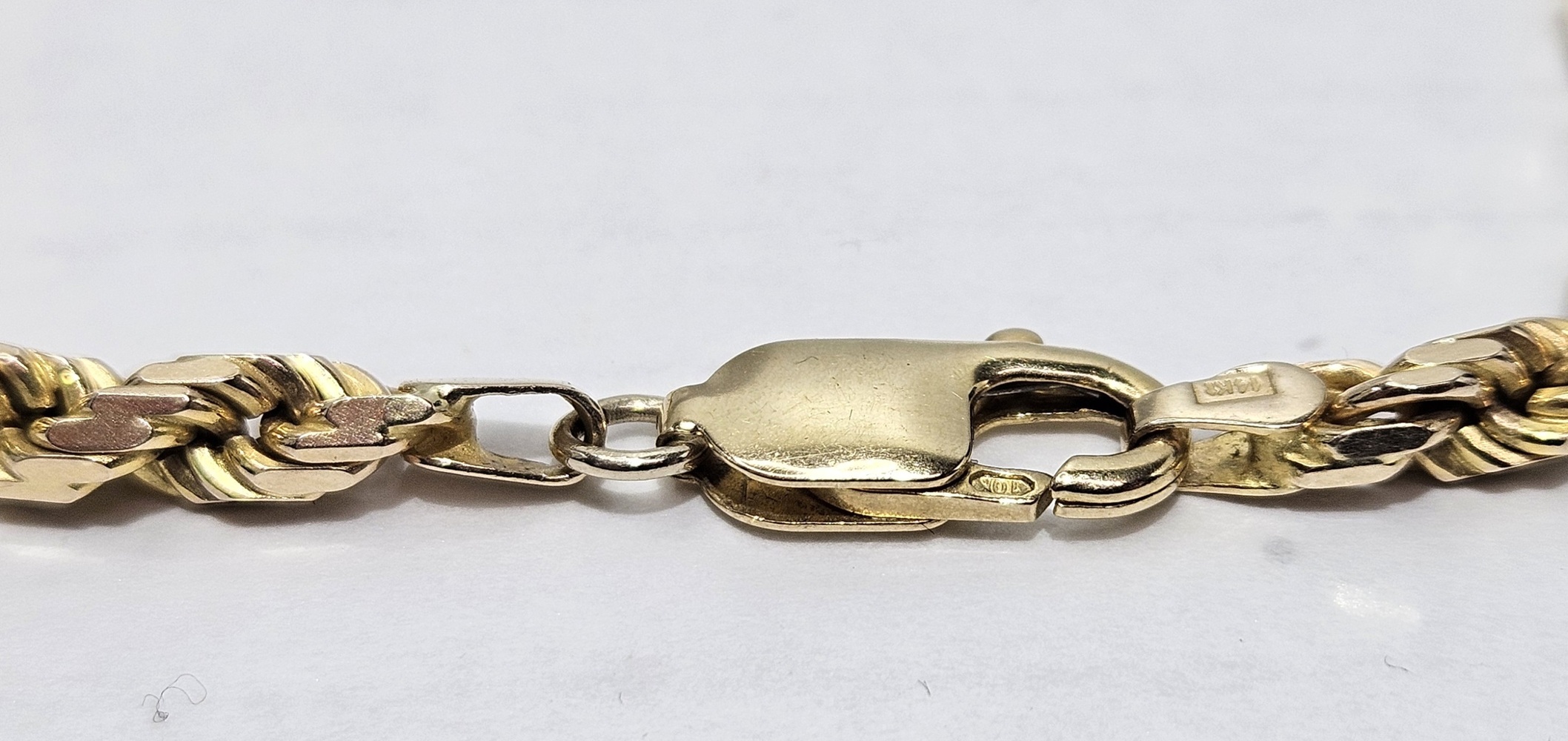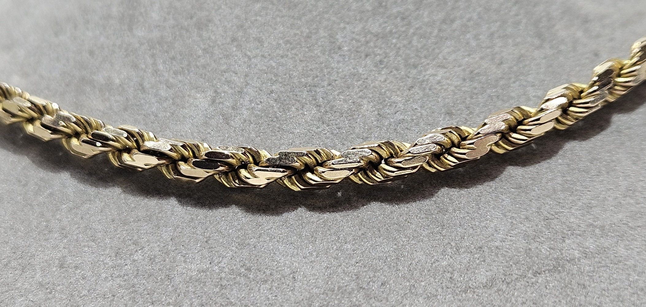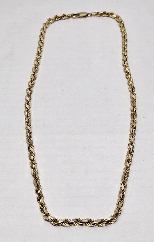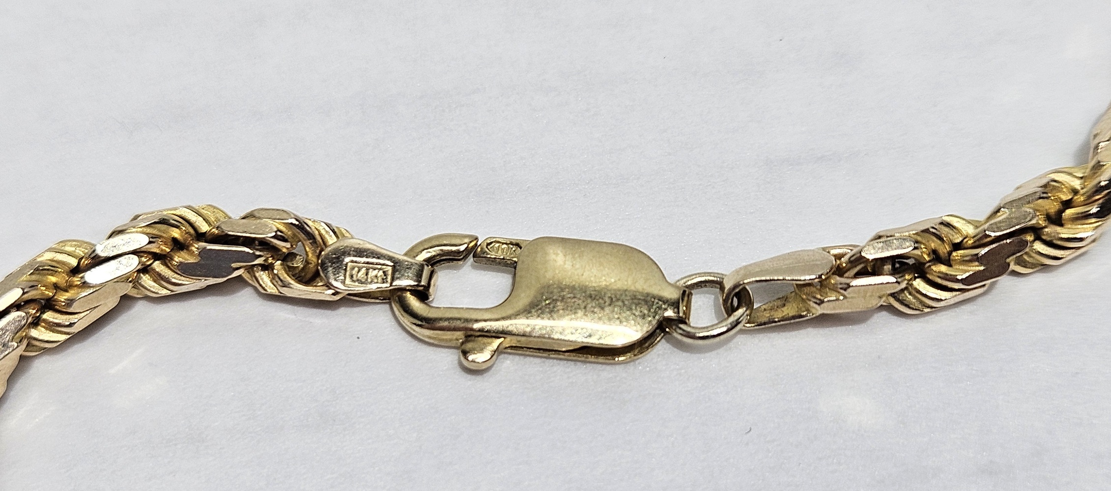 This 18-inch 14k yellow gold rope chain, weighing 47.2 grams, is a luxurious, durable piece. Its intricate rope design showcases the exquisite craftsmanship, providing a classic, elegant style. Perfect for daily wear or special occasions.