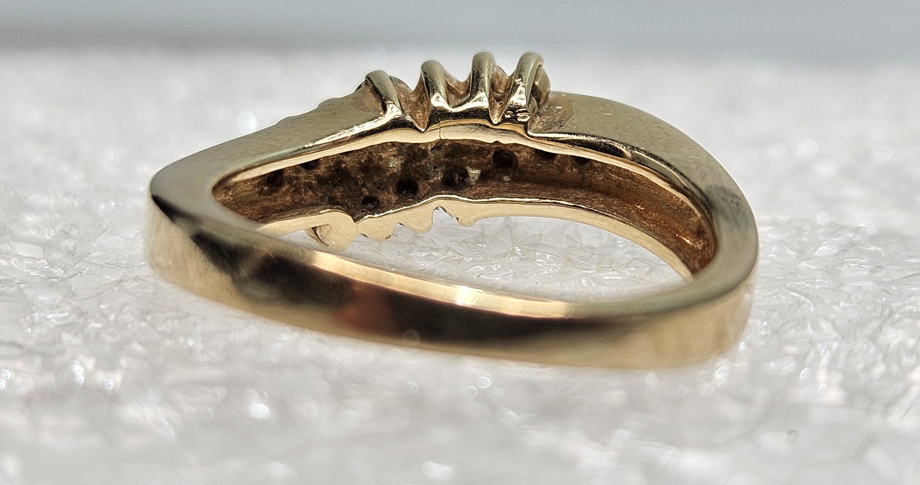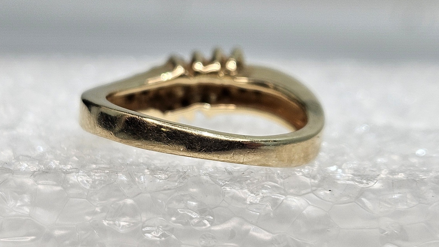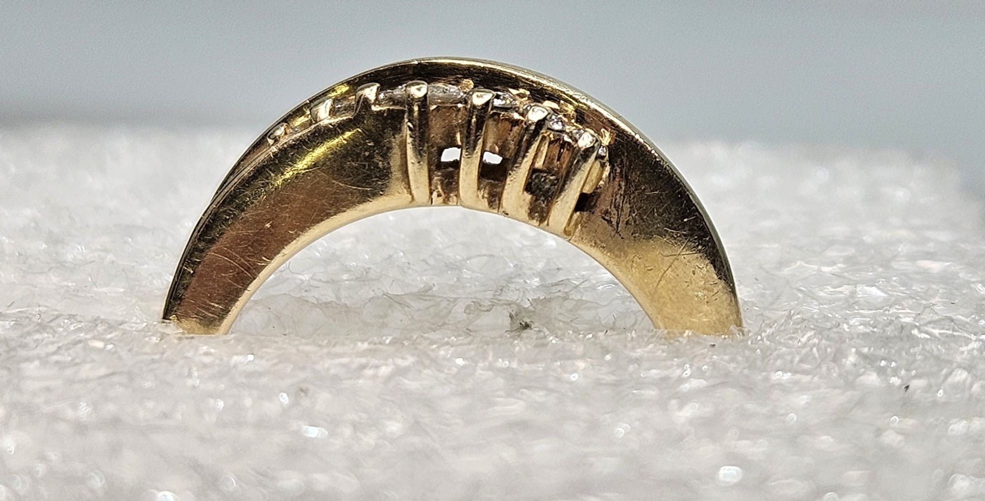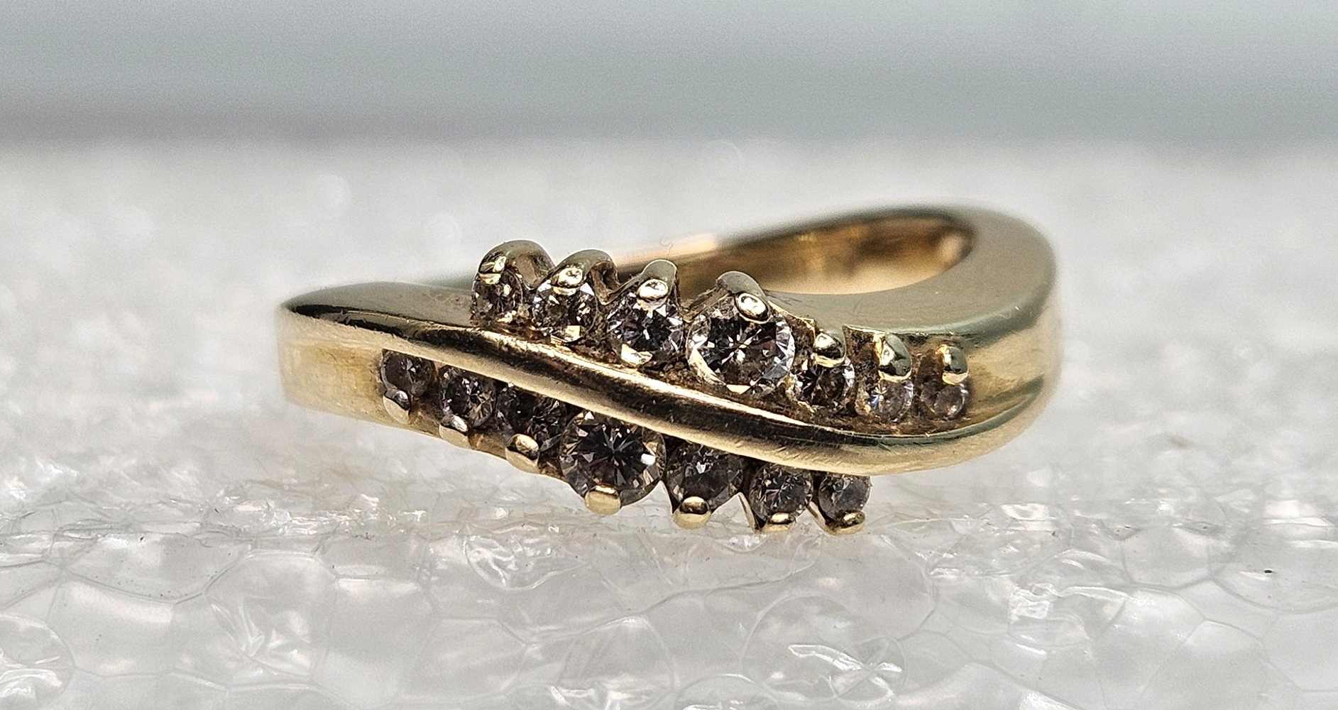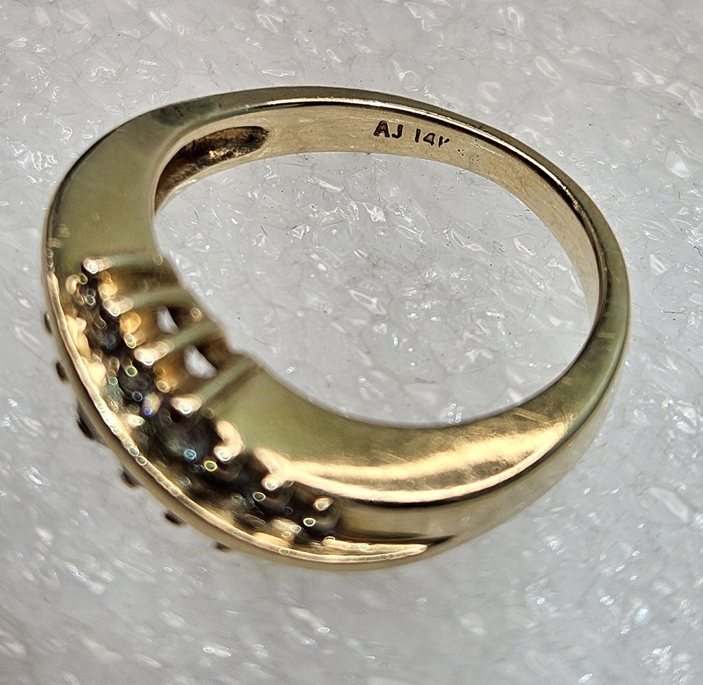 This 14k yellow gold band dazzles with 14 round clear stones embedded across the top. The brilliant stones complement the warm gold shine, creating a sophisticated piece that's perfect for any occasion. An elegant blend of timeless style and modern design.