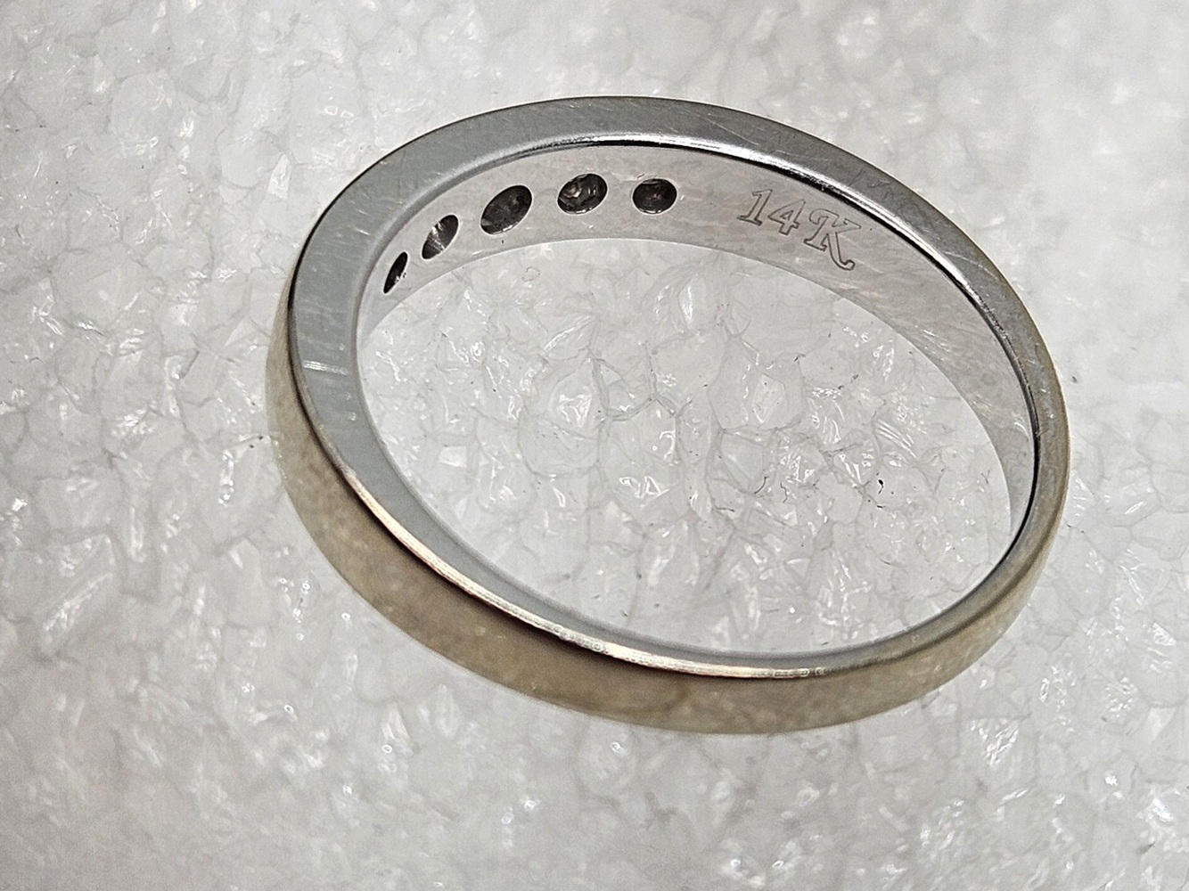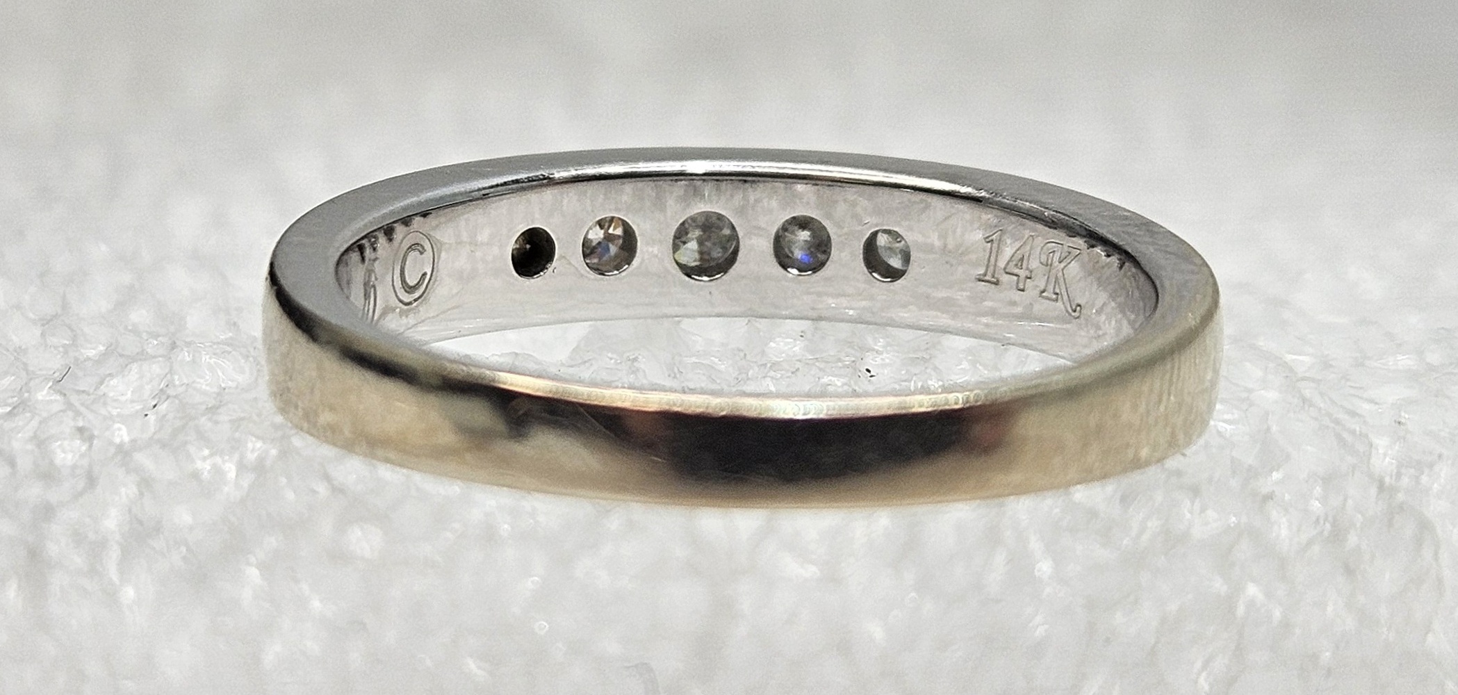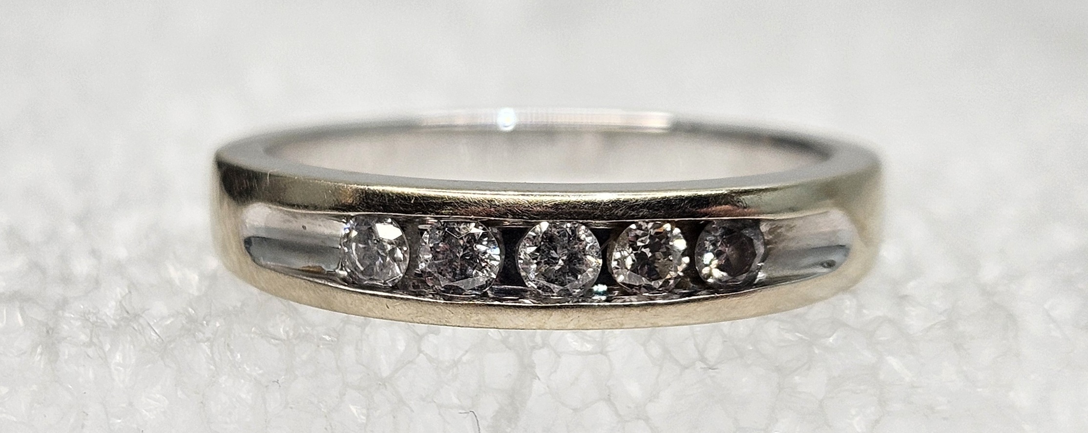 Indulge in the celestial sparkle of this 14k white gold band, adorned with five luminary diamonds, nestled in a chic channel setting - a symphony in brilliance.