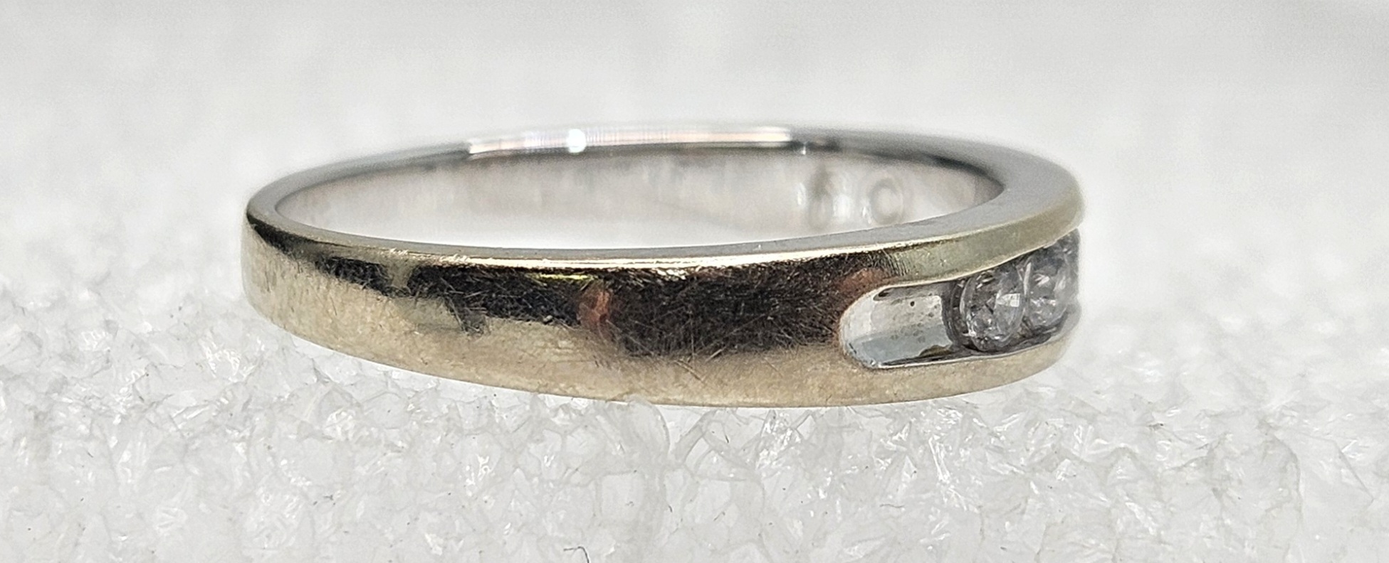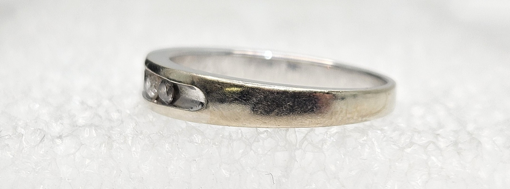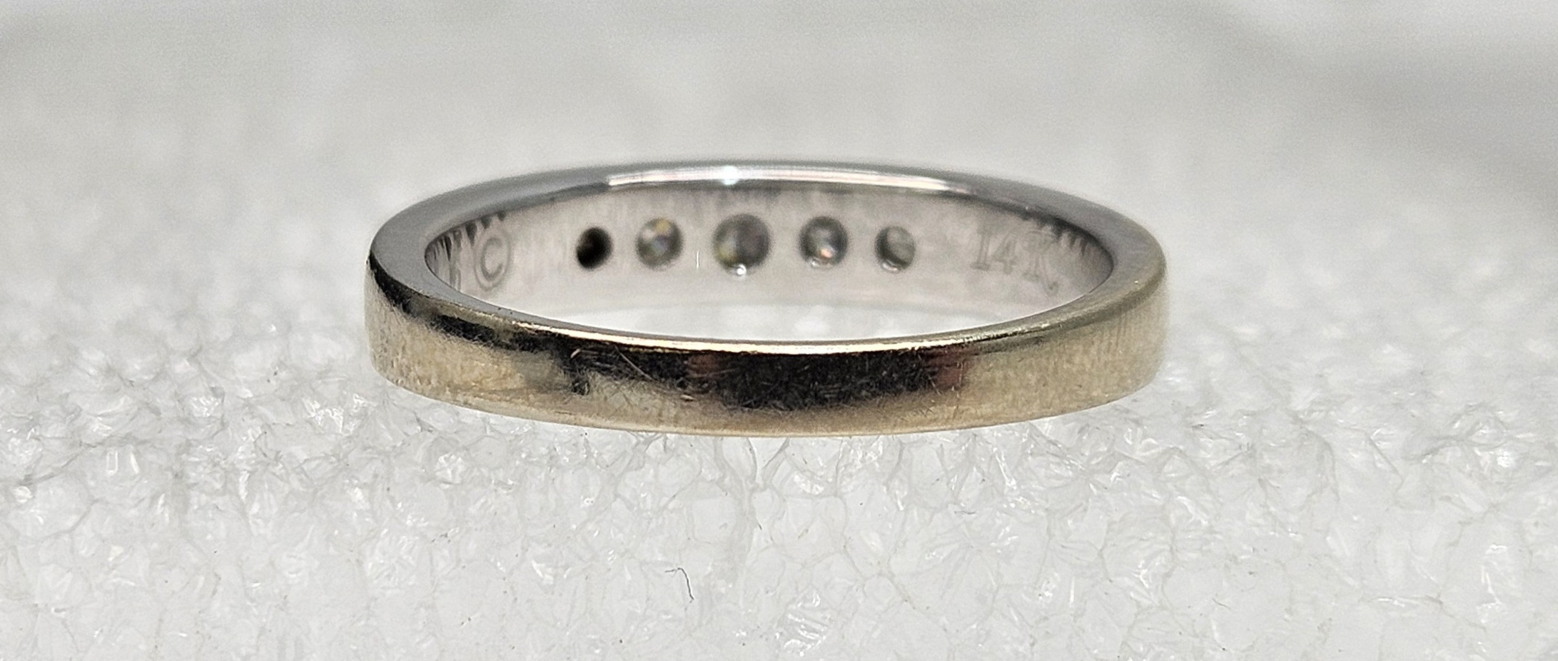 Indulge in the celestial sparkle of this 14k white gold band, adorned with five luminary diamonds, nestled in a chic channel setting - a symphony in brilliance.