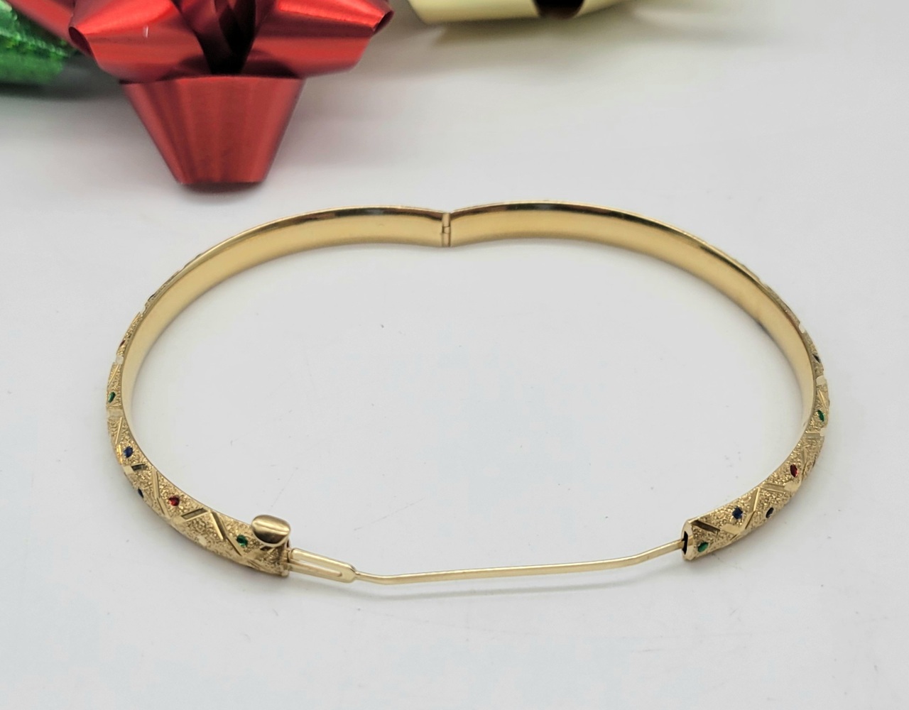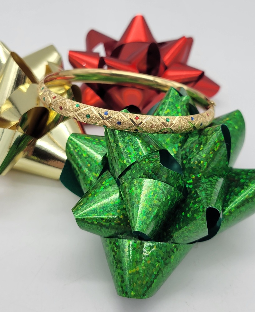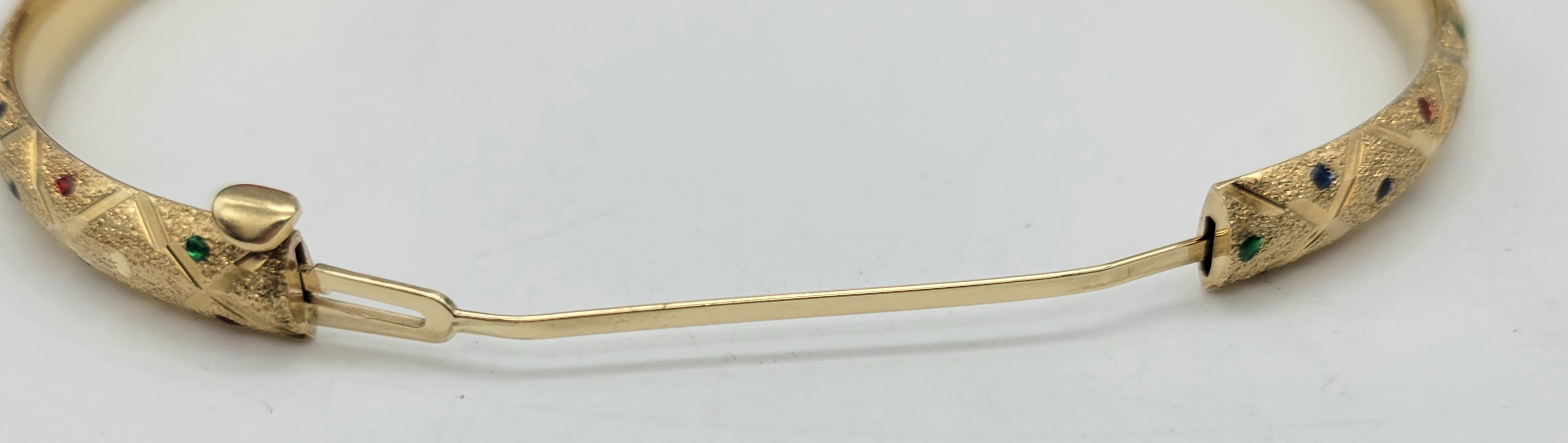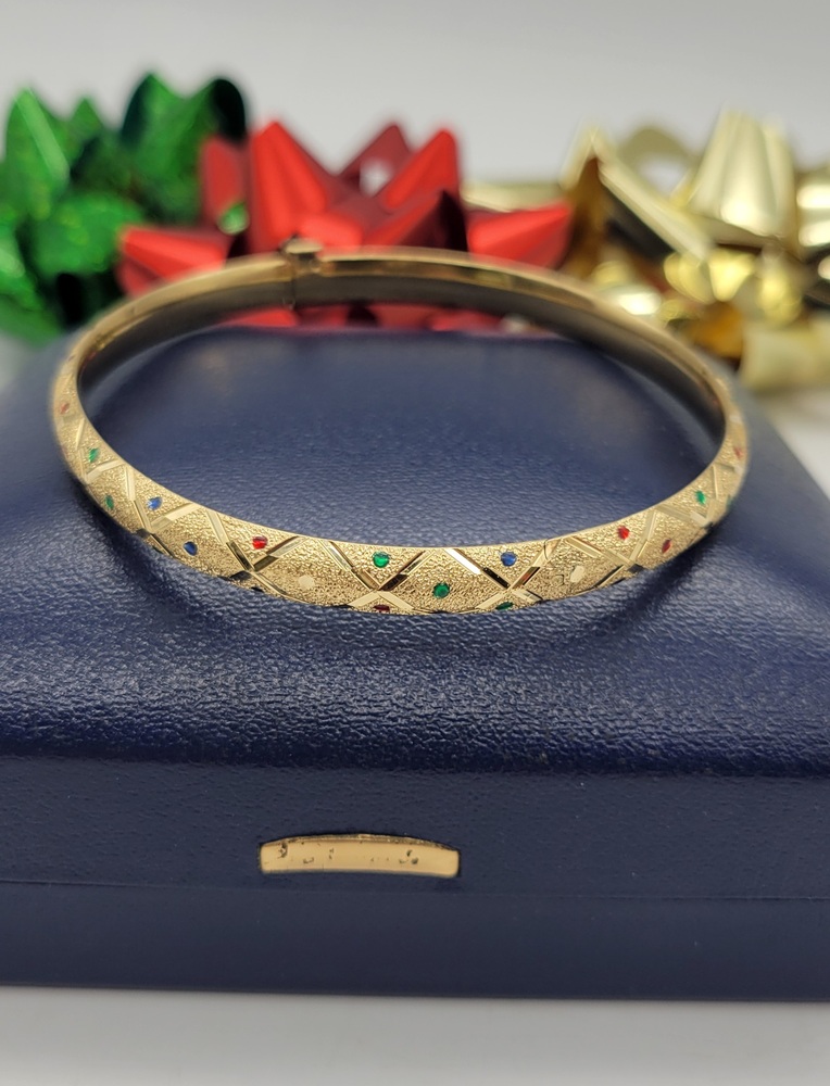 Adorn your wrist with this breathtaking 14k Yellow Gold Bangle, artistically crafted with diamond cut satin finish. Featuring an opulent medley of multi-coloured gemstones, this bracelet embodies luxurious elegance. It's a dazzling piece that whispers timeless fairytale glamour. Shine brilliantly with this bijou in every gesture you make.