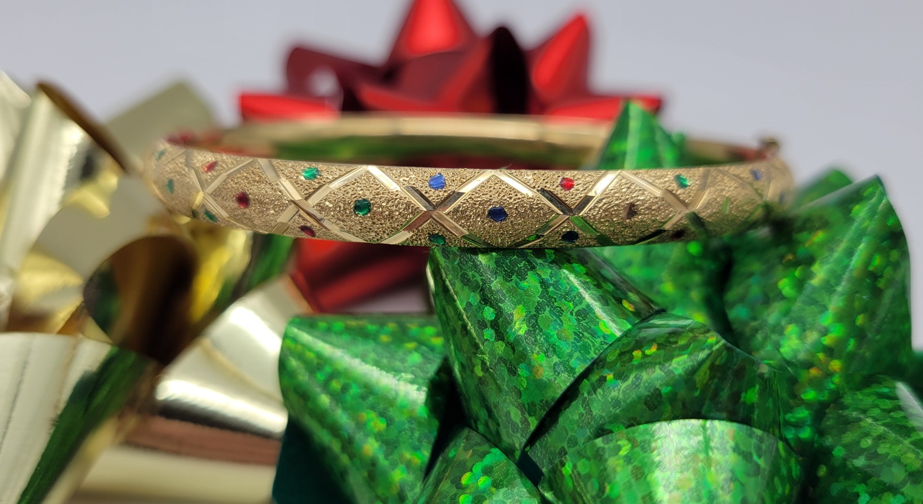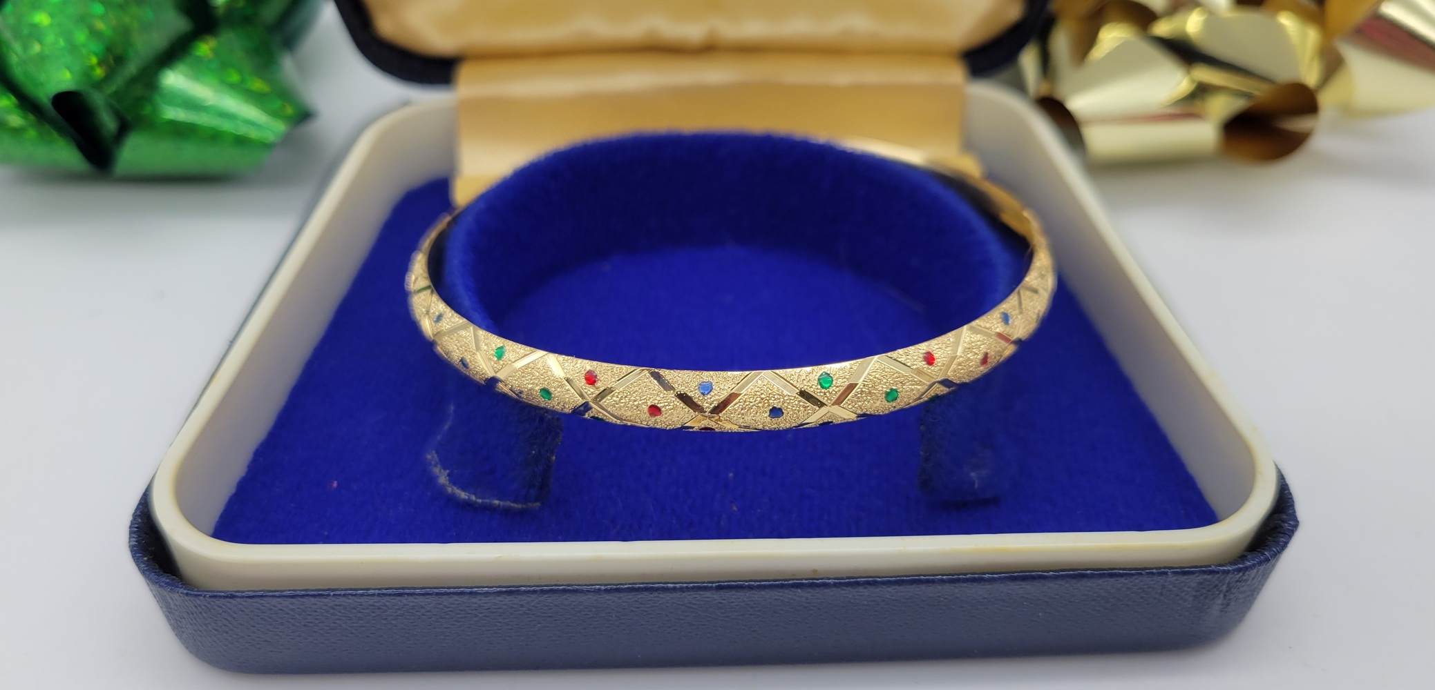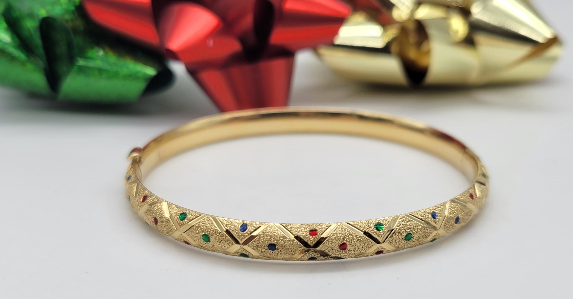 Adorn your wrist with this breathtaking 14k Yellow Gold Bangle, artistically crafted with diamond cut satin finish. Featuring an opulent medley of multi-coloured gemstones, this bracelet embodies luxurious elegance. It's a dazzling piece that whispers timeless fairytale glamour. Shine brilliantly with this bijou in every gesture you make.
