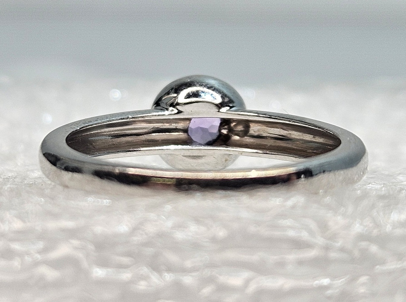 Exquisitely crafted from lustrous 18k white gold, this radiant ring boasts a majestic round purple gemstone nestled at its heart. Astoundingly elegant, it draws upon vintage charm while adding a contemporary flair, becoming an enchanting testament to luxurious grandeur.