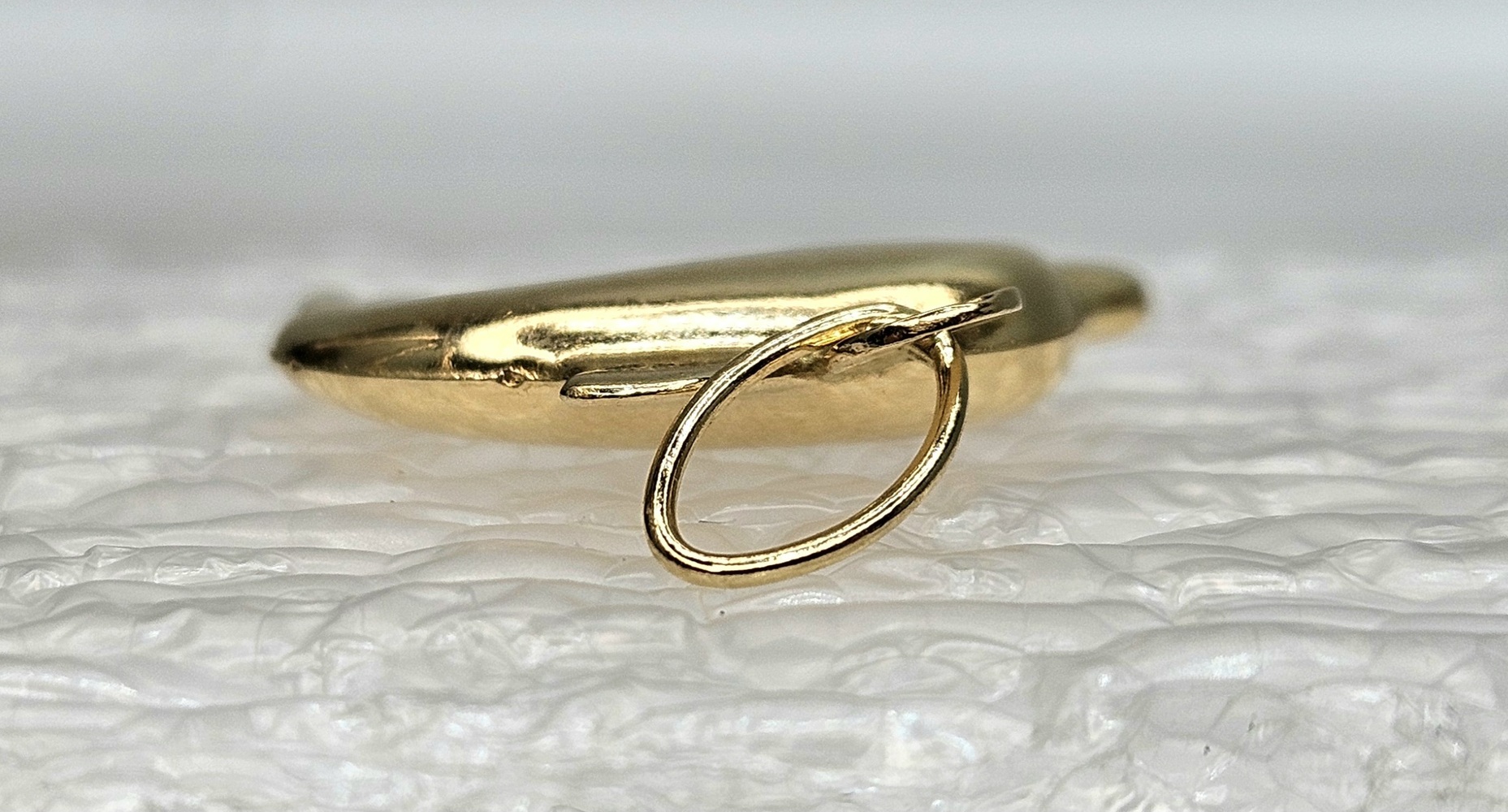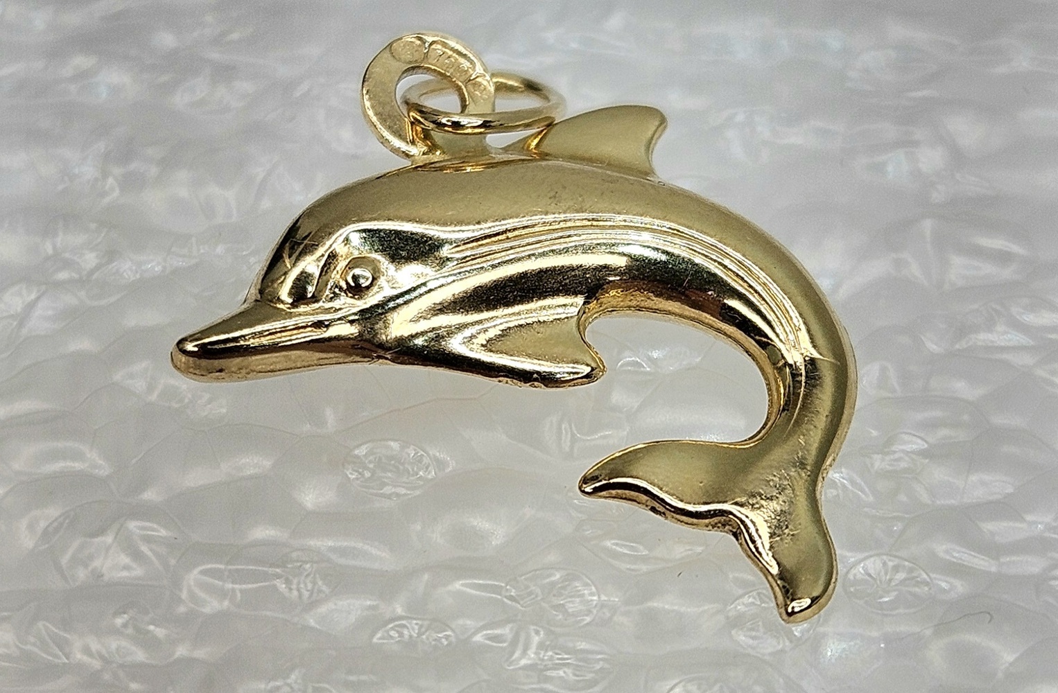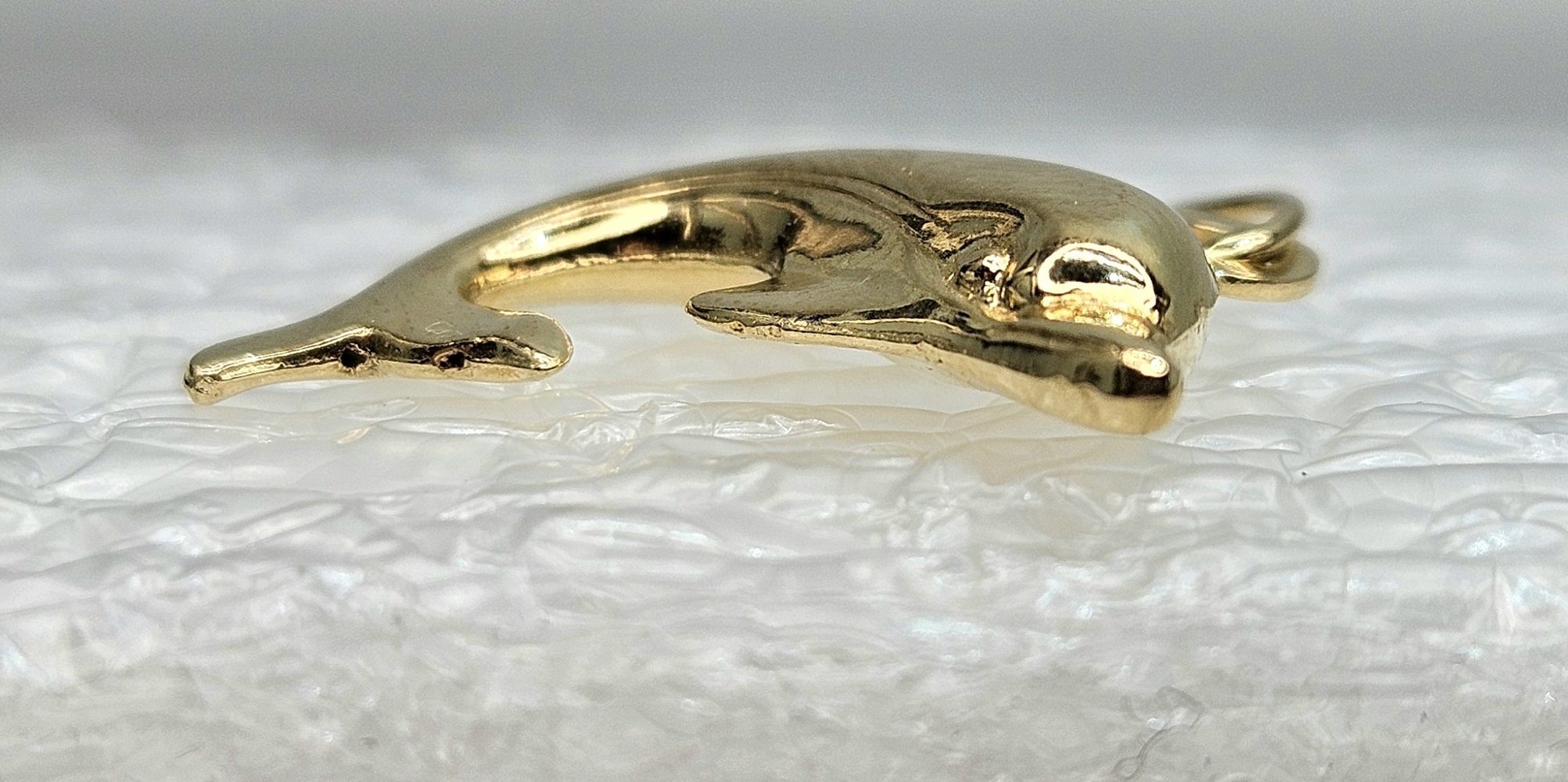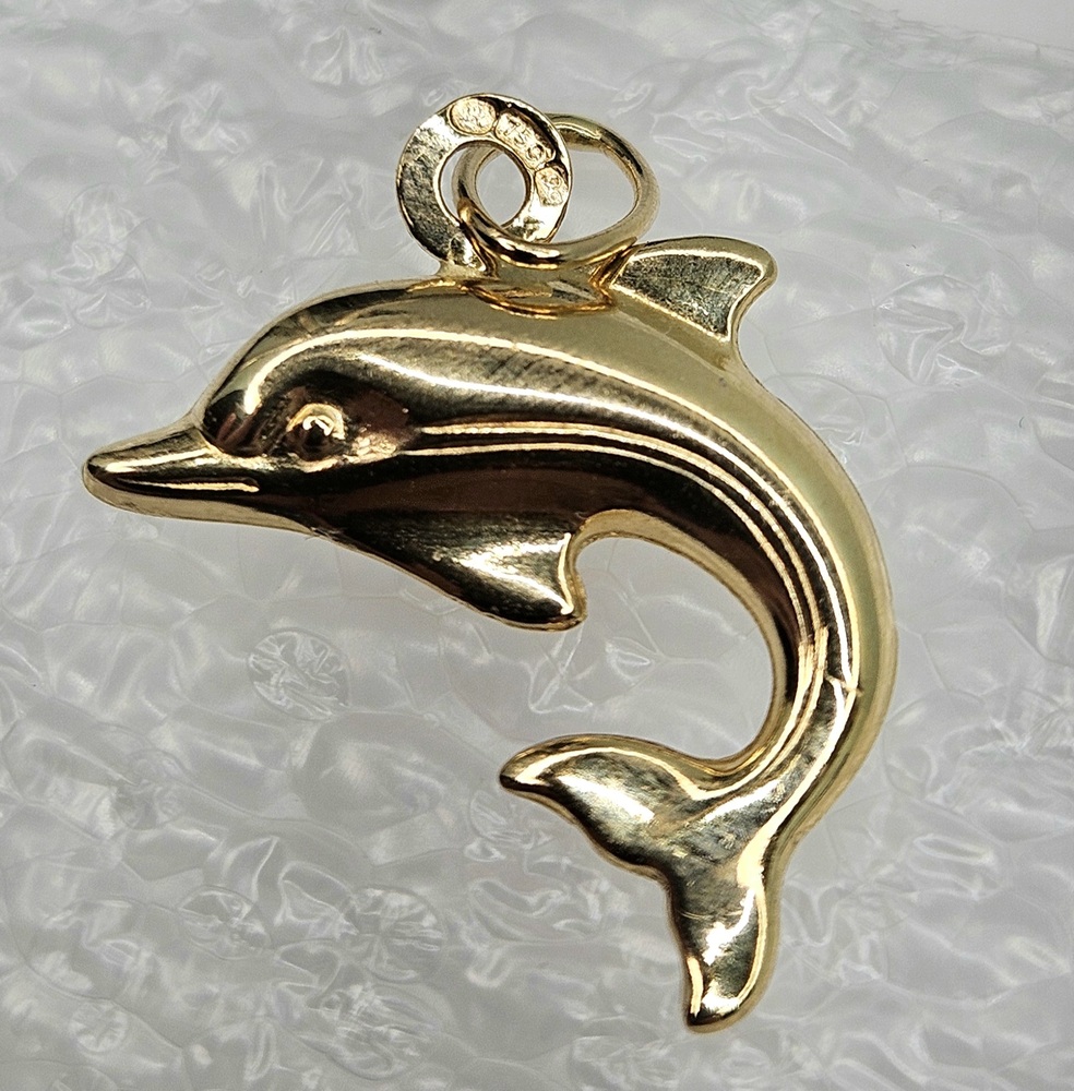 This exquisite dolphin pendant, crafted in 18k yellow gold, embodies elegance and playfulness, ideal for marine enthusiasts seeking a timeless and unique jewelry piece.
