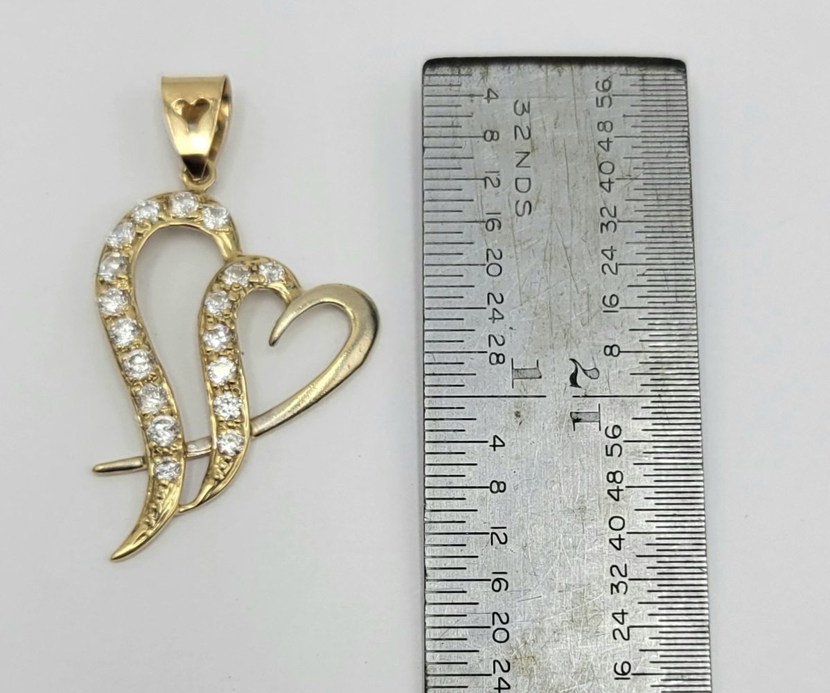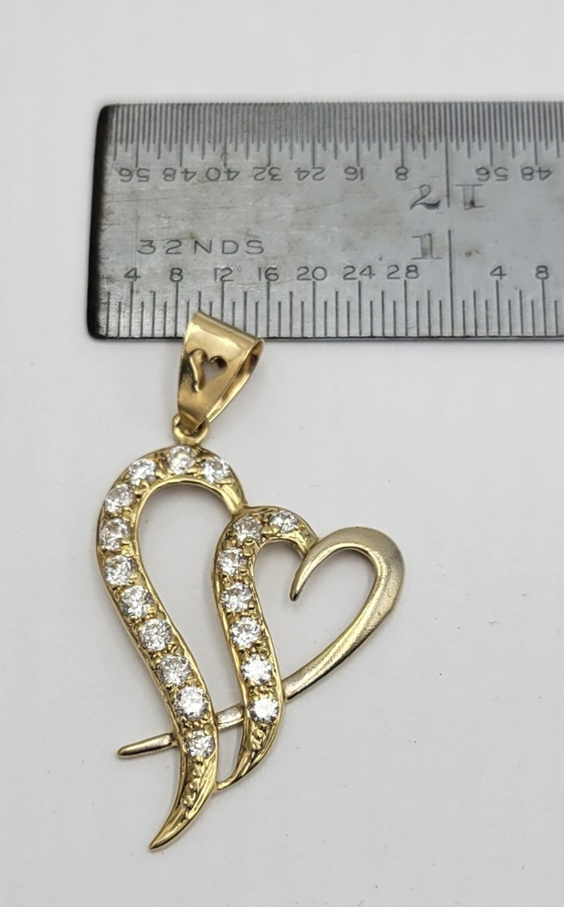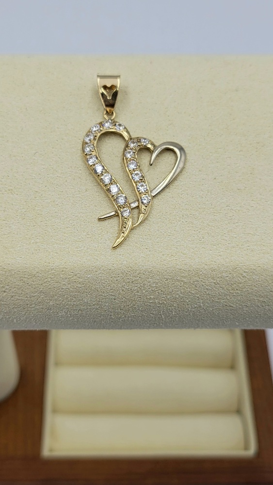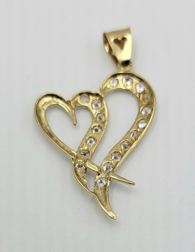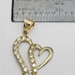 Ignite your allure with a crafted token of love, this 18k Yellow Gold Double Heart Pendant. Dainty yet impactful, this elegantly designed pendant is accentuated with scintillating clear round gemstones. This treasure symbolizes love's unstoppable force, an amorous connection bound by gold and lit with gemstones. A radiant addition to any outfit, it's destined to dazzle!