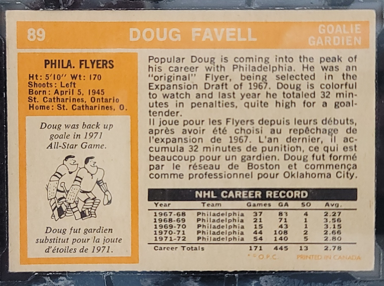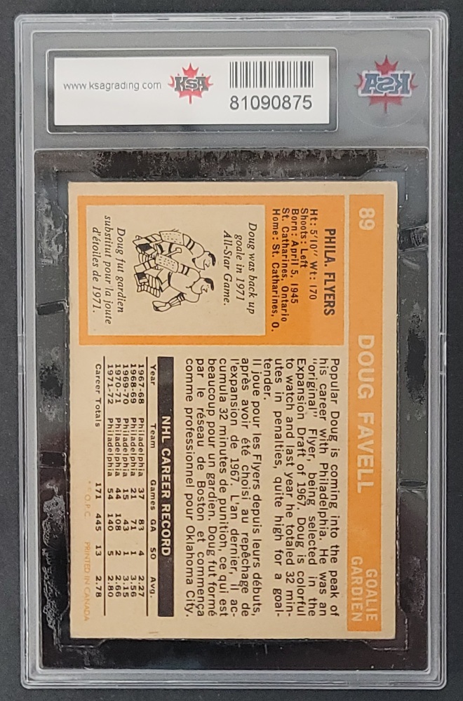 1972-73 O-Pee-Chee Doug Favell #89 Philadelphia Flyers KSA Graded 6 ENM | Avenue Shop Swap & Sell