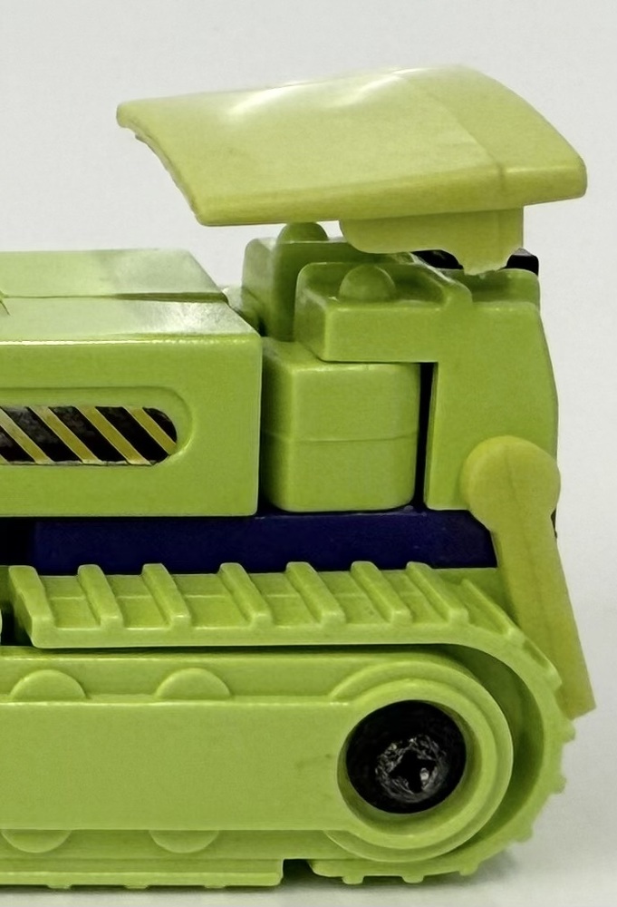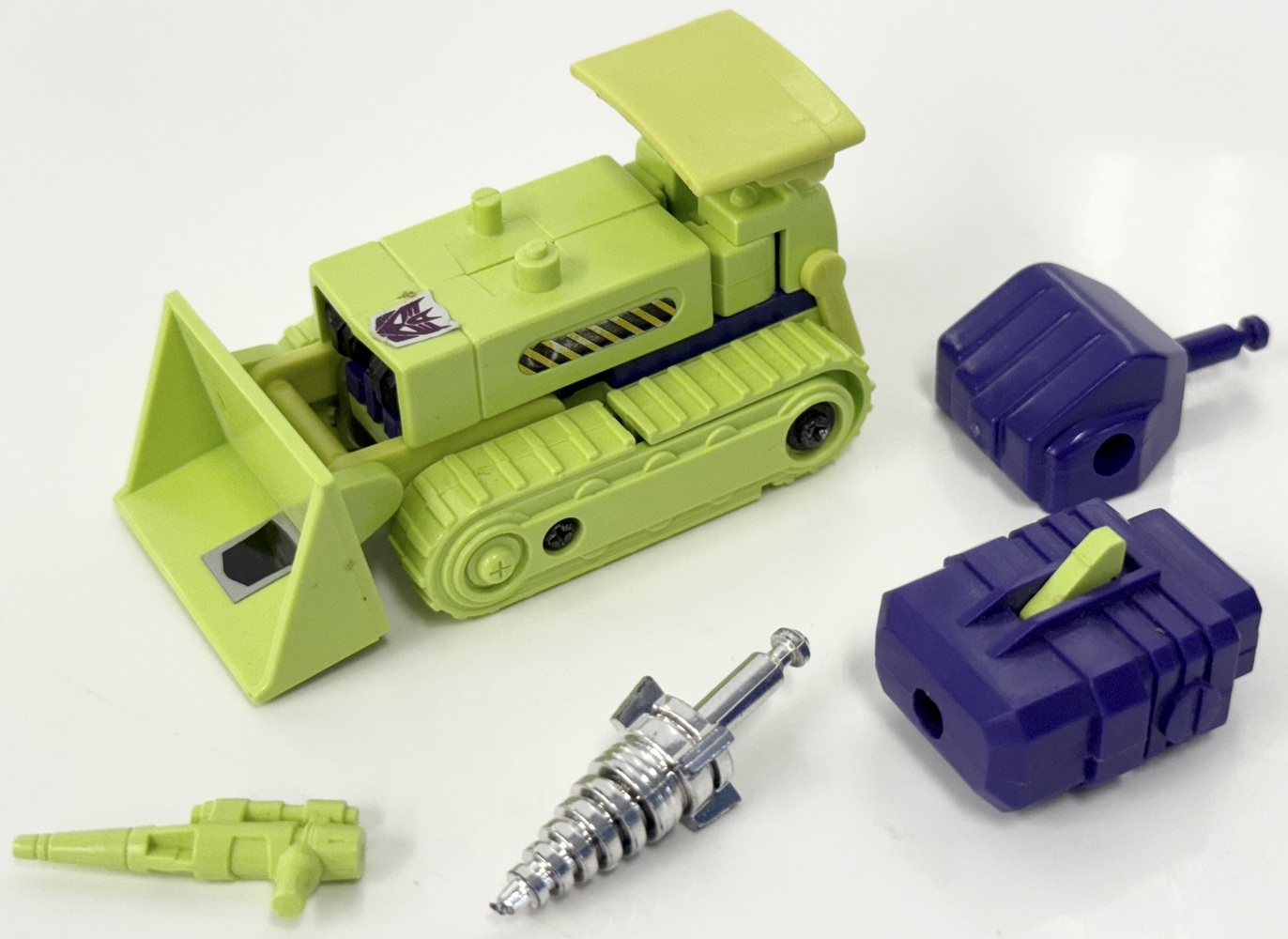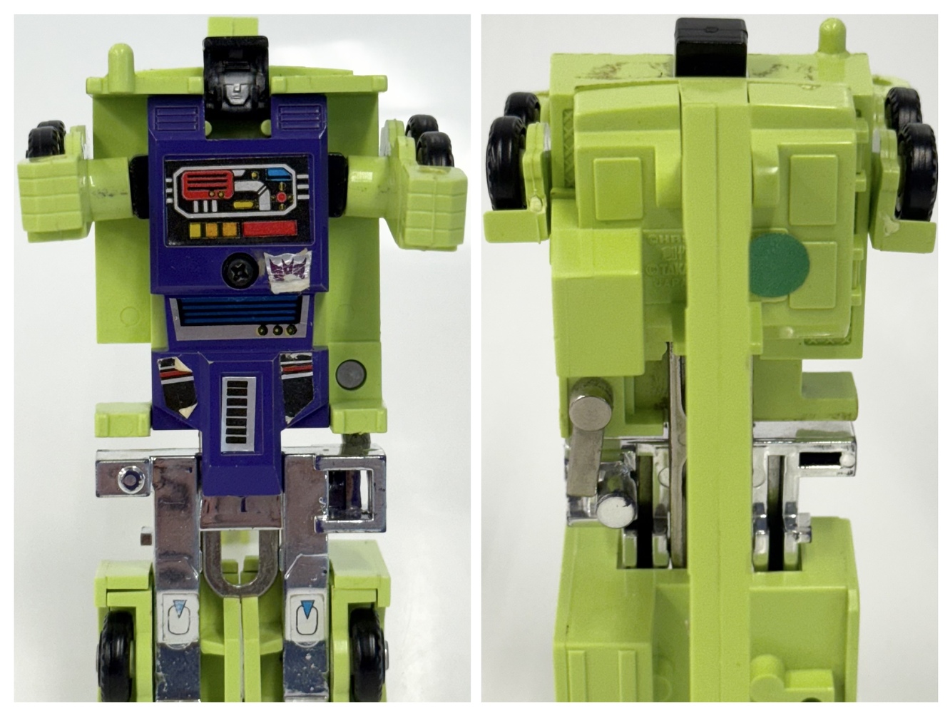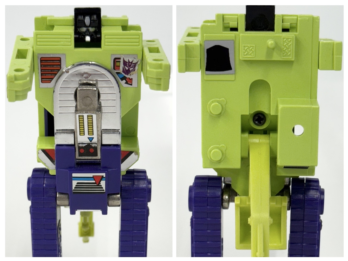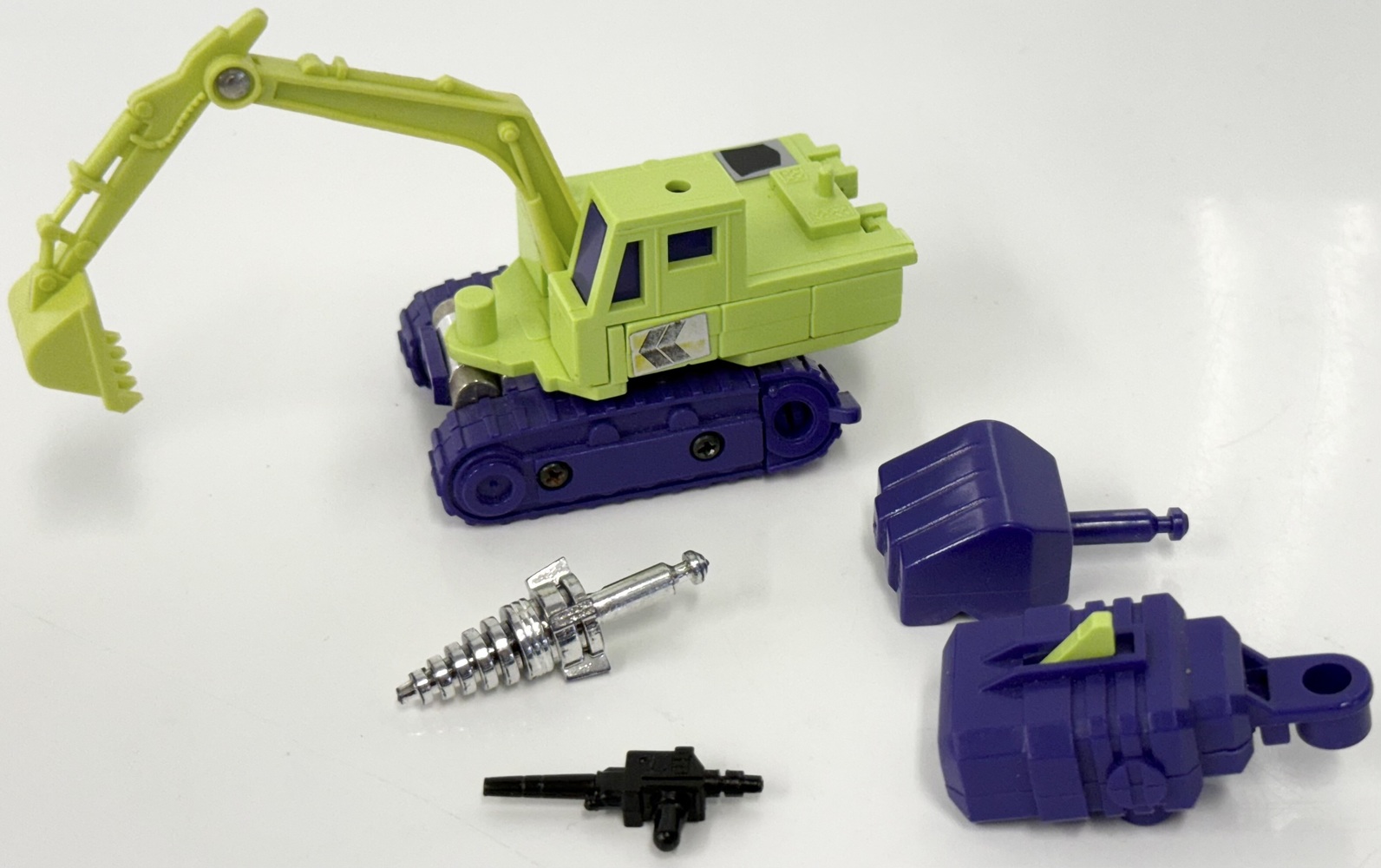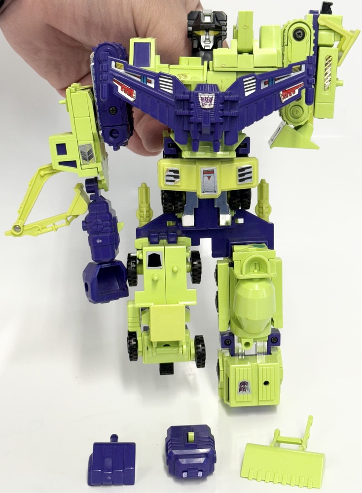 Please also note, when assembled, the Devastator figure cannot stand on it's own, as the foot portion of the left foot (shovel of the Scrapper action figure) has broken off.