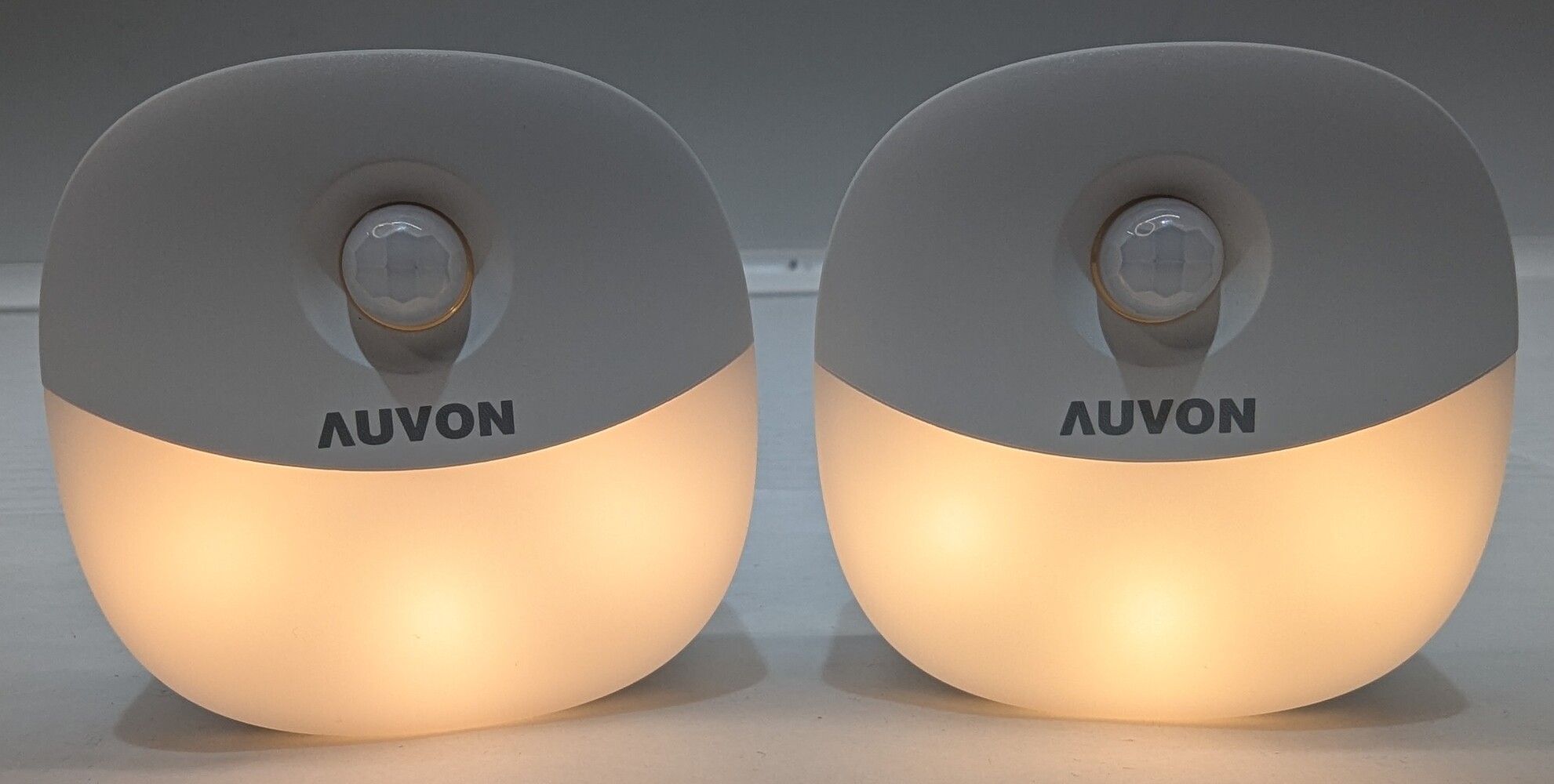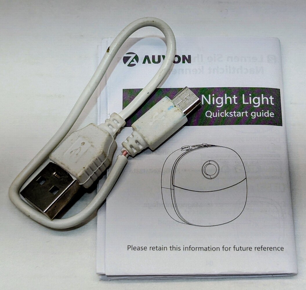 Included: 2 AUVRON motion sensor night lights, 1 microUSB cable, instruction manual