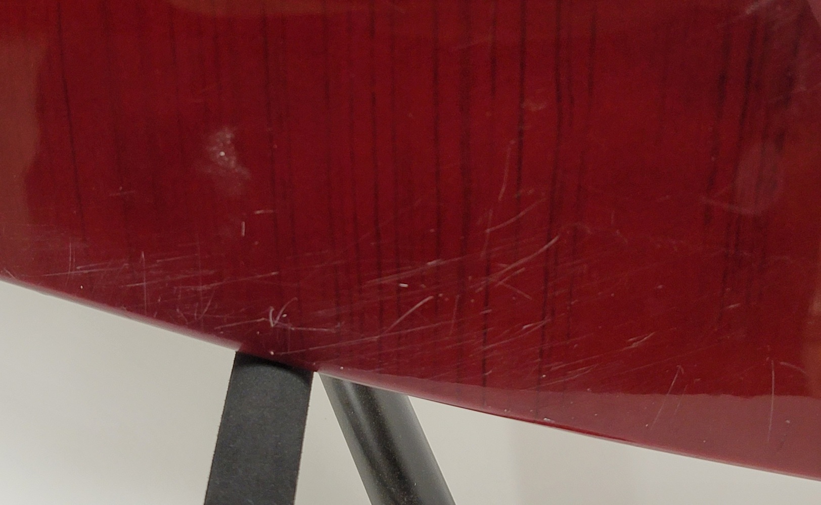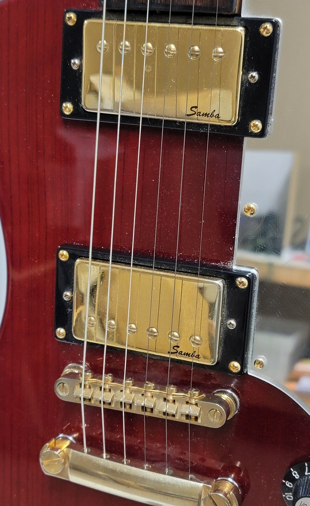 There are scuffs on the back of the body as well as on the pickups from playing and a chip in the paint on the back horn
