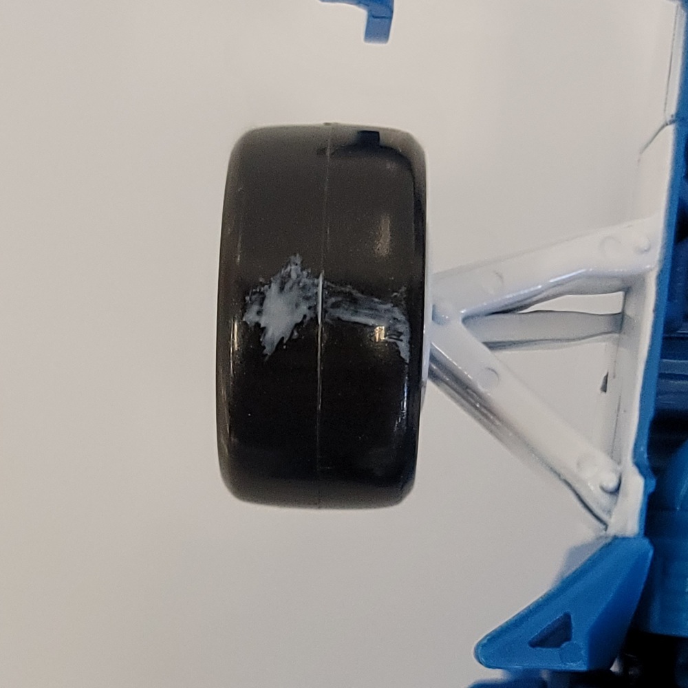 Some of the body hinge points are loose and there is white paint on 1 of the tires