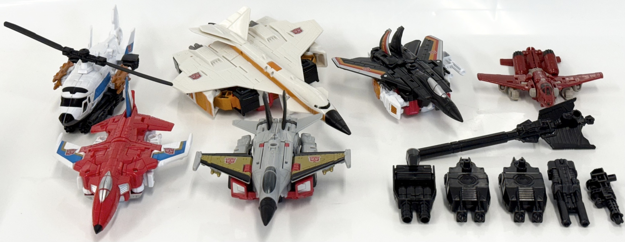 This listing includes the Powerglide, Silverbolt, Air Raid, Firefly, Skydive, and Alpha Bravo action figures, and all manuals, backerboards, guns, and cards for each figure.