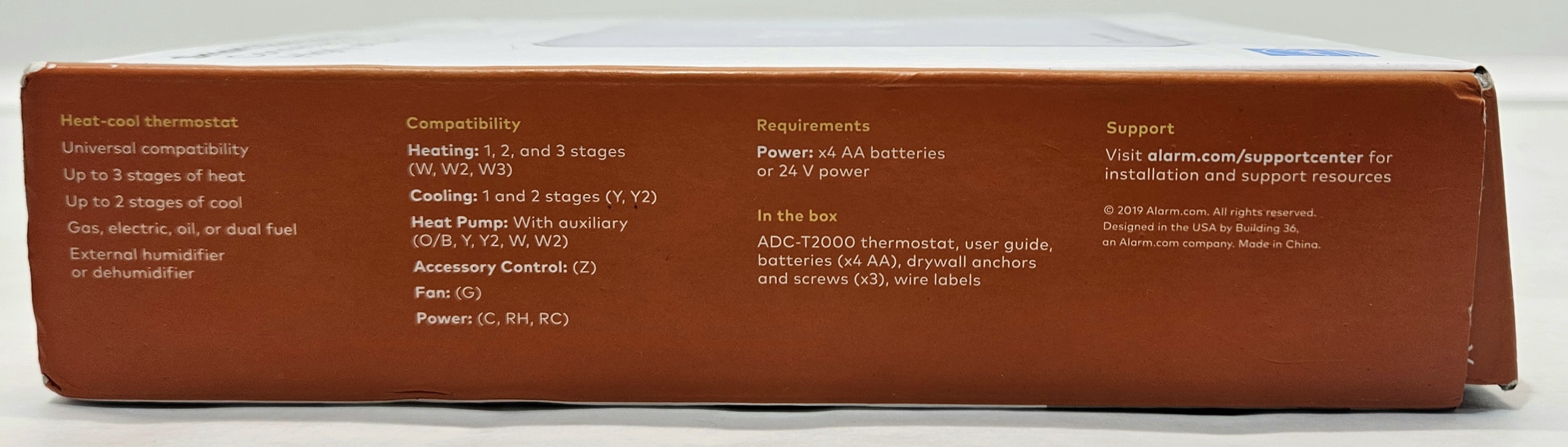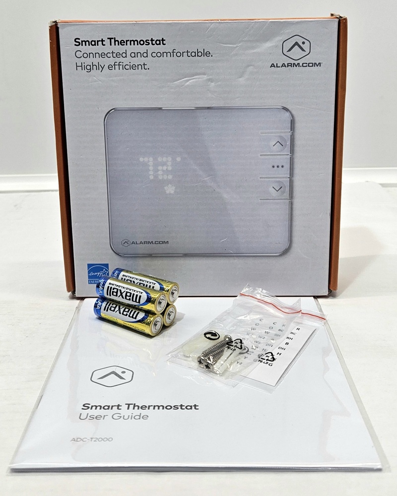 Included: ACD-T2000 thermostat with back plate, Drywall anchors & screws, 4 AA batteries, Wire labels, User guide, Original packaging