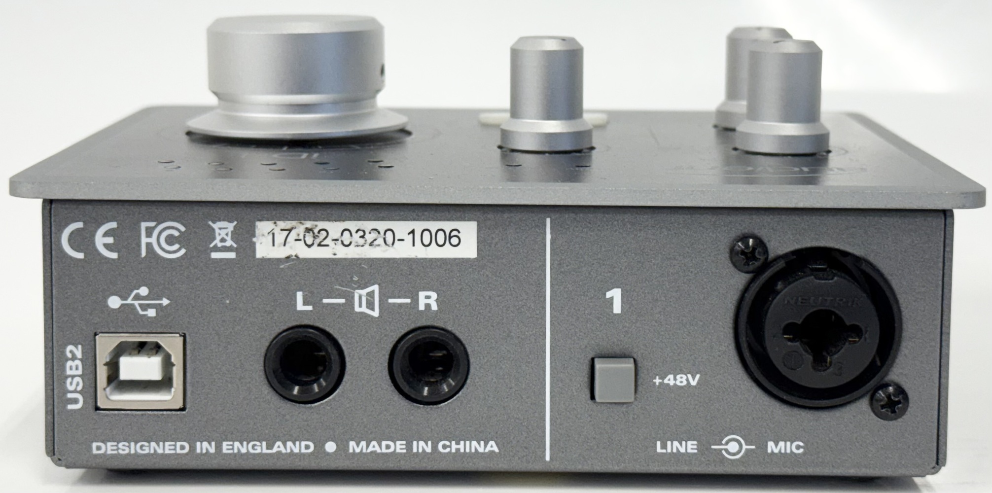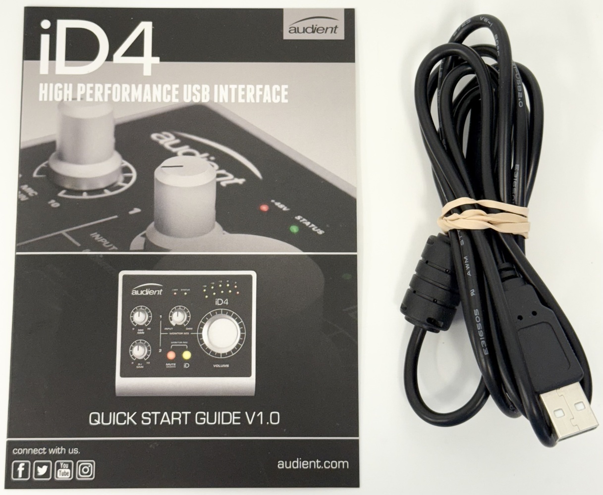 This listing includes the audio interface, a USB 2.0 to USB cord, the quick start guide, and the box.