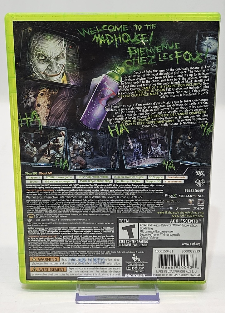Batman: Arkham Asylum is an original adventure with fast action and large-scale combat sequences, played from a close third-person perspective in a dark, survival horror-styled setting. The game begins as Batman delivers the Joker to Arkham Asylum, Gotham City's psychiatric hospital for the criminally insane. The villain springs a trap and takes over the institution, with an army of thugs and a host of dangerous inmates to back him up.