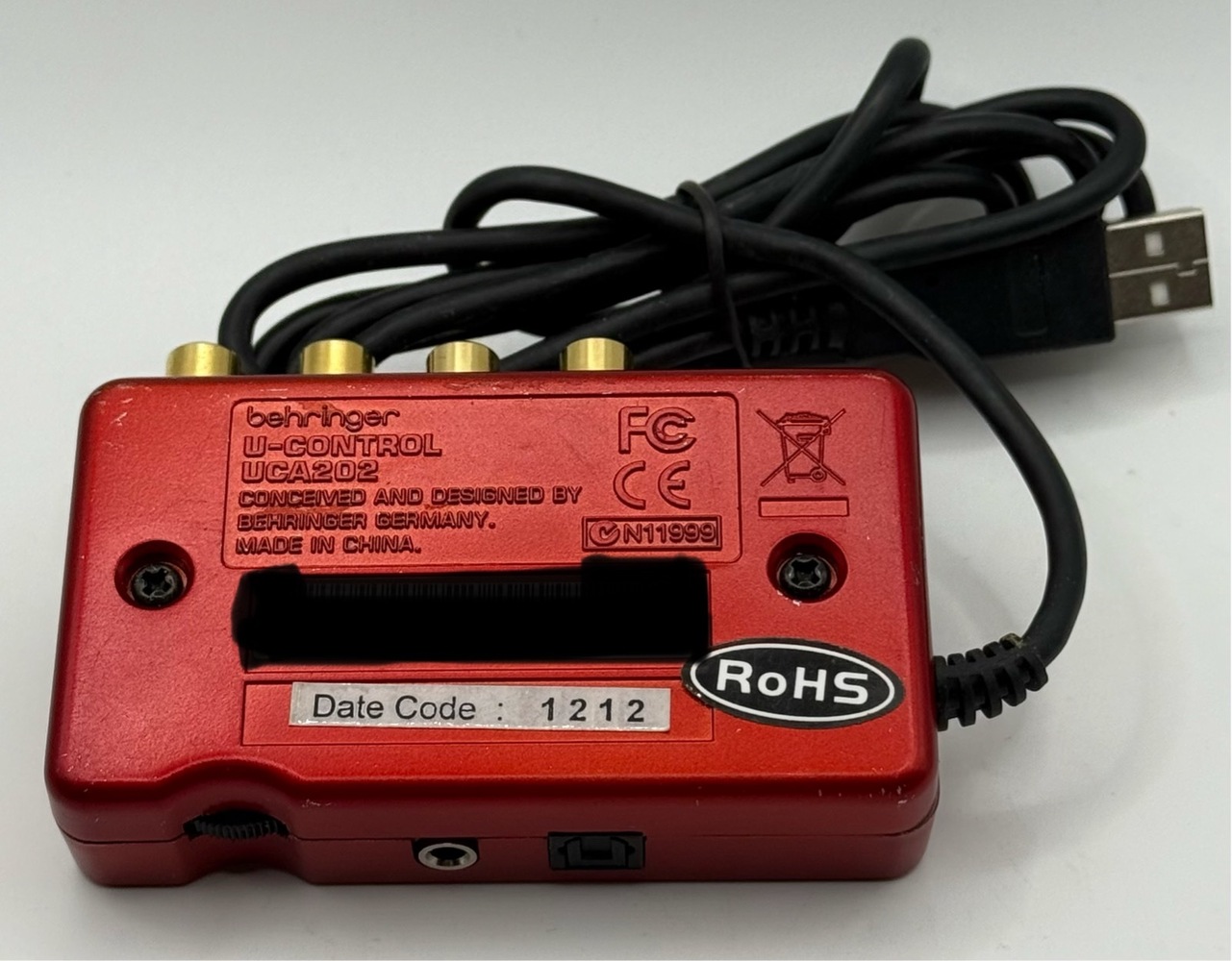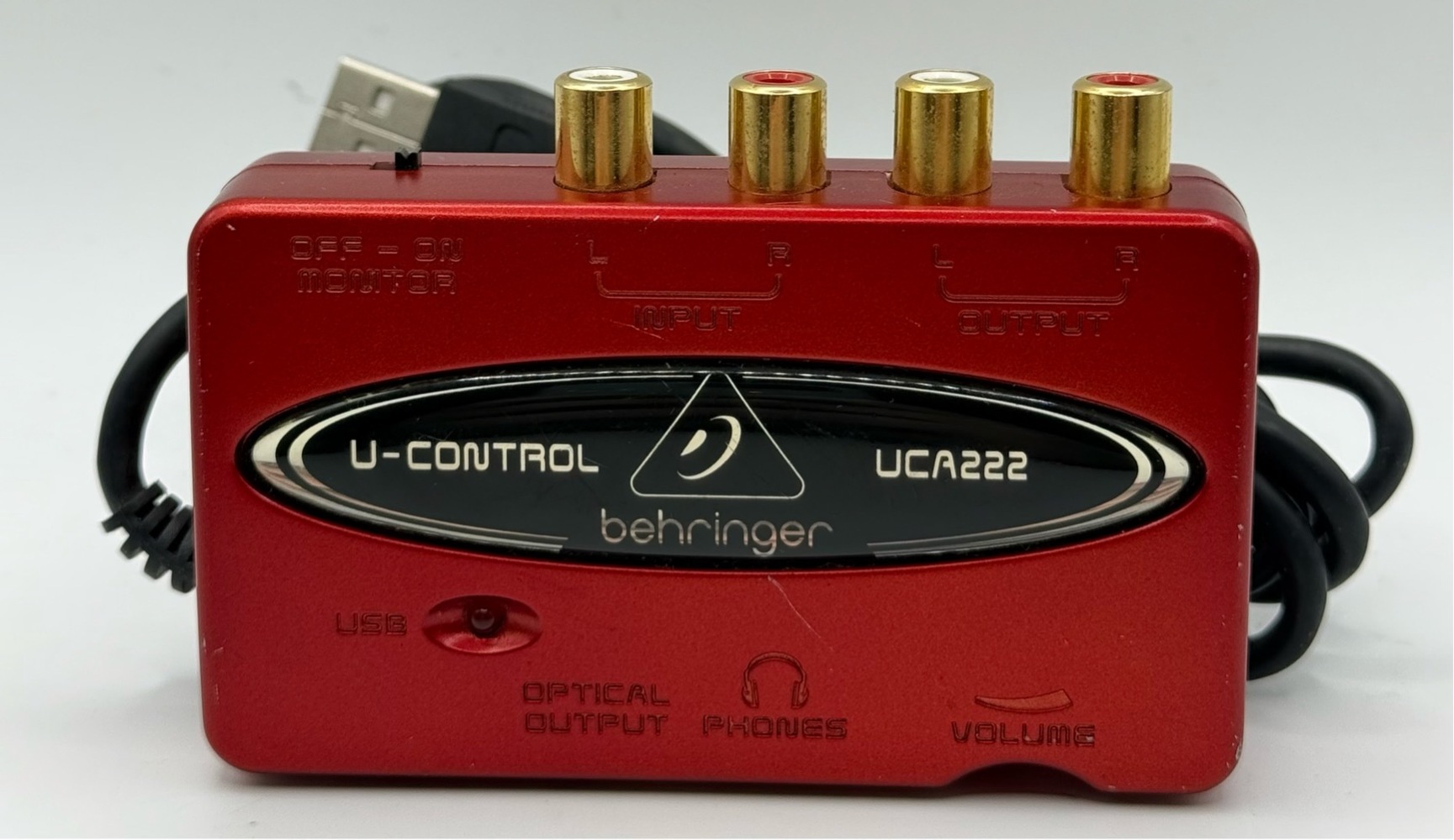 The Behringer UCA222 is a compact USB audio interface that lets you connect analog audio gear (like mixers, keyboards, or other line-level sources) to your computer for recording and playback. It offers 2-in/2-out stereo audio via RCA jacks, a 3.5 mm headphone output with level control, and a TOSLINK optical S/PDIF digital output for digital connections. The interface uses 16-bit/48 kHz converters and is bus-powered via USB, so no separate power supply or drivers are needed — just plug it into a USB port and start recording in your DAW or editing software. It also comes with a bundle of audio software, including Audacity and other tools, to help you get started.