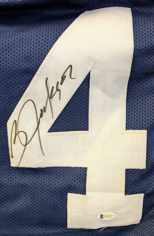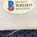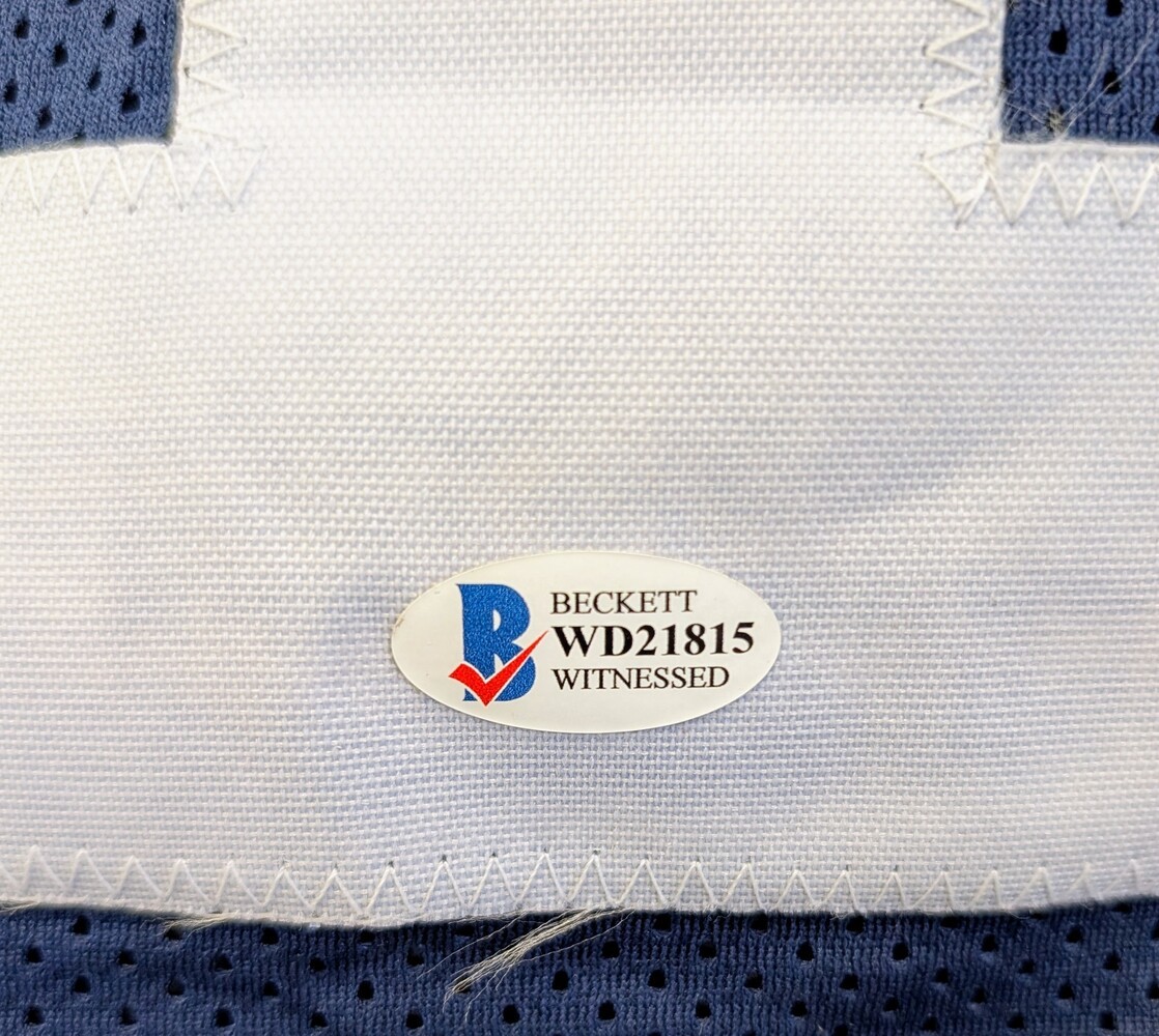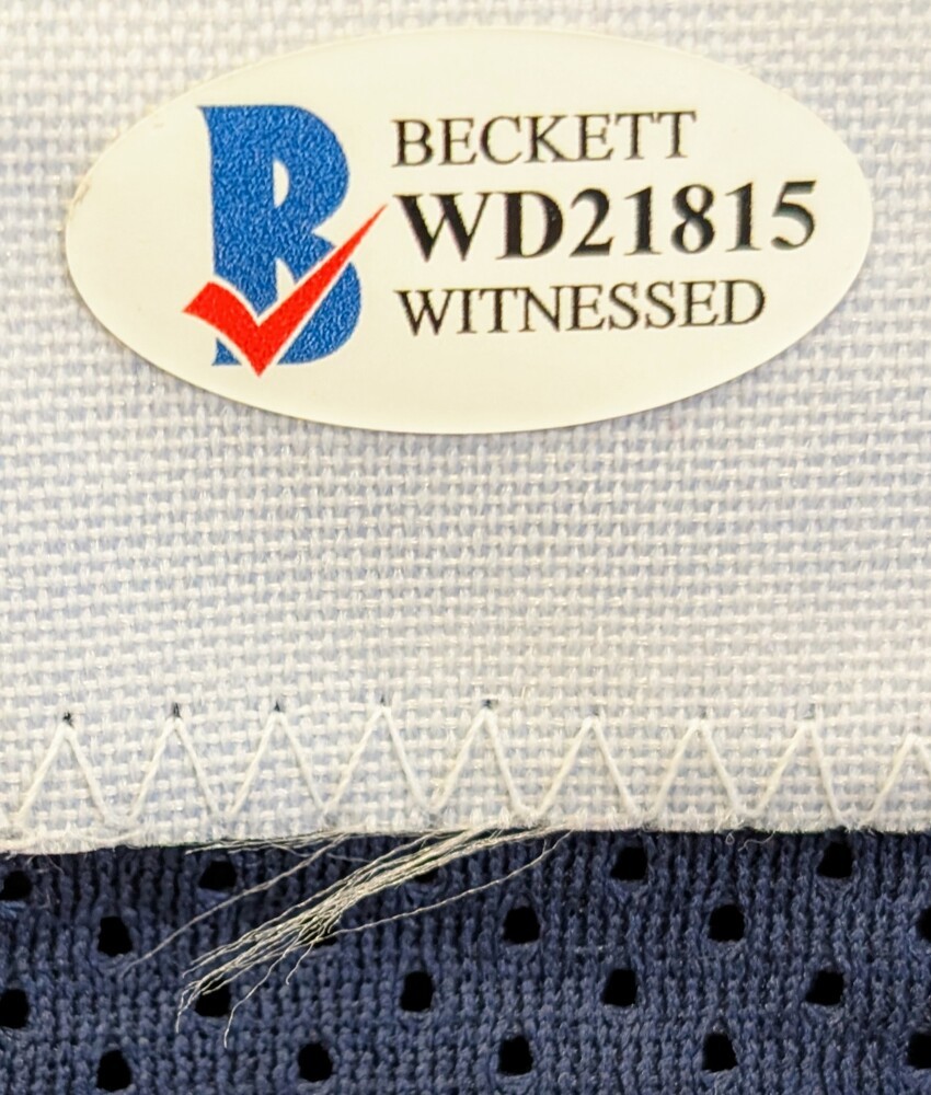 This jersey has a Beckett witness sticker (number WD21815) which can be verified on the Beckett website. A screenshot of the verification from the website is pictured.