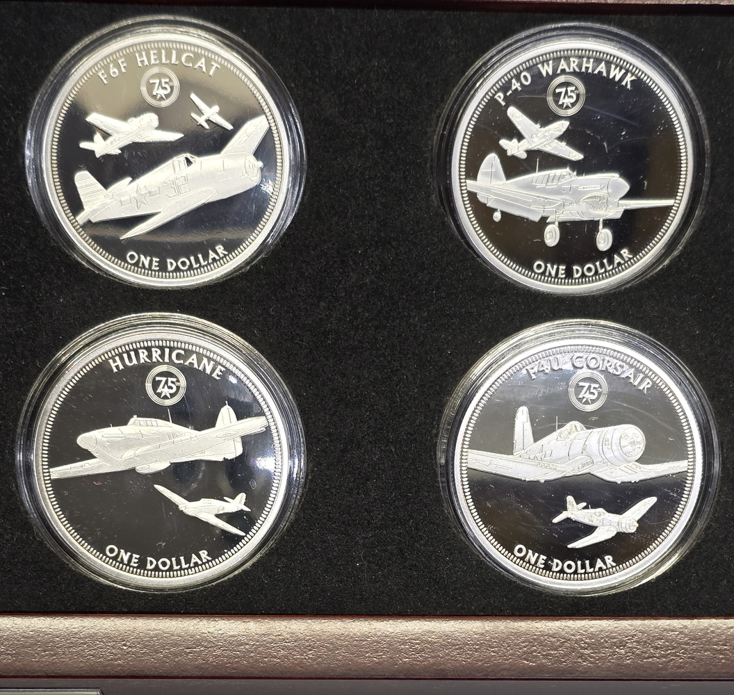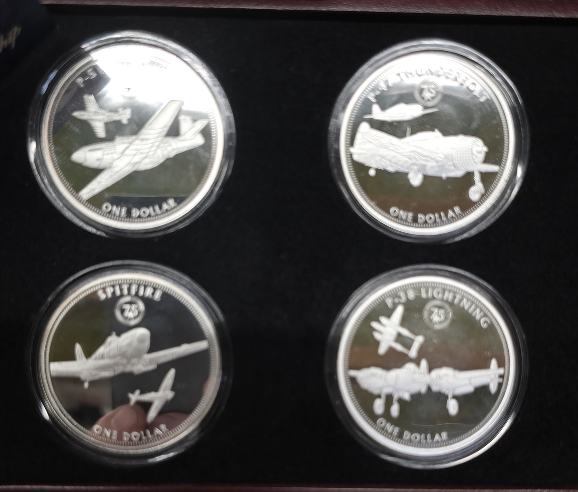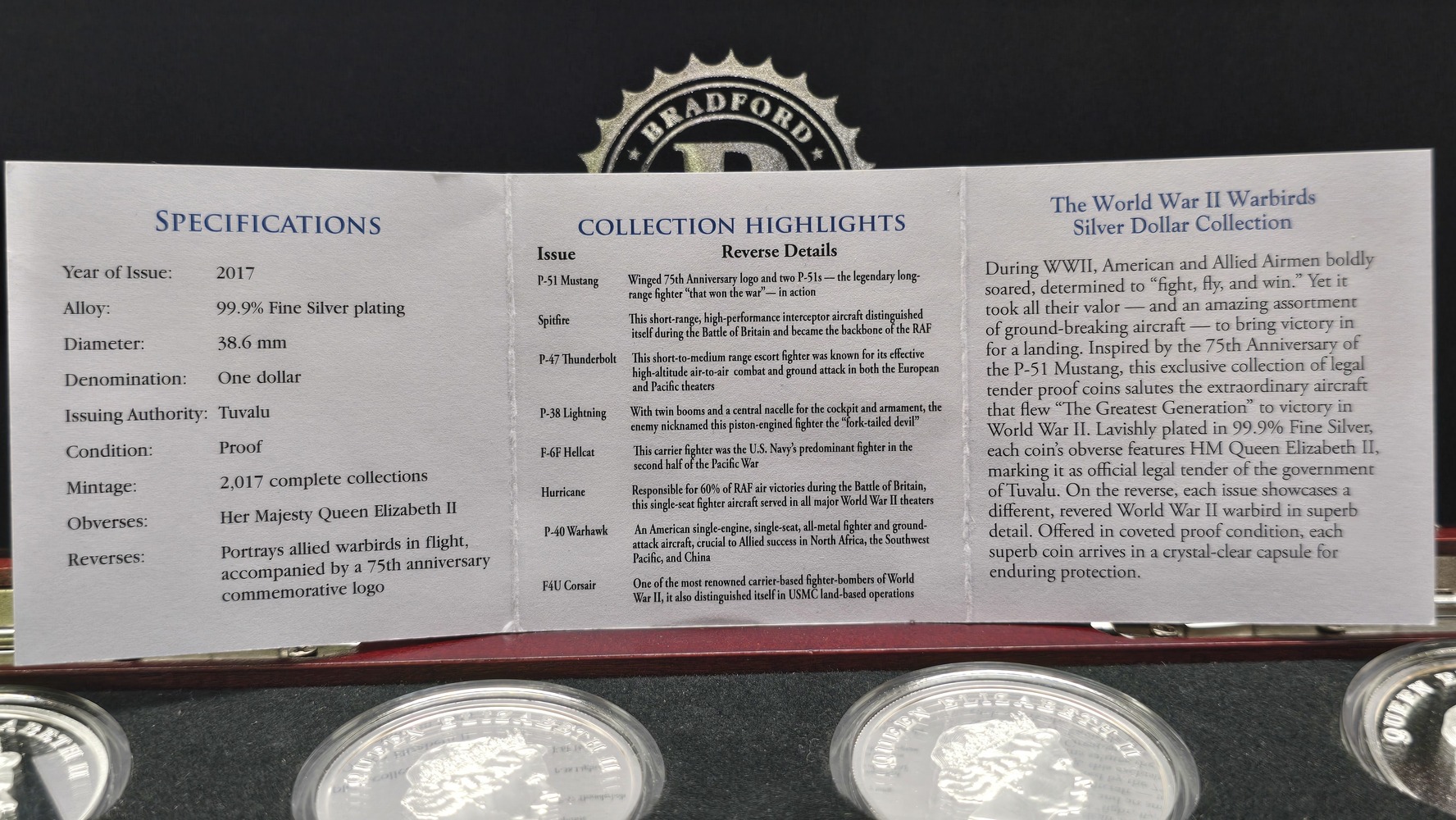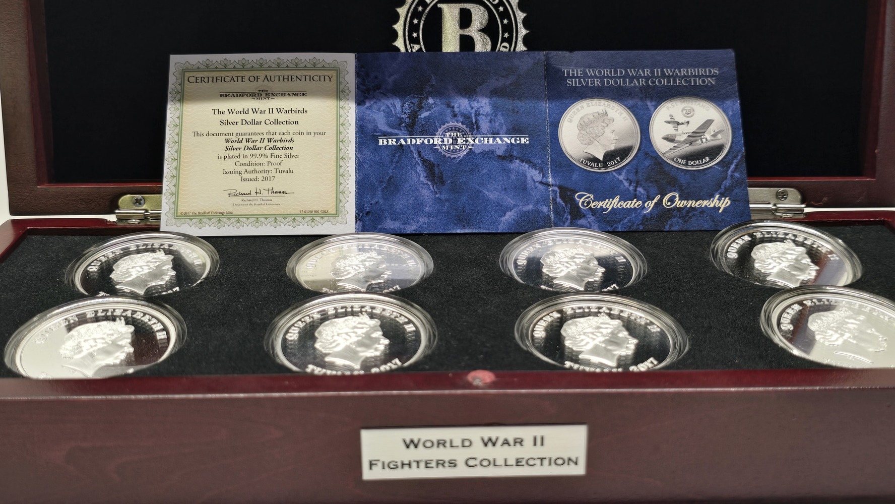 What's Included: Bradford Exchange 8 Coin The Legendary Shipwrecks Gold Crown Collection including: P-51 Mustang, Spitfire, P-47 Thunderbolt, P-38 Lightning, F-6F Hellcat, Hurricane, P-40 Warhawk, F4U Corsair, their capsules, COA and wooden display box.