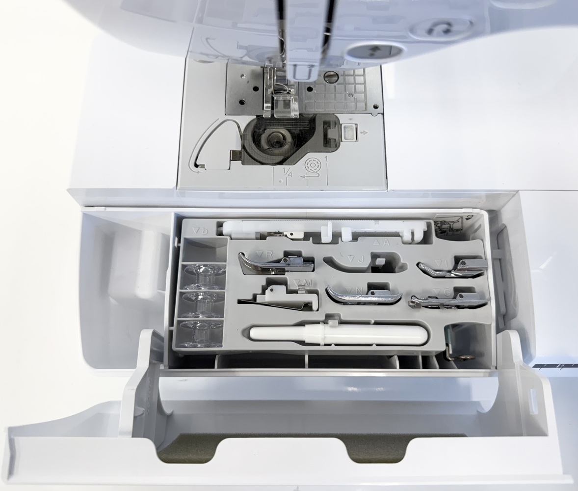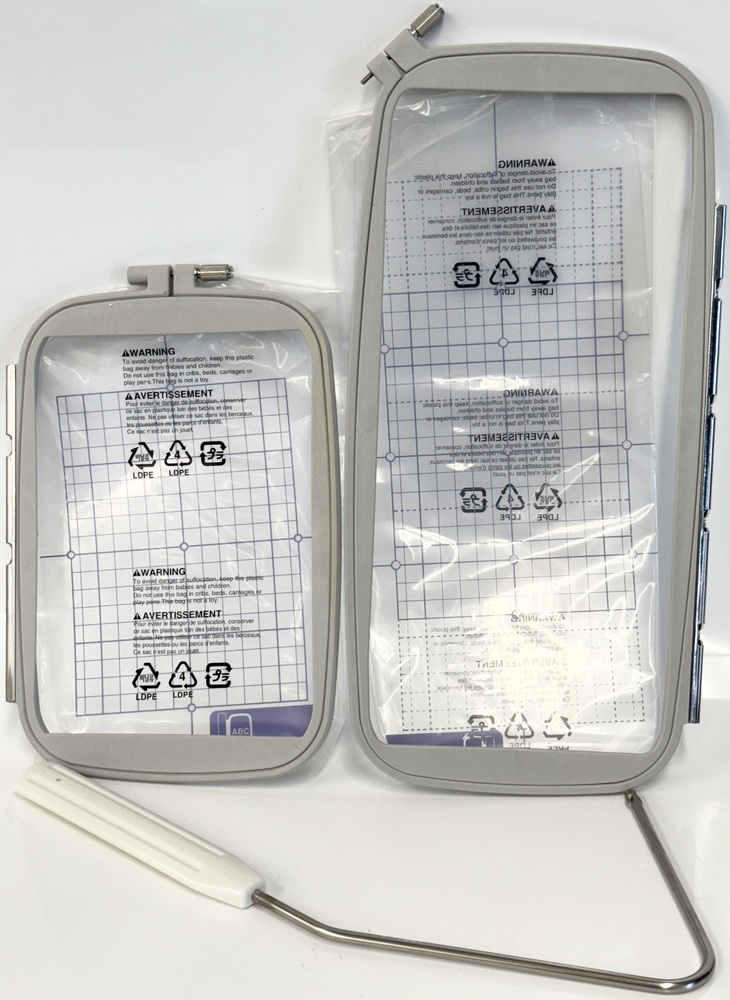 This listing includes the machine, cover, extra feet, plastic bobbins, and 2 embroidery hoops.