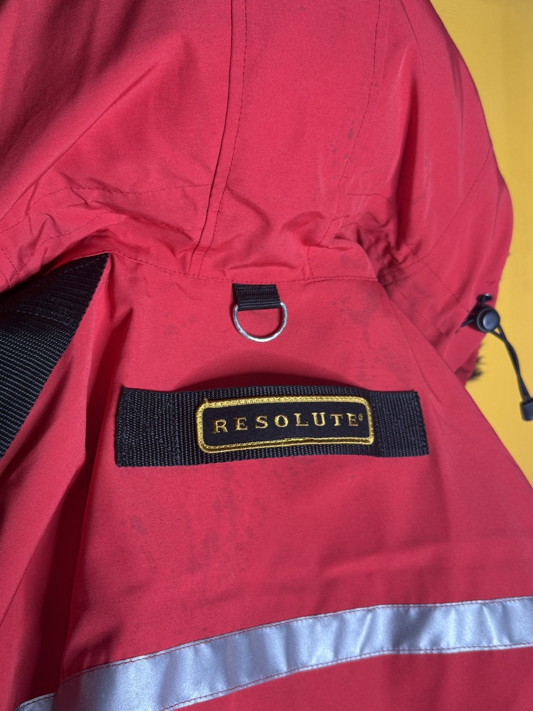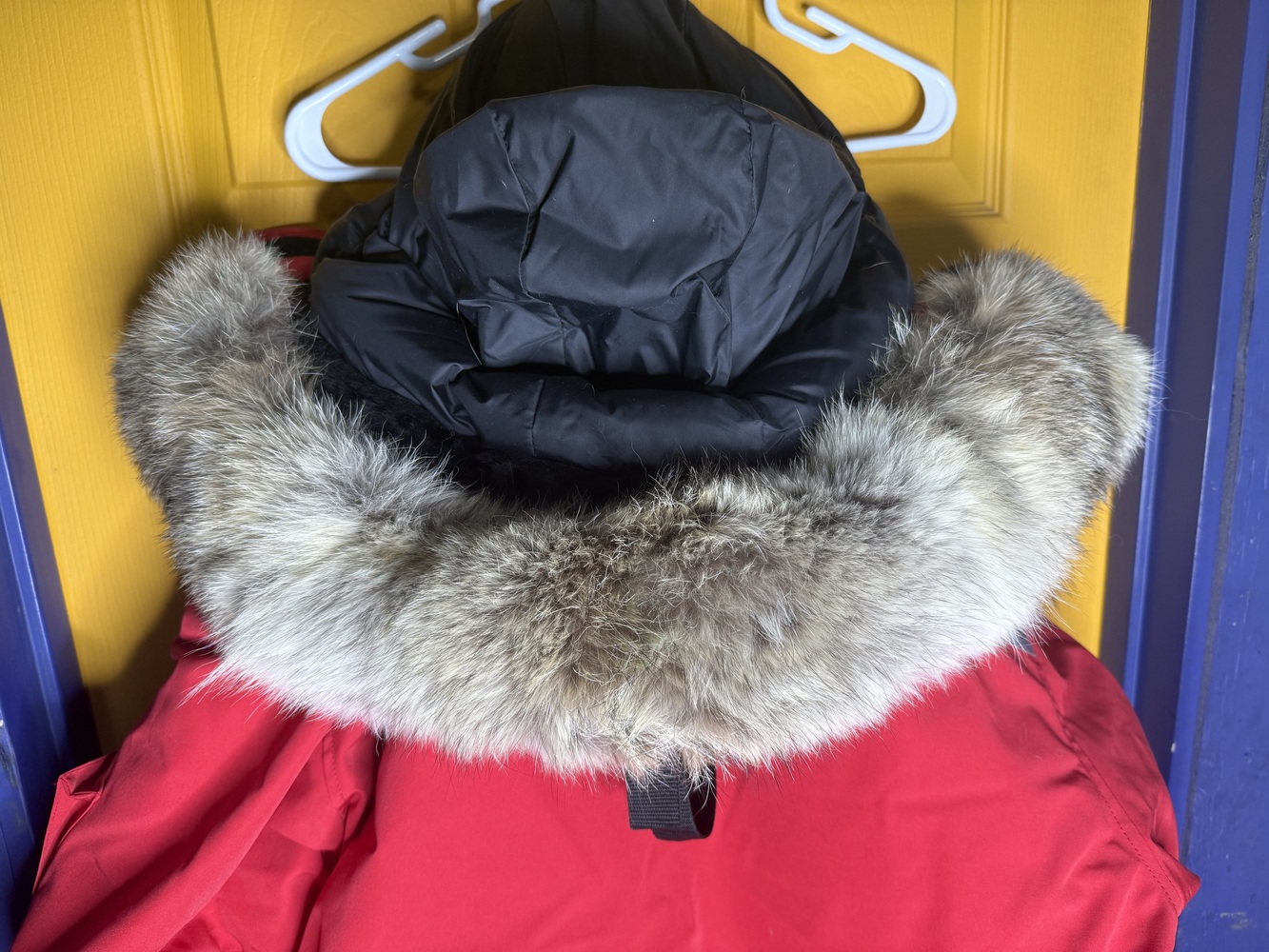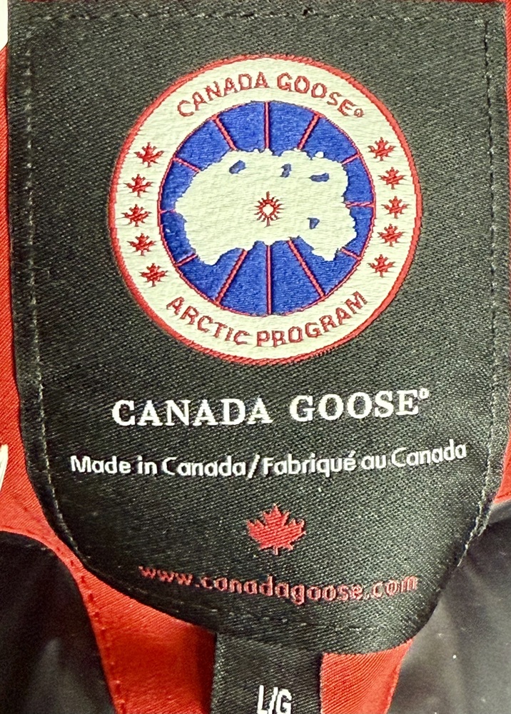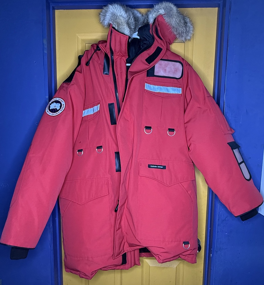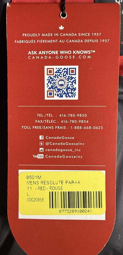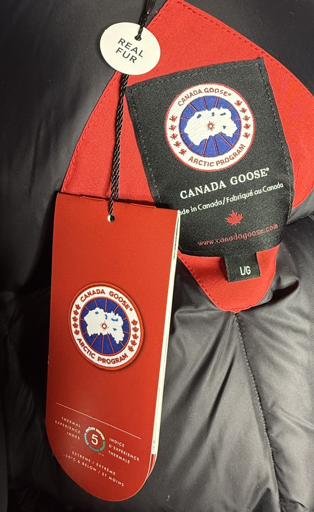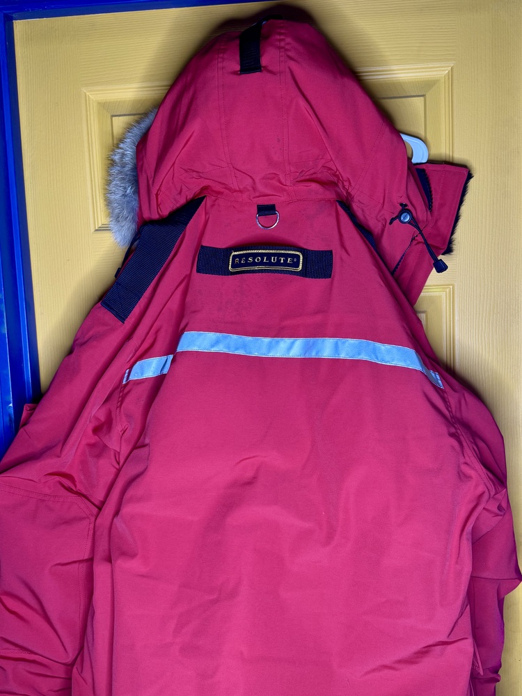 Tagged Canada Goose Men's Resolute Parka. Durable, weather-resistant design. Features high-performance Arctic-Tech fabric, comfortable mid-thigh length, adjustable waist ideal for extreme cold weather. Notable goose down insulation and removable fur-trimmed hood. Stylish and warm.